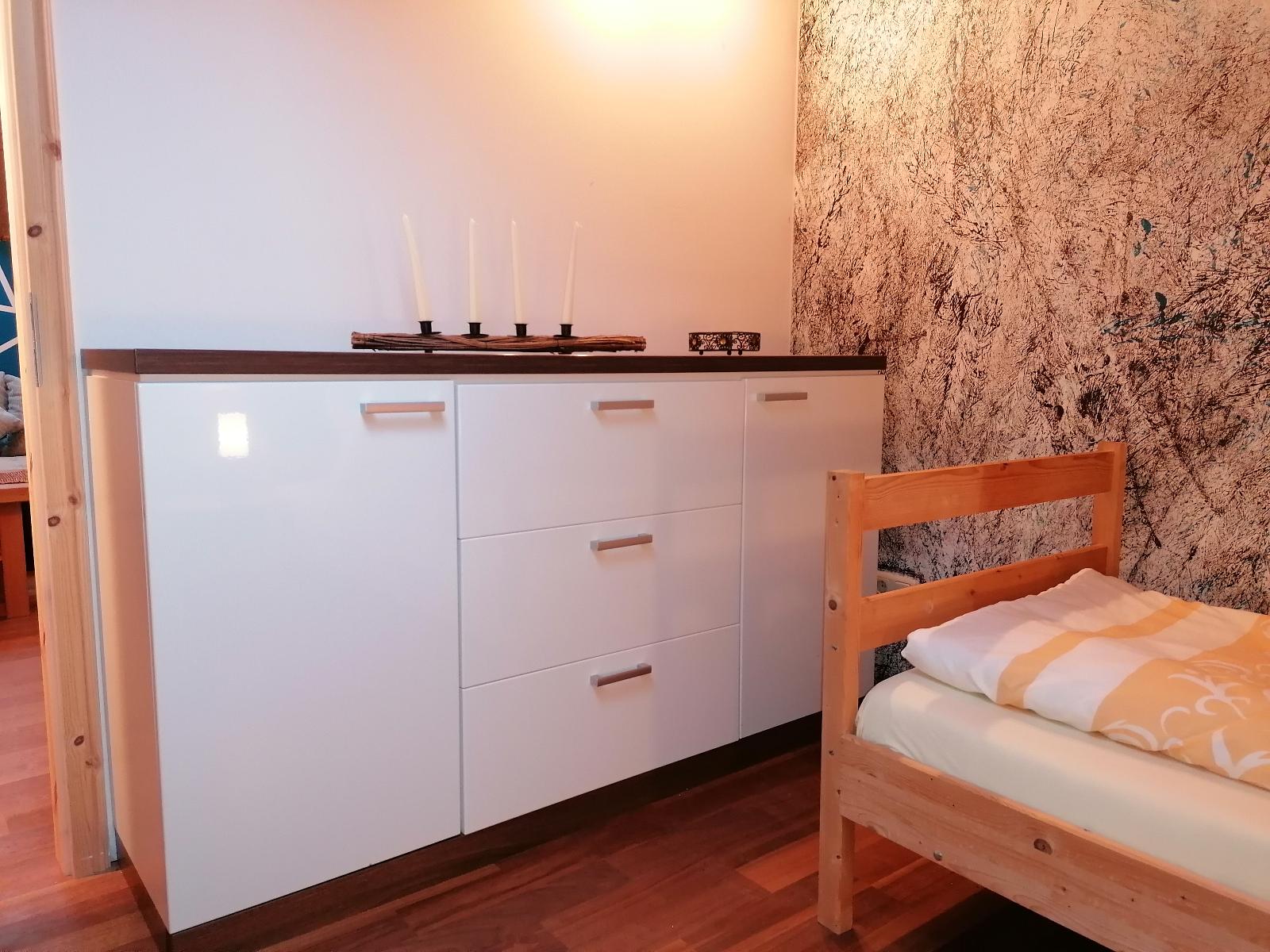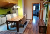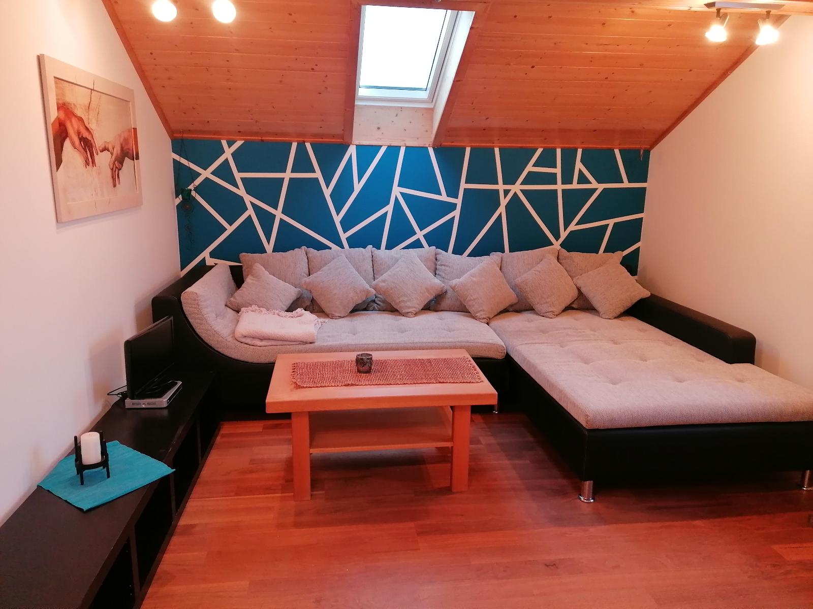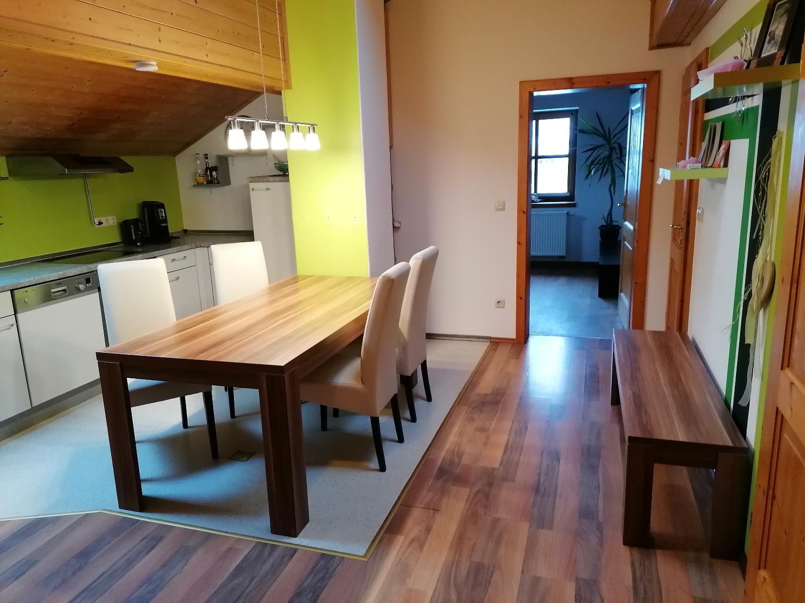 Die Ferienwohnung befindet sich im 2. Stock in ruhiger Lage am Ortsrand und bietet auf 67 qm Platz bis zu 6 Personen. Das gemütliche Wohnzimmer mit Schlafgelegenheit und Flach-TV lädt zum Verweilen ein. Die komplett ausgestattete Küche mit Geschirrspüler, Kühlschrank inkl. Gefrierfach, Herd, Backofen, Wasserkocher, Kaffeemaschine (Pads) lässt keine Wünsche offen. Ein Schlafzimmer verfügt über ein Doppelbett 2 x 2 m. Ein Schlafzimmer ist mit 2 Einzelbetten, die auch zusammengeschoben werden können ausgestattet. Kleiderschränke, eine Kommode, eine Waschmaschine und ein Wäscheständer sind vorhanden. Im Sommer kann man entspannte Abende bei unserer Grill- und Feuerstelle im Garten verbringen. Auch eine Aussensauna kann genutzt werden. Das WLAN und den Parkplatz vor dem Haus können kostenfrei genutzt werden. Kleine Haustiere sind auf Anfrage erlaubt.