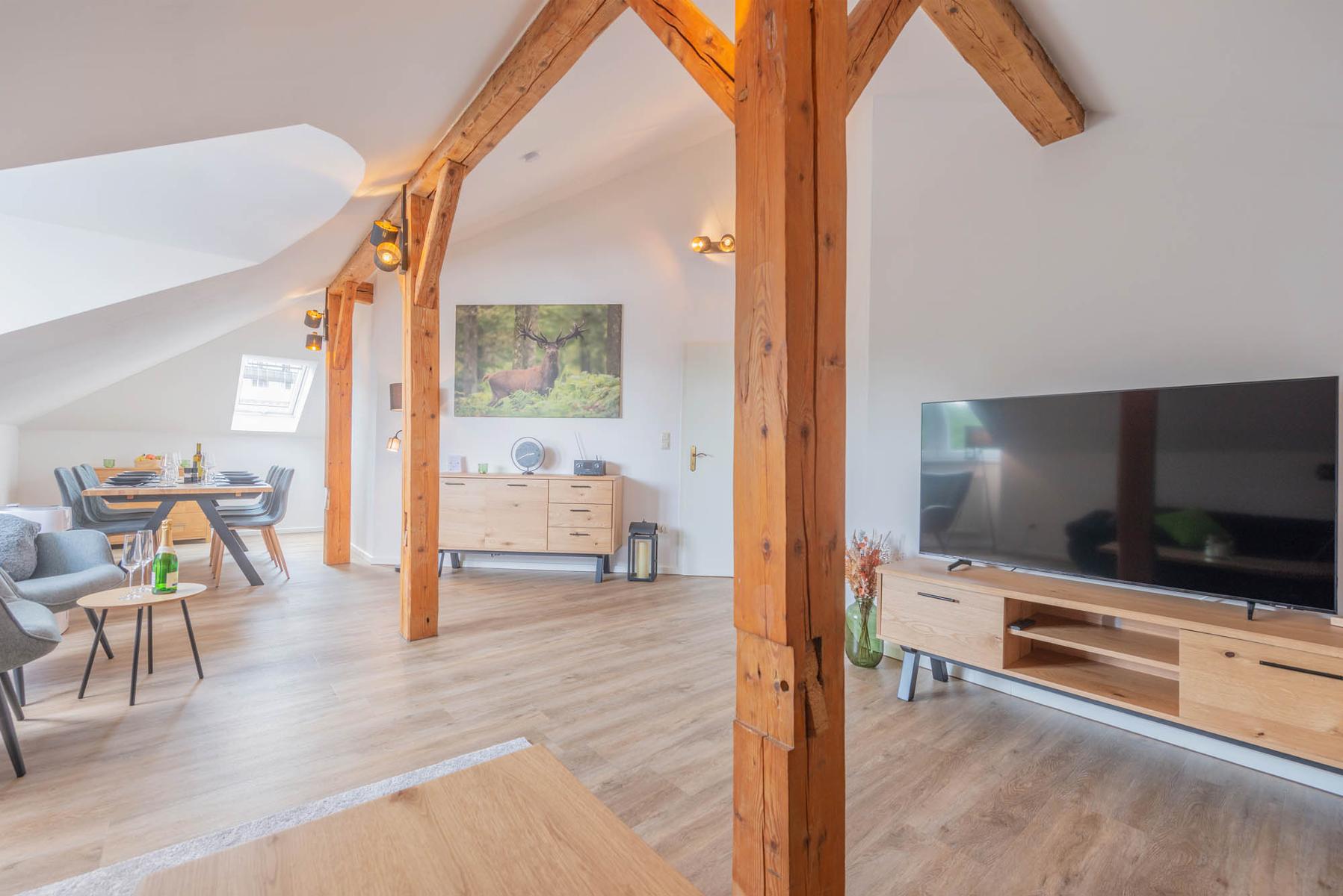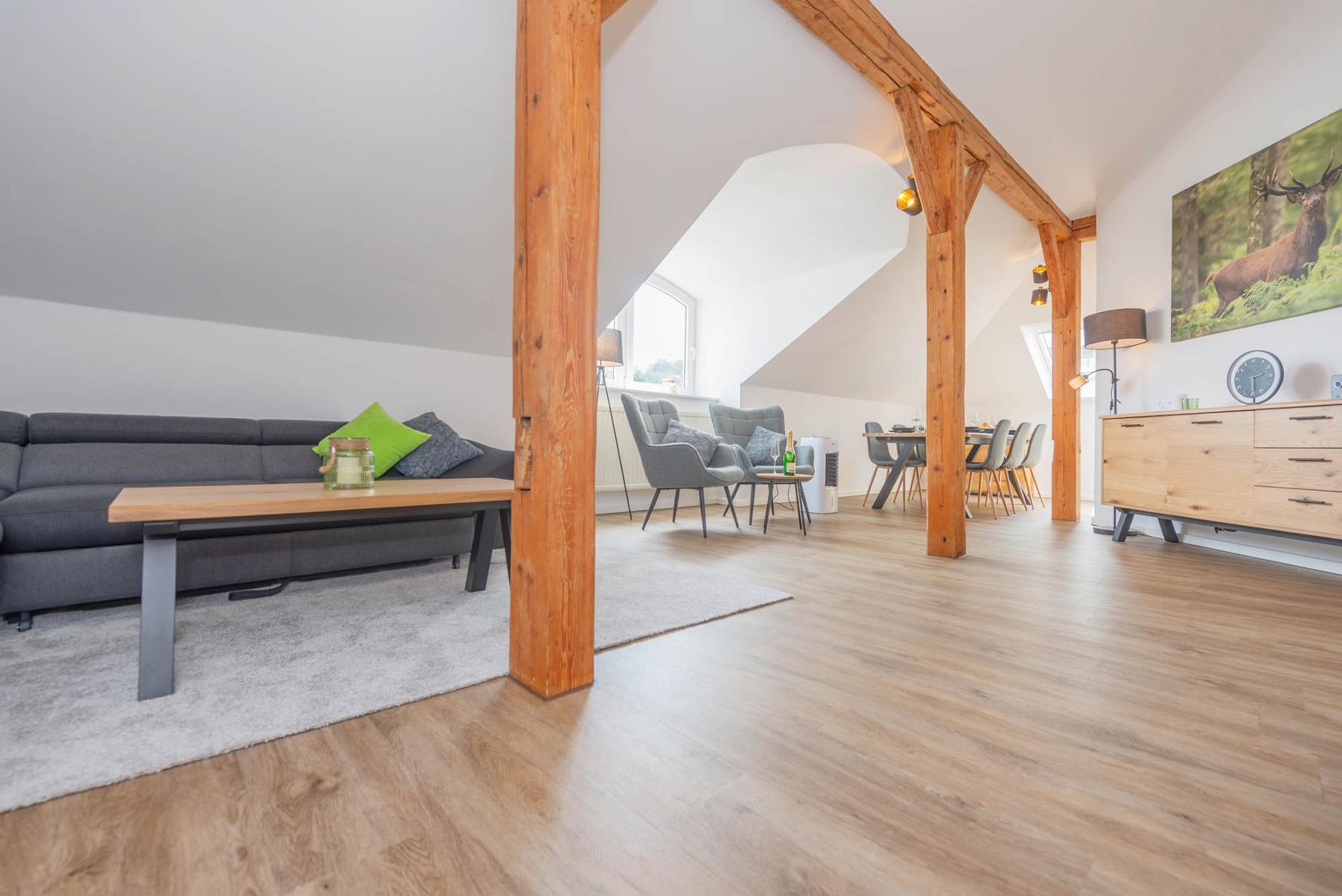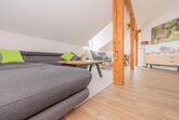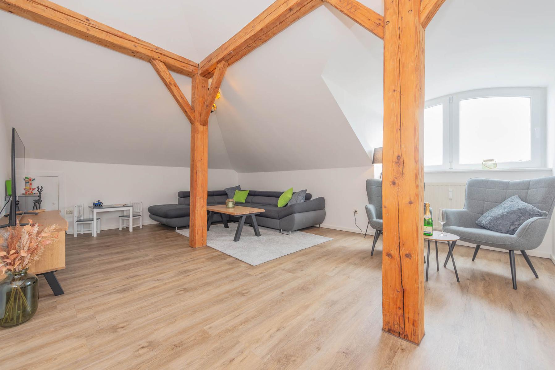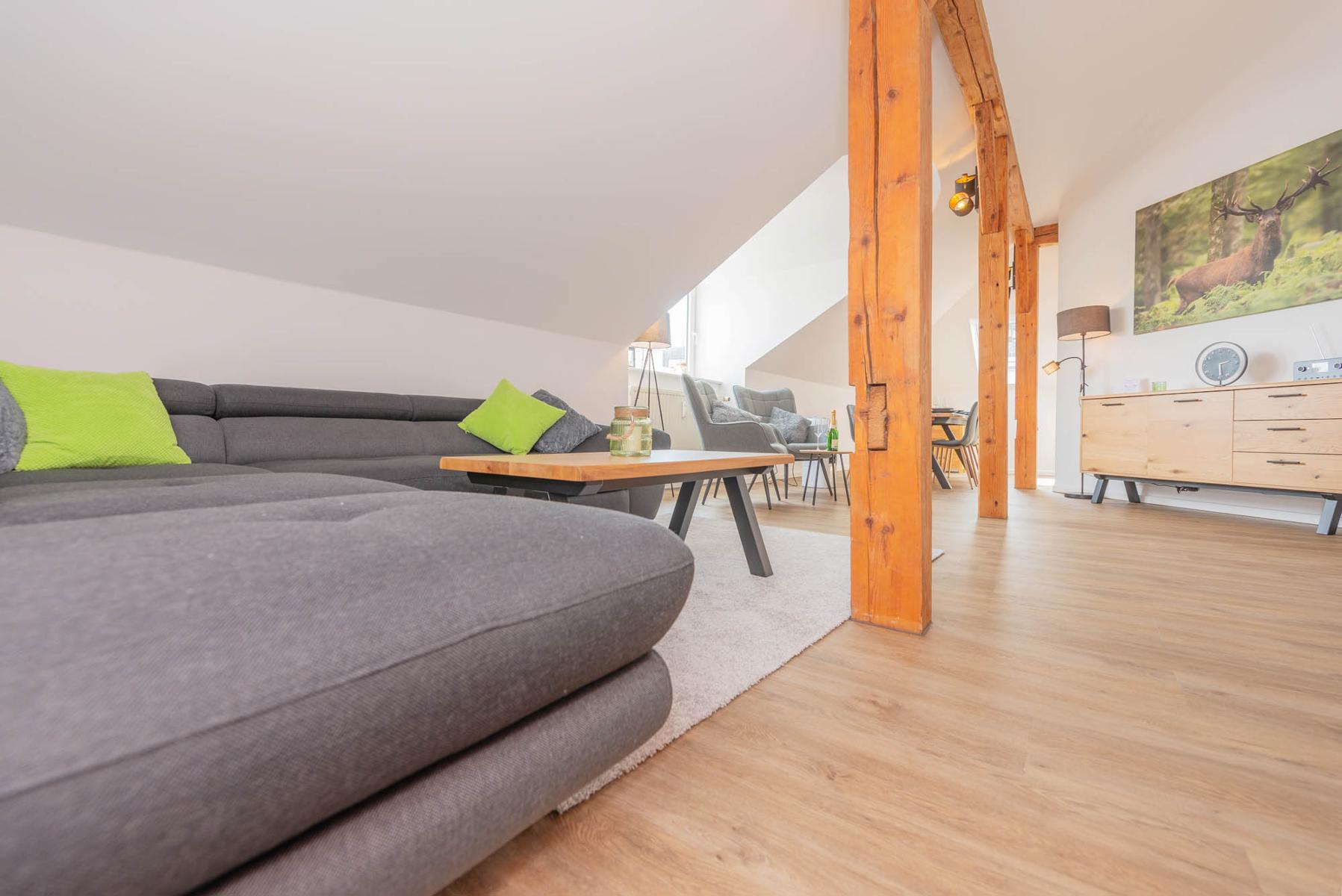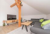 Unsere neue, modern eingerichtete, Dachgeschoss-Ferienwohnung mit ca. 100 m² im 2. Stock bietet Platz für bis zu 6 Personen. Das gemütliche Wohnzimmer mit Schlafsofa (ausziehbar auf 130x197) und Flachbild-TV sowie Internetradio lädt zum Verweilen ein.
