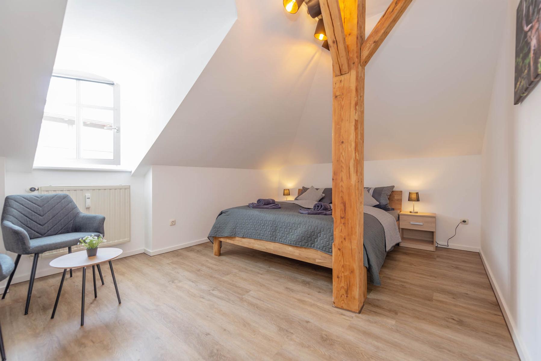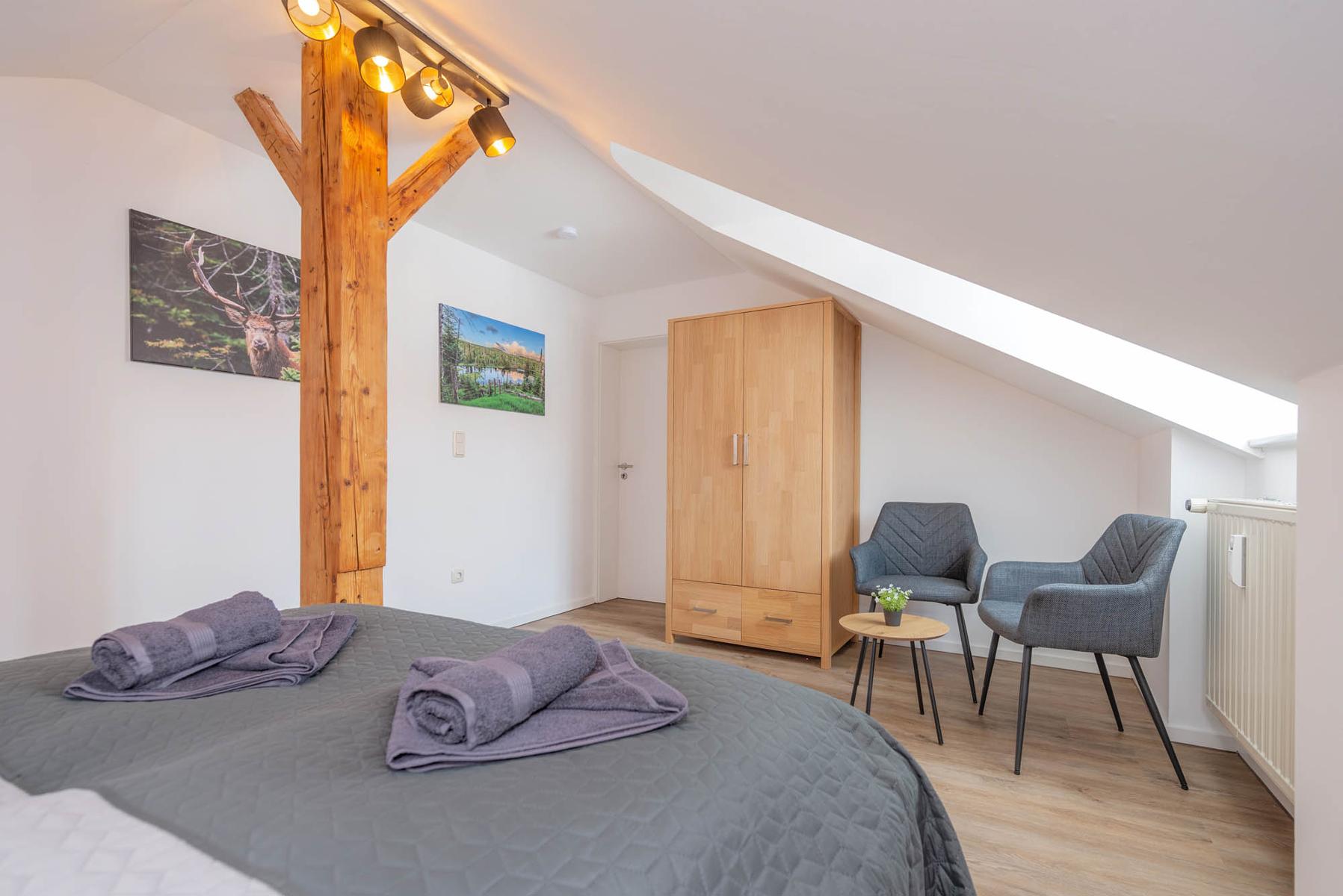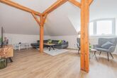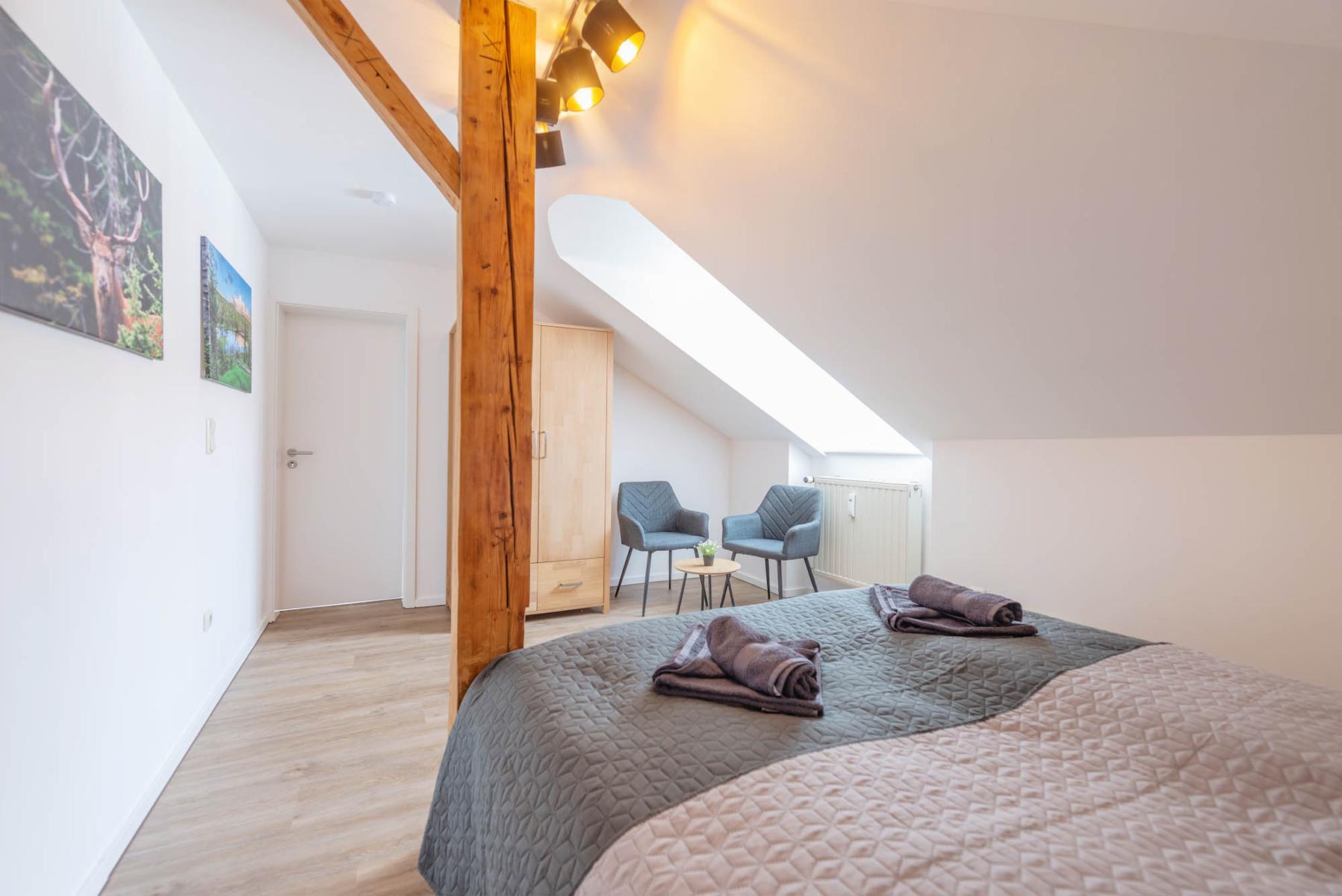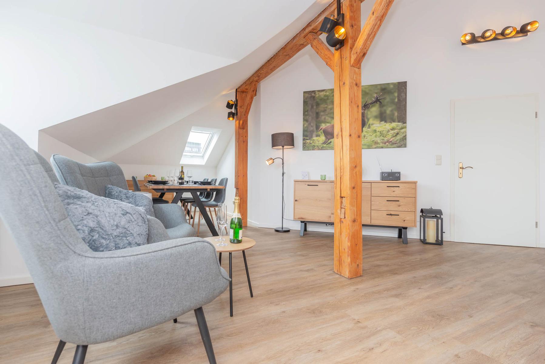 Unsere neue, modern eingerichtete, Dachgeschoss-Ferienwohnung mit ca. 100 m² im 2. Stock bietet Platz für bis zu 6 Personen. Das gemütliche Wohnzimmer mit Schlafsofa (ausziehbar auf 130x197) und Flachbild-TV sowie Internetradio lädt zum Verweilen ein.