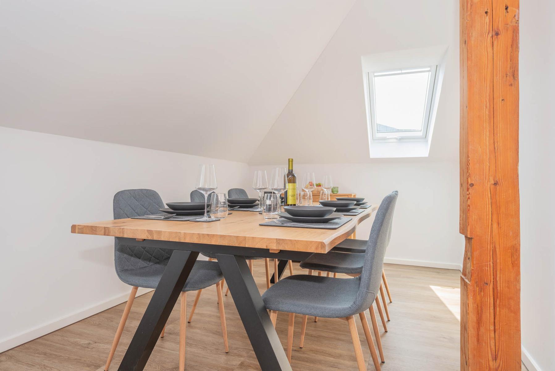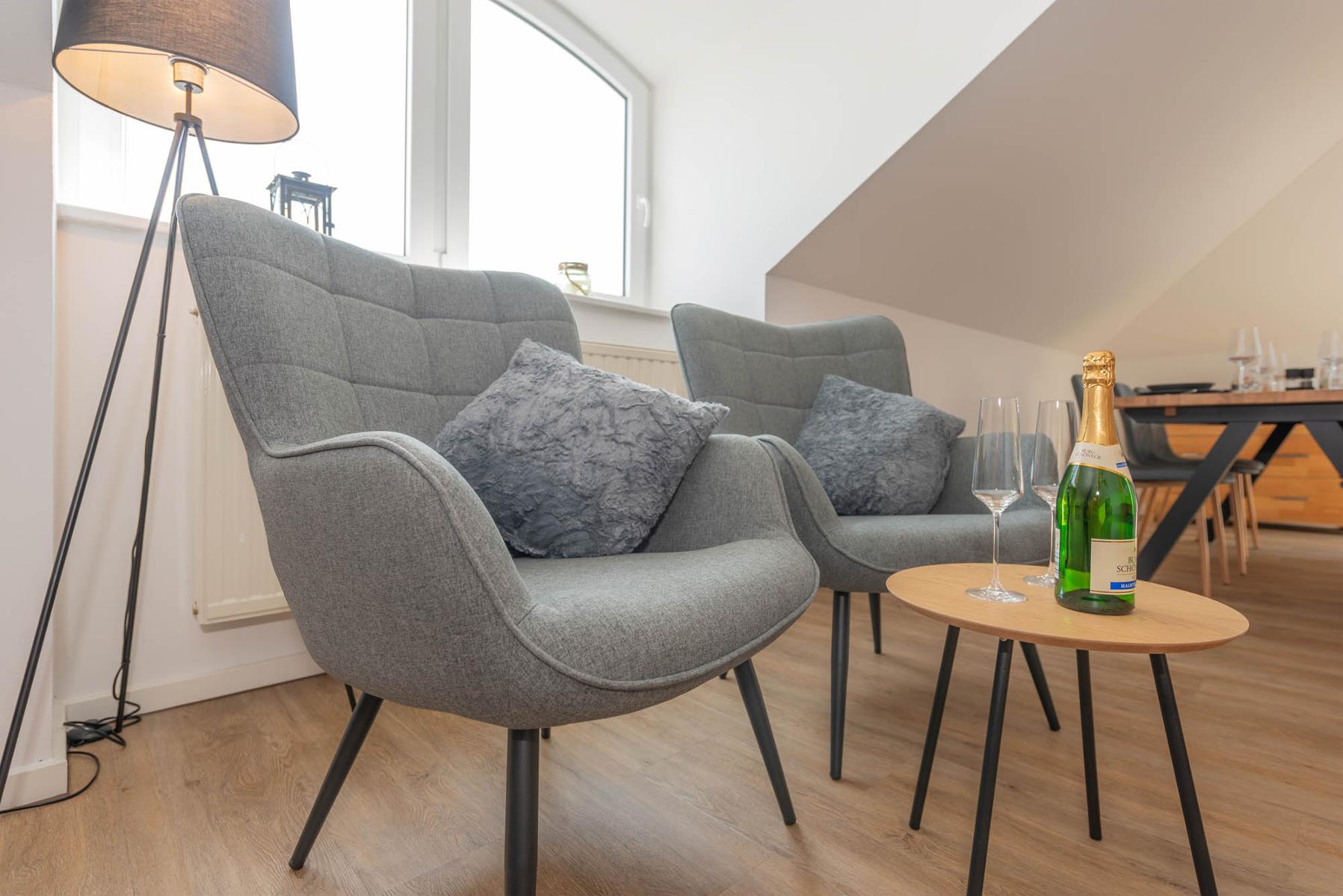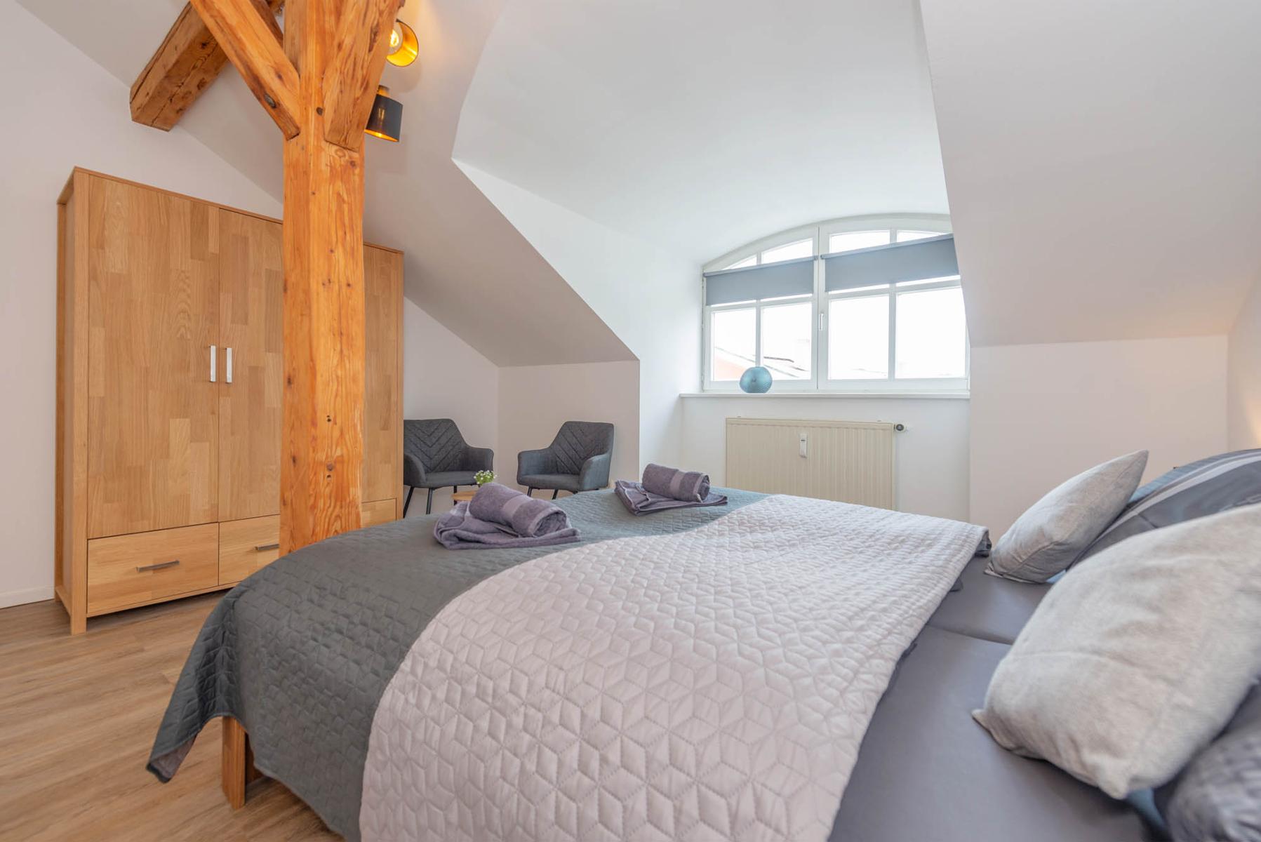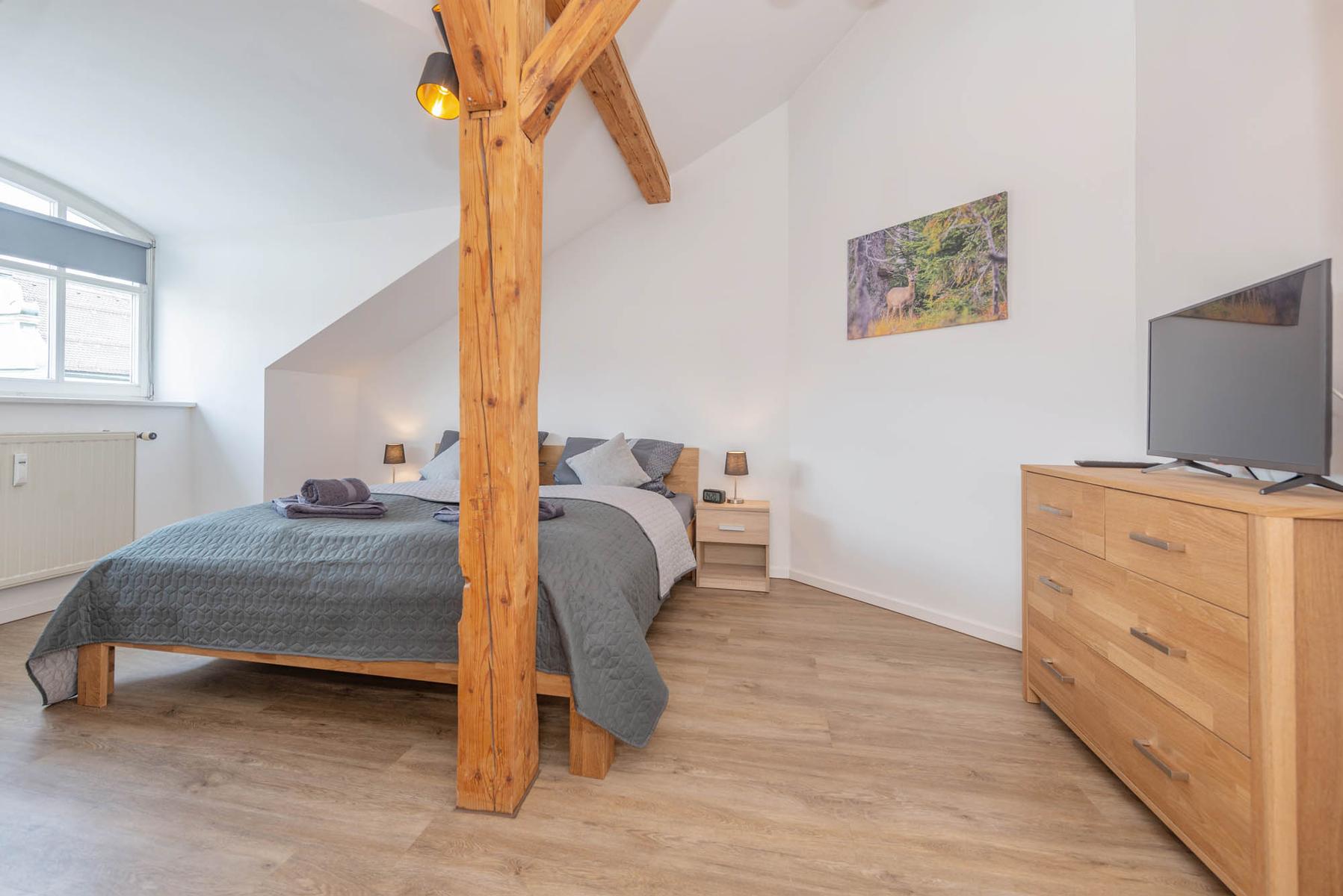 Unsere neue, modern eingerichtete, Dachgeschoss-Ferienwohnung mit ca. 100 m² im 2. Stock bietet Platz für bis zu 6 Personen. Das gemütliche Wohnzimmer mit Schlafsofa (ausziehbar auf 130x197) und Flachbild-TV sowie Internetradio lädt zum Verweilen ein.
