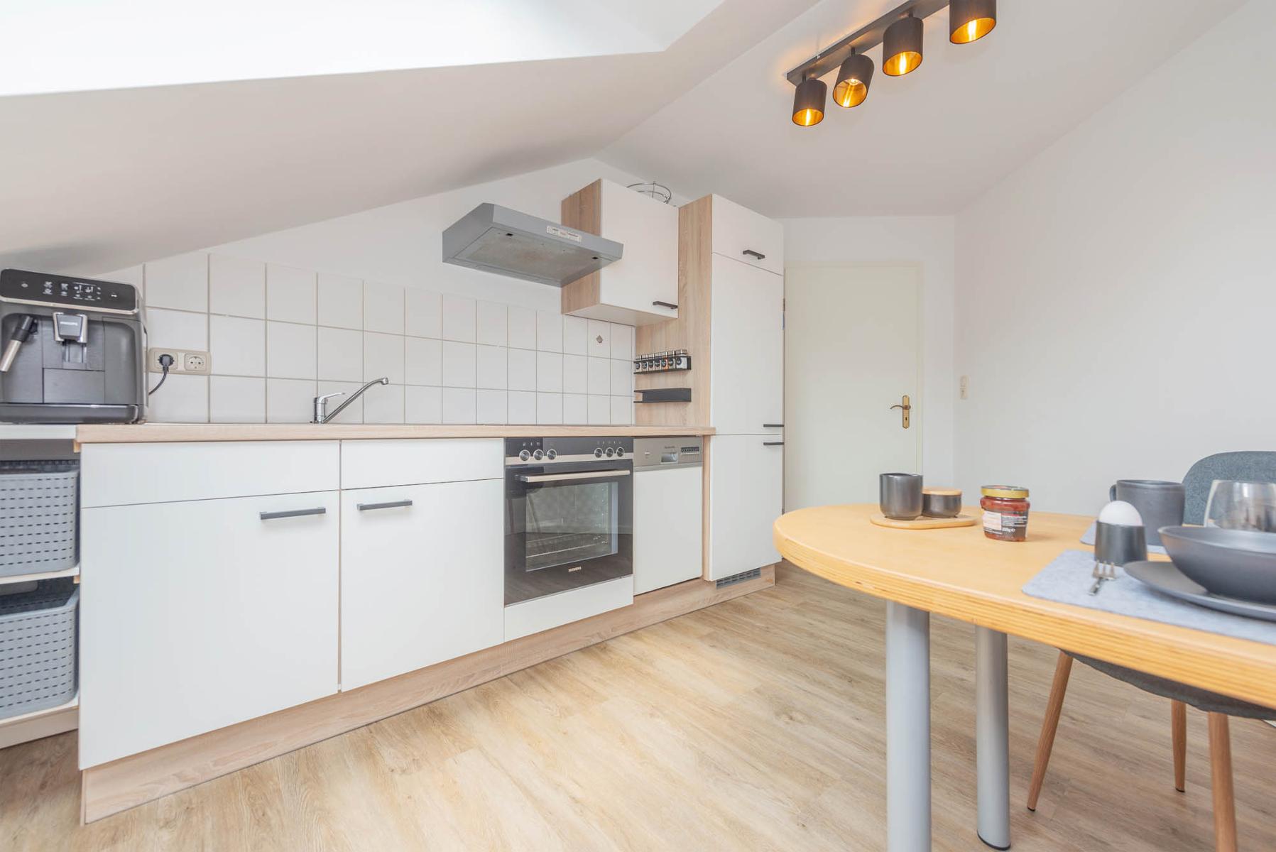 Die komplett ausgestattete Küche mit Geschirrspüler, Kühlschrank, Herd, Backofen, Wasserkocher, Eierkocher, Toaster, Gewürze, Milchaufschäumer und eine Espressobohnen-Kaffeemaschine lässt keine Wünsche offen.