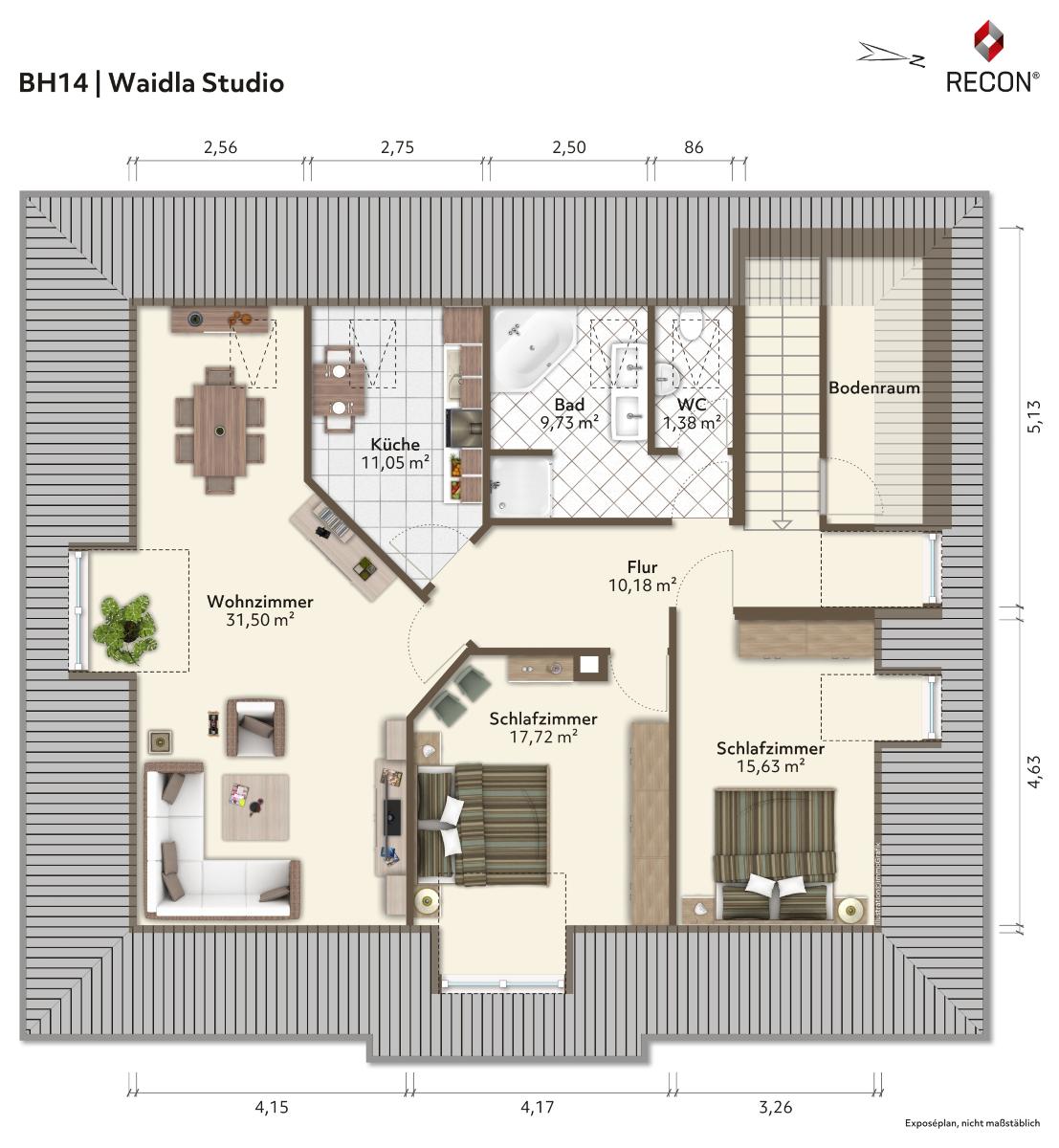 Im 2. Geschoss, das sie über 2 Treppen erreichen, befindet sich das Waidla Studio. Die Ferienwohnung bietet zwei Doppelzimmer sowie eine Schlafcouch im Wohnzimmer. Das helle Badezimmer verfügt über eine Dusche und eine Badewanne.