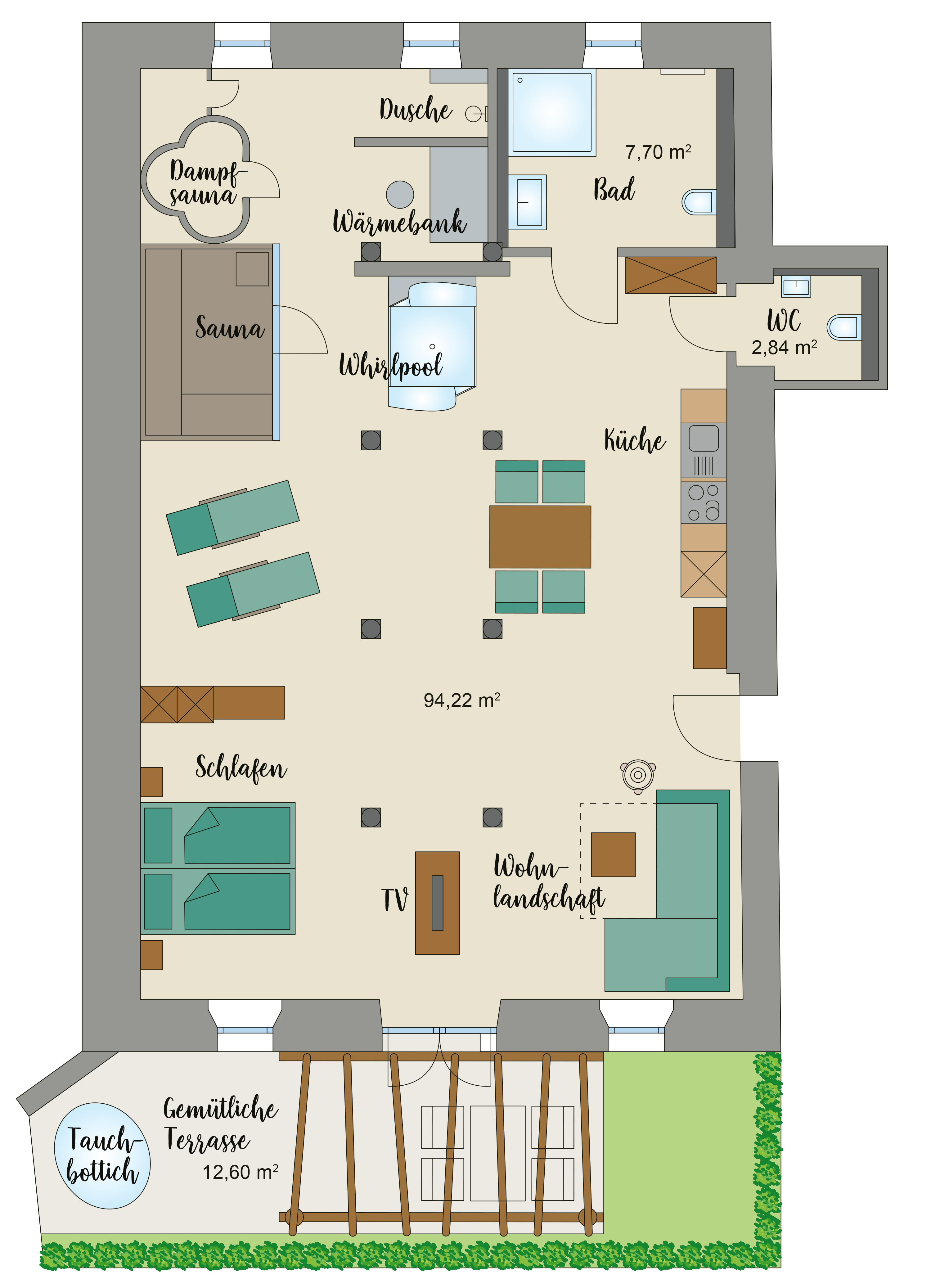 Unsere Ferienapartments und Suiten sind liebevoll eingerichtet und bieten Ihnen alles, was Sie für einen entspannten Aufenthalt benötigen. Hier können Sie sich zurücklehnen und die Seele baumeln lassen. Besonders empfehlenswert ist unsere Privat SPA Suite, die mit einer eigenen Sauna, Dampfbad und einem Whirlpool ausgestattet ist. Hier können Sie sich vollkommen entspannen und den Alltag hinter sich lassen.