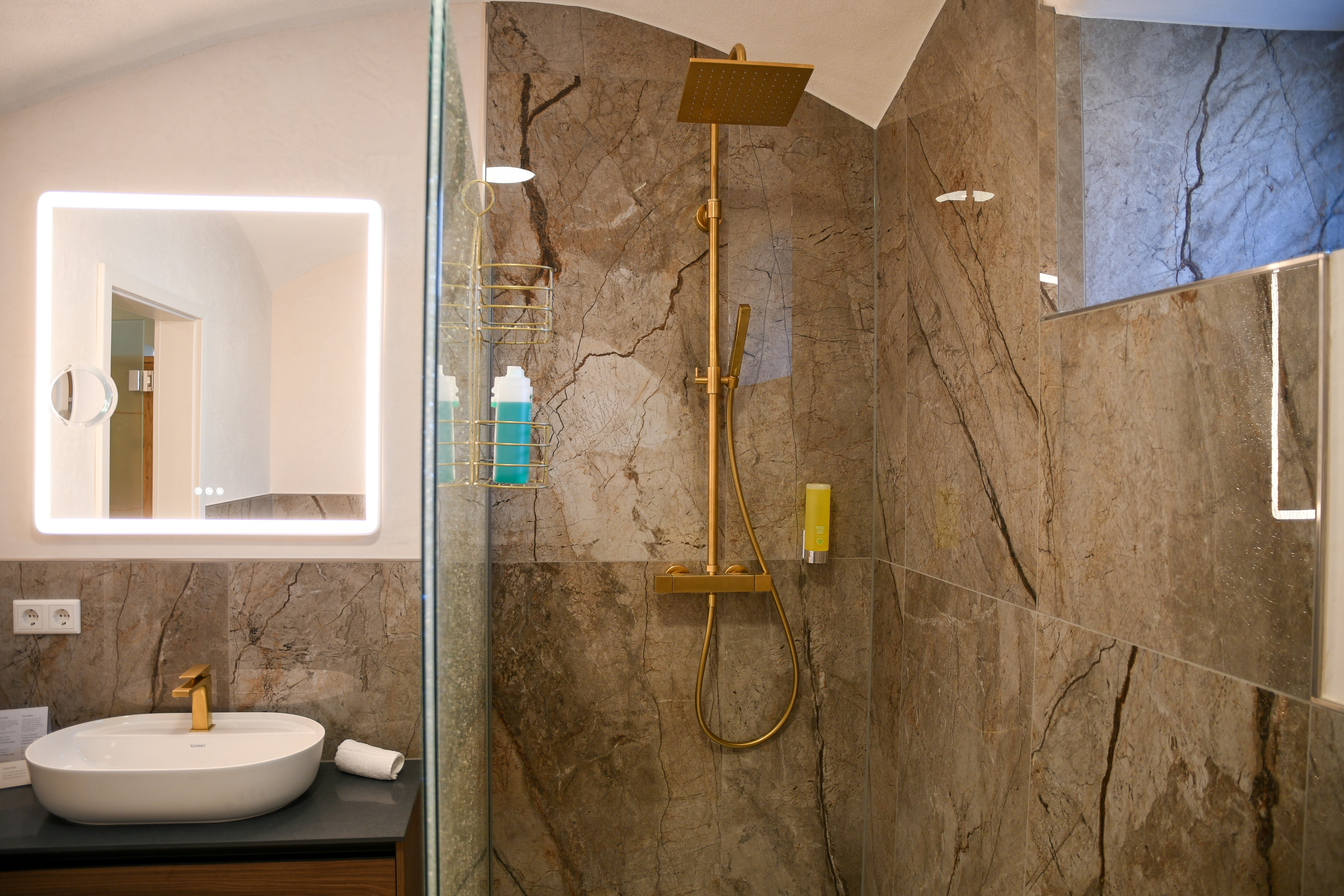Im Badezimmer finden Sie eine große Regenschauerdusche mit goldenen Armaturen,