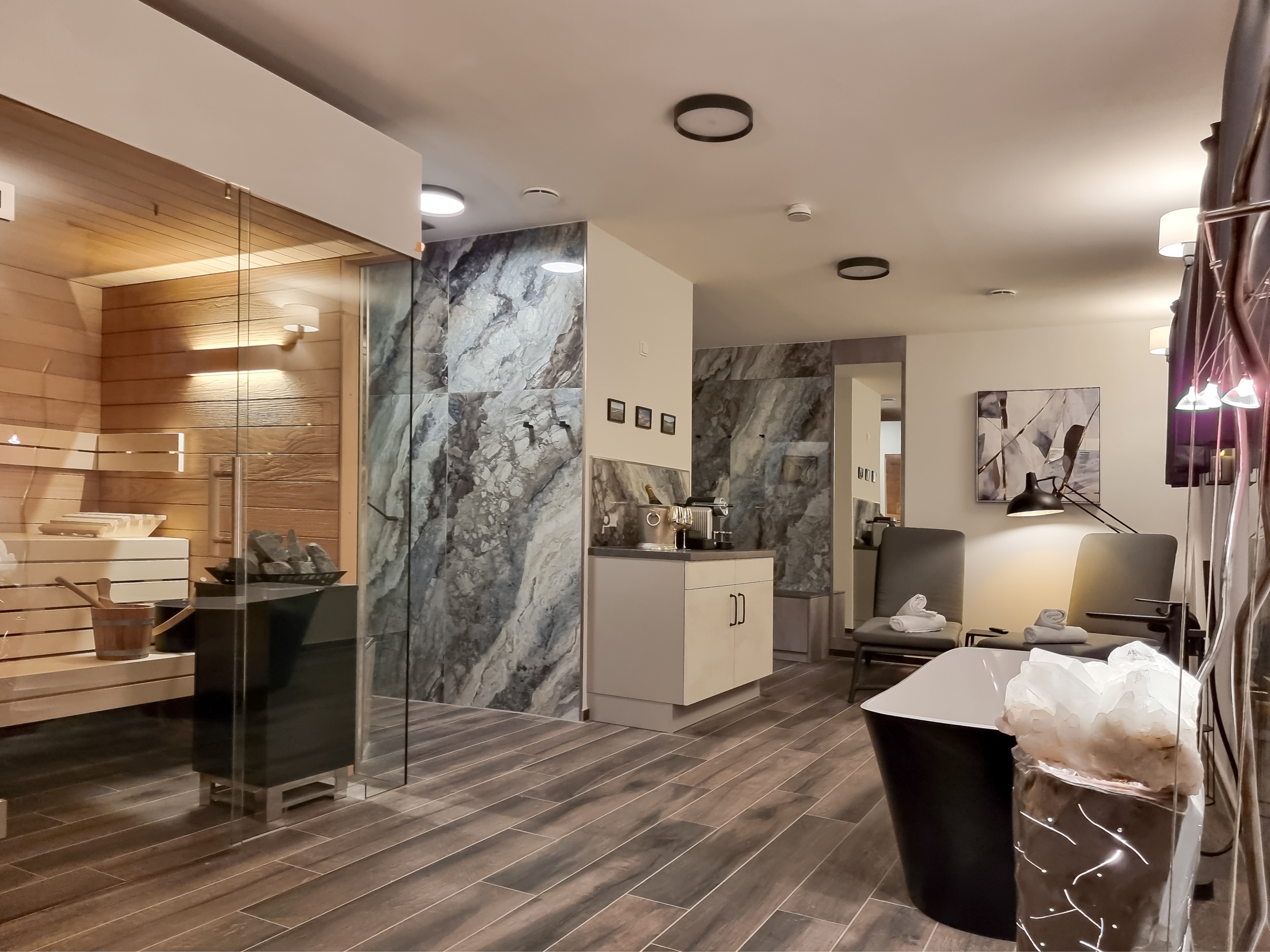 Im Wellnessbereich befindet sich eine weitere tropische Duschanlage mit allen Funktionen die man sich wünschen kann, daneben finden Sie eine Kneipp Sitzbank