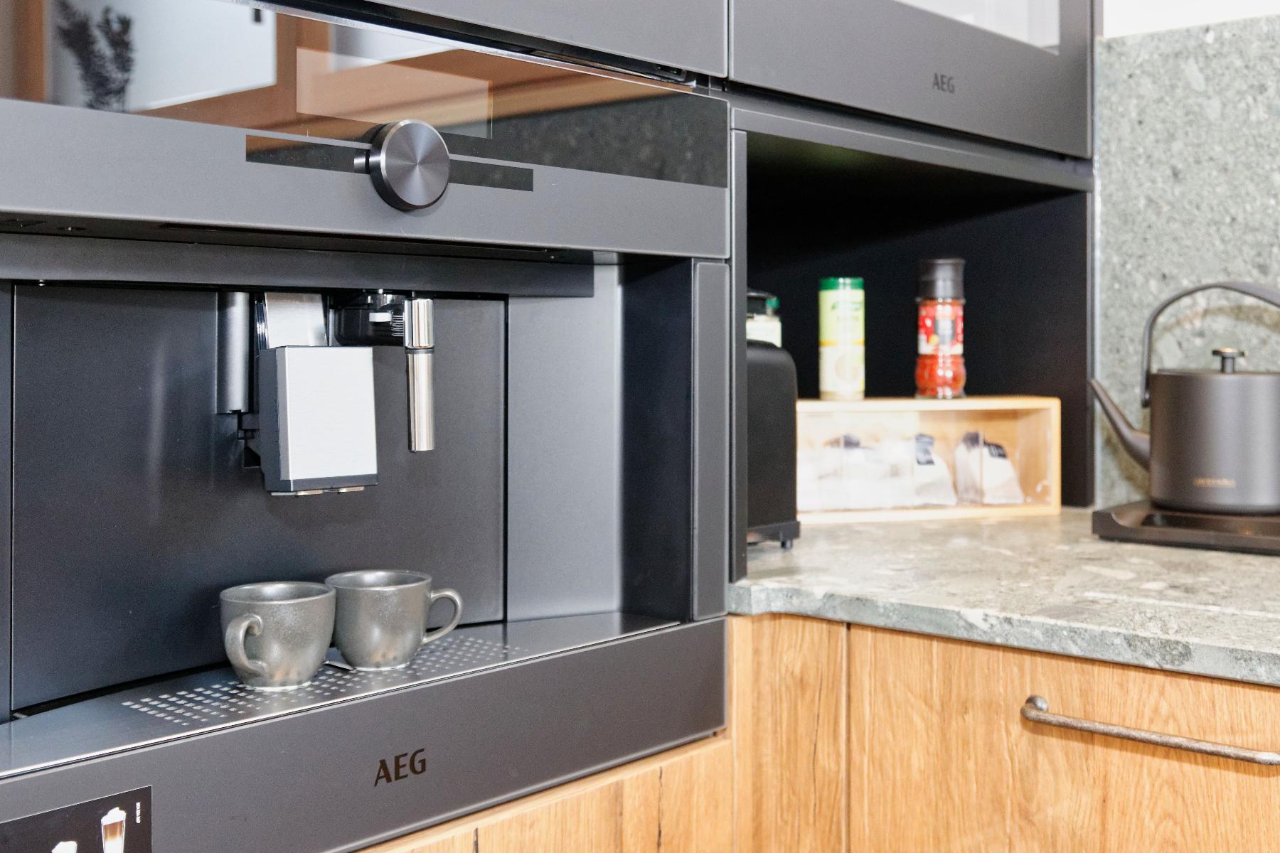 vorhanden. Ein Kaffeevollautomat, Weinkühlschrank, Wasserkocher, Toaster,