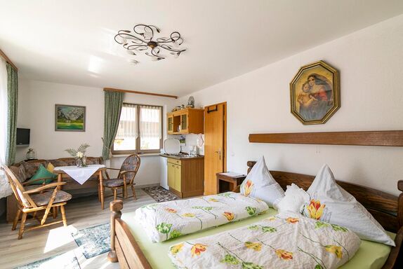 Unser Appartement Ausgestattet mit TV, Balkon, Dusche WC mit Haarföhn, Kühlschrank mit Gefrierfach, Kochecke, ca. 25 qm Wohnfläche und einem freiem Bergblick lässt es keine Wünsche offen.