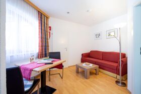 Appartement VI mit ca. 30 m² im Erdgeschoss: voll ausgestattete Wohnküche mit E-Herd, Kühlschrank, Geschirrspüler, Essecke uvm., Couch, Kabel/TV, 1 Schlafzimmer mit einem Doppelbett, 1 Badezimmer mit Dusche/WC.