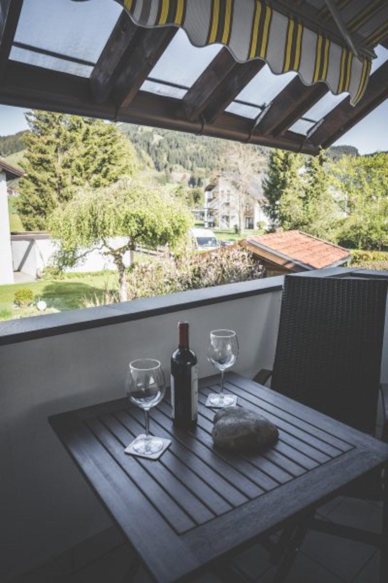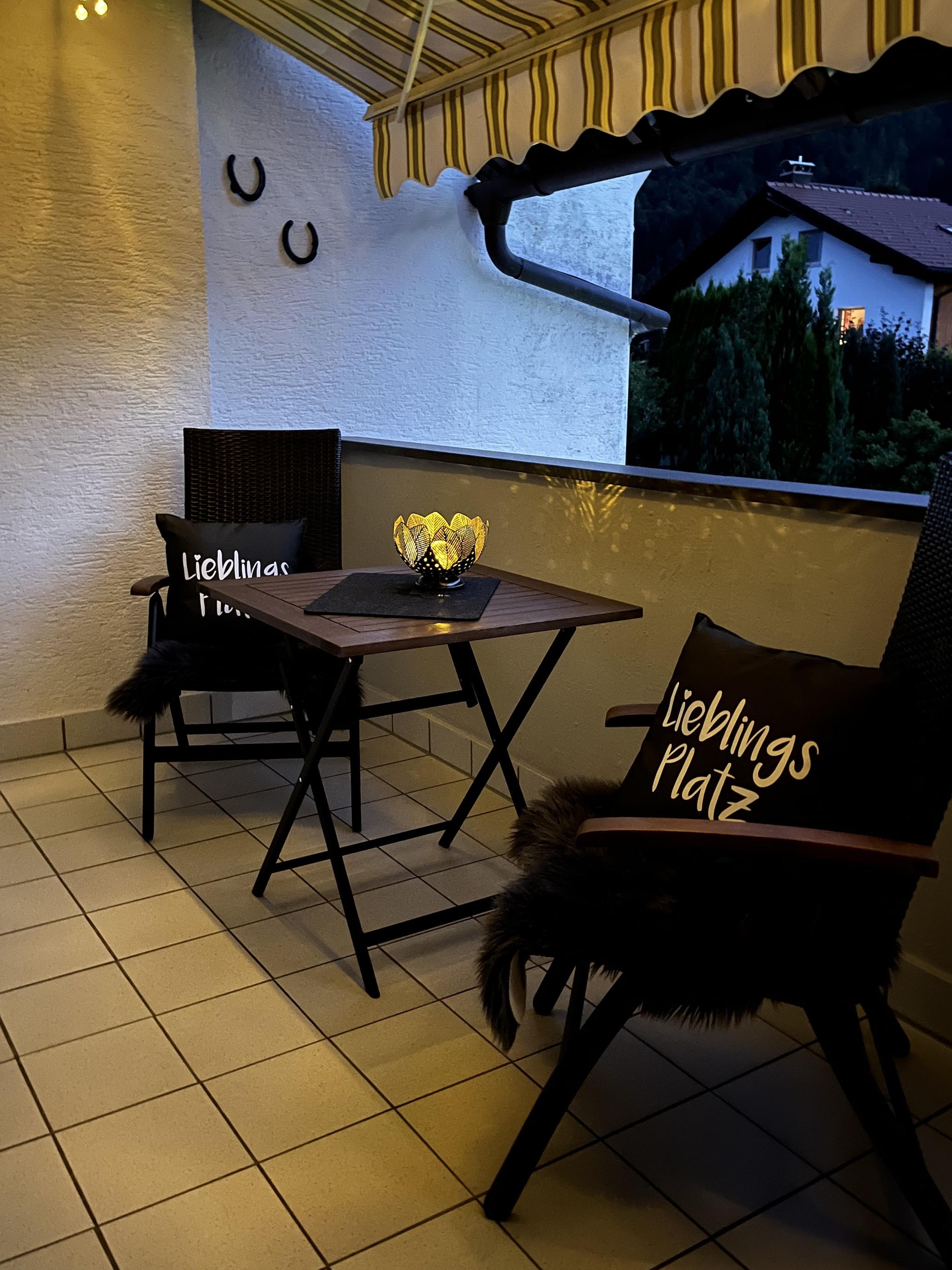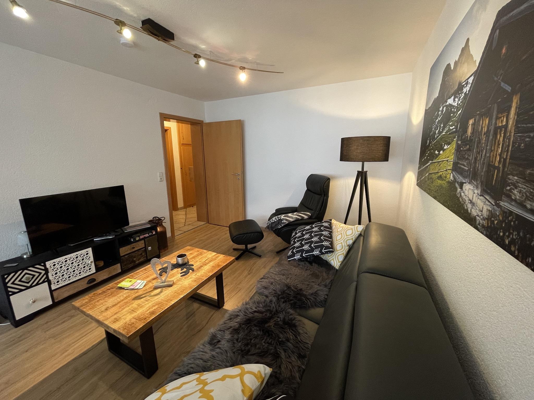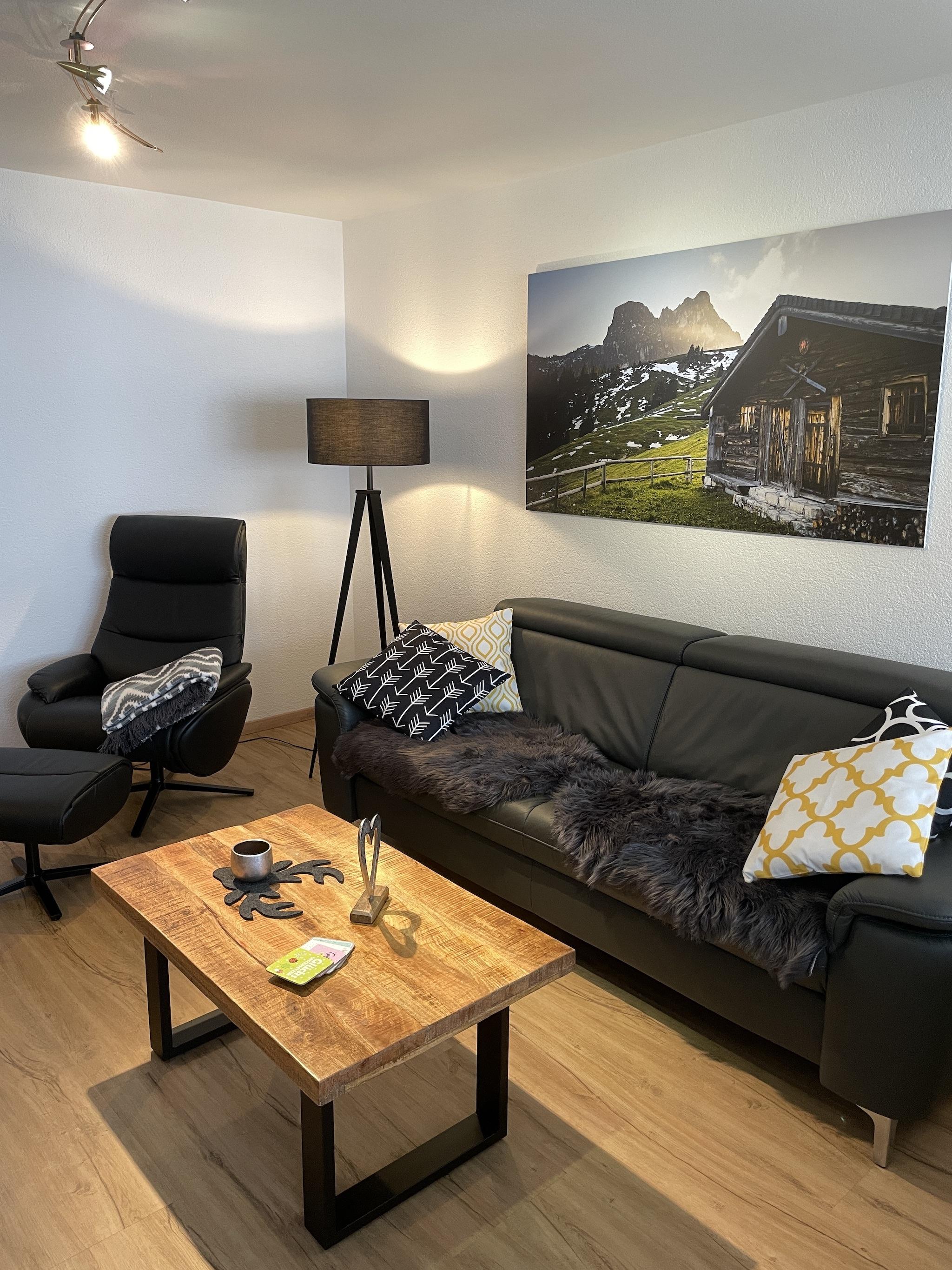 Sie besteht aus einem separaten Schlafzimmer, Wohnzimmer mit gemütlicher Leder Couch und einem Relaxsessel, einer Küche mit großem Tisch und Eckbank, einem Bad mit einer ebenerdigen geräumigen Dusche, WC, inkl. Fußbodenheizung, sowie einem wettergeschütztem Balkon (Loggia) mit Sonnenmarkise und mit Bergblick für gemütliche Stunden auch noch am Abend.