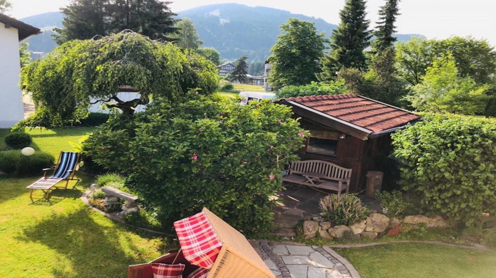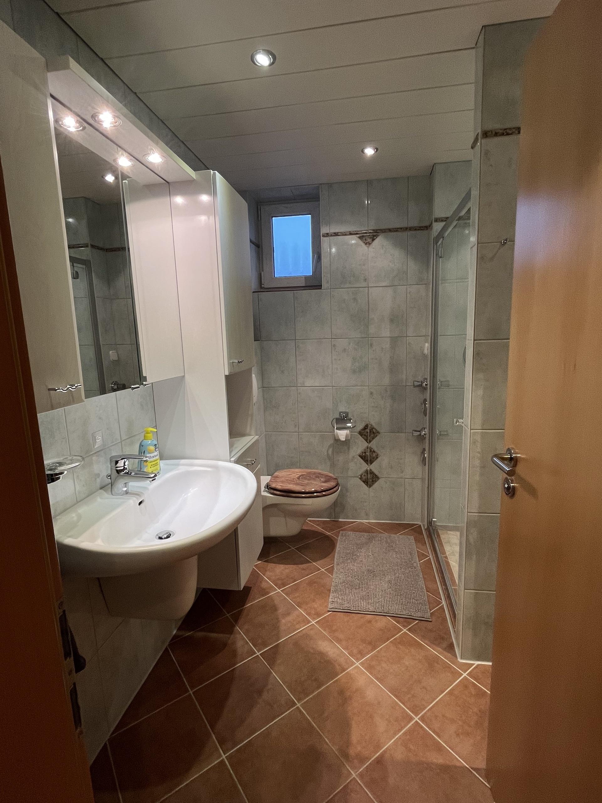 Im 1 OG befindet sich eine 55 qm große Whg. mit separatem Schlafzimmer, Wohnzimmer, Küche, Bad mit Dusche/WC, einem überdachten Balkon (Loggia) mit Sonnenmarkise und Bergblick für gemütliche Stunden.
