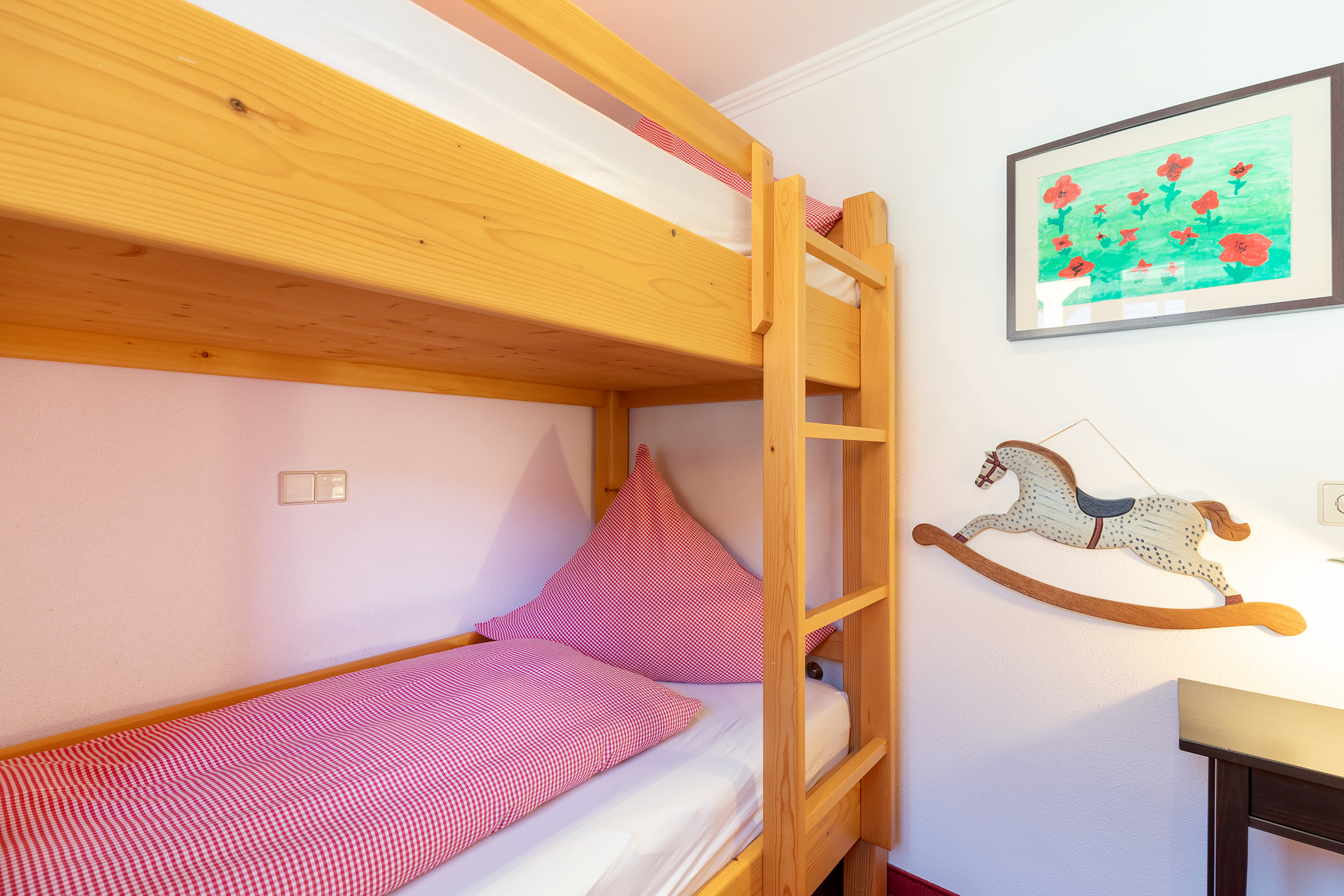 Sie machen gerne Urlaub mit der ganzen Familie? Dann ist unsere Ferienwohnung Sissi für Sie genau das richtige! Neben einer traumhaften Ausstattung und dem romantischem Charme vergangener Tage, verfügt die Ferienwohnung Sissi über ein Wohn- Schlafzimmer und zusätzlich noch ein Kinderschlafzimmer mit einem Hochbett für die kleinen Alpenerkunder.
