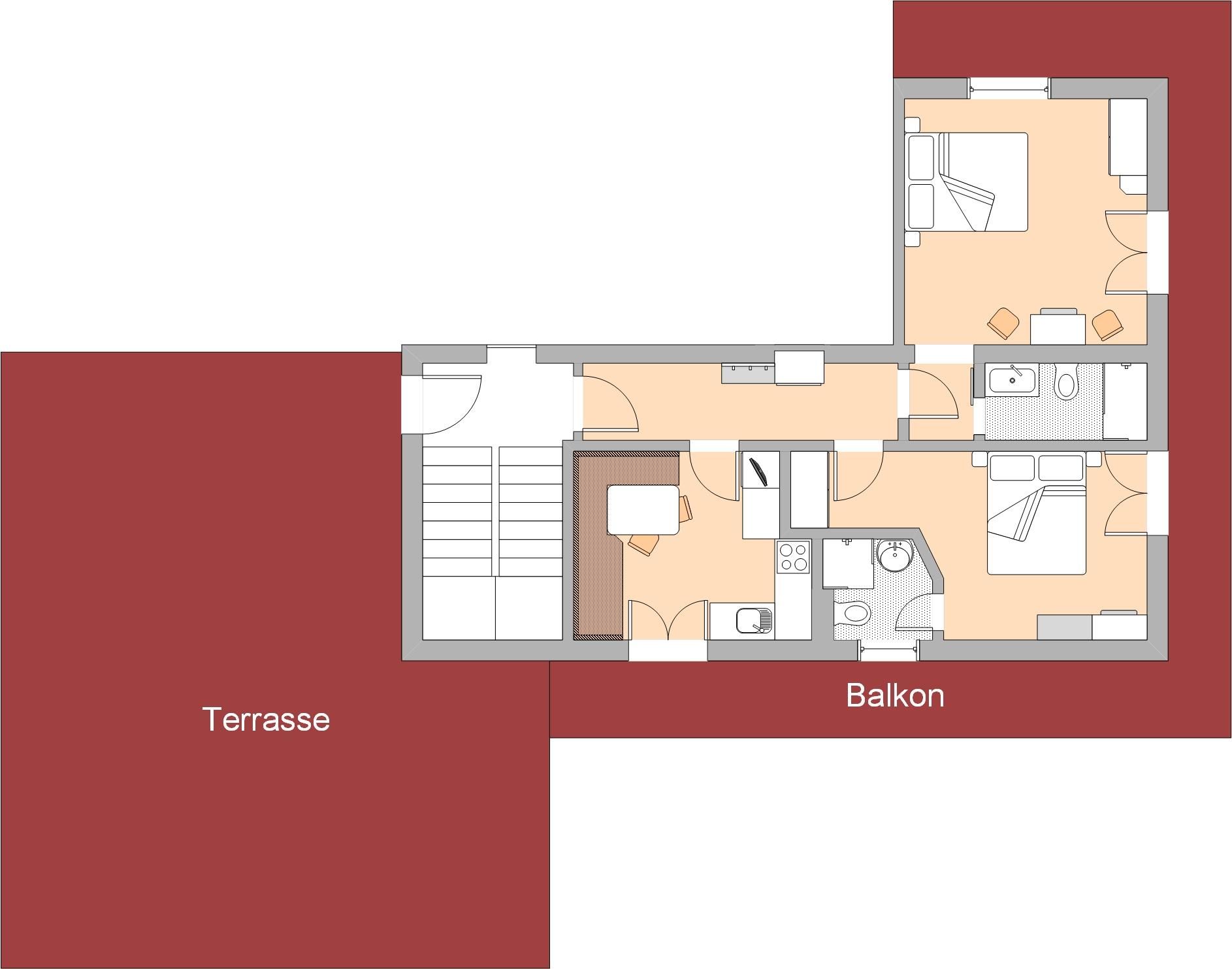 Beide Ferienwohnungen mit Balkon liegen im ersten Stock und sind gemütlich eingerichtet. Unseren Gästen steht auch eine große Sonnenterrasse zur Verfügung. Genügend Parkplätze befinden sich direkt vor unserem Haus.