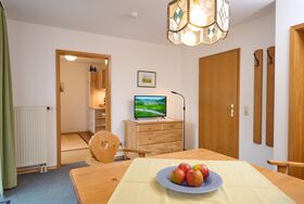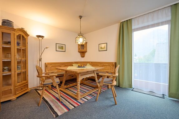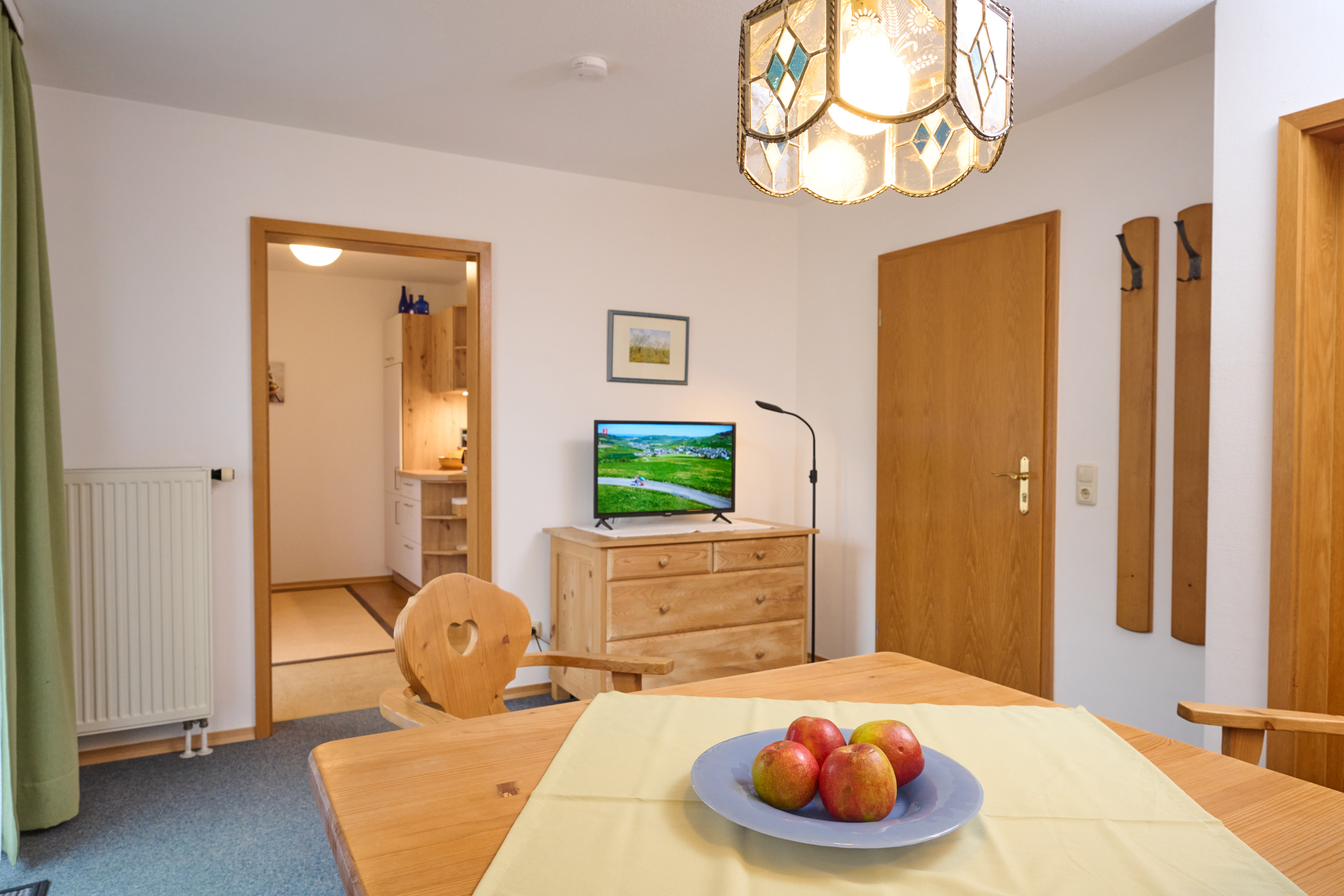 Fewo 1 Spatz mit Ost- und Westbalkon für 2-3 Personen besteht aus einem gemütlichen Wohnraum im Landhausstil mit Eckbankgruppe, SAT-TV und Gäste-Wlan, einer Einbauküche mit Sitzecke; 1-2 Du/Wc, sowie 1-2 schönen Voglauer-Schlafzimmern mit Teppichboden