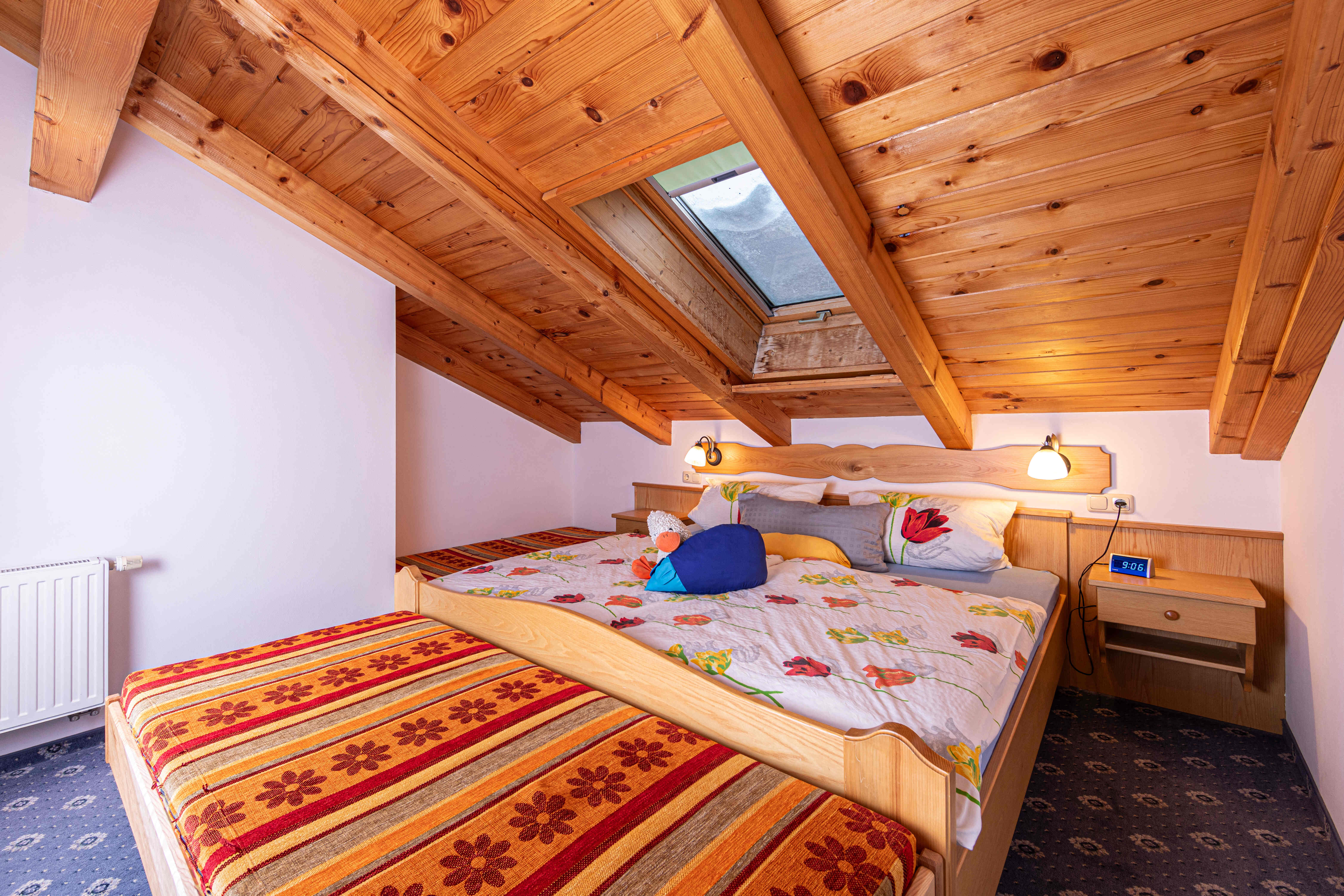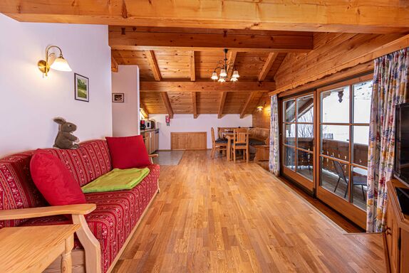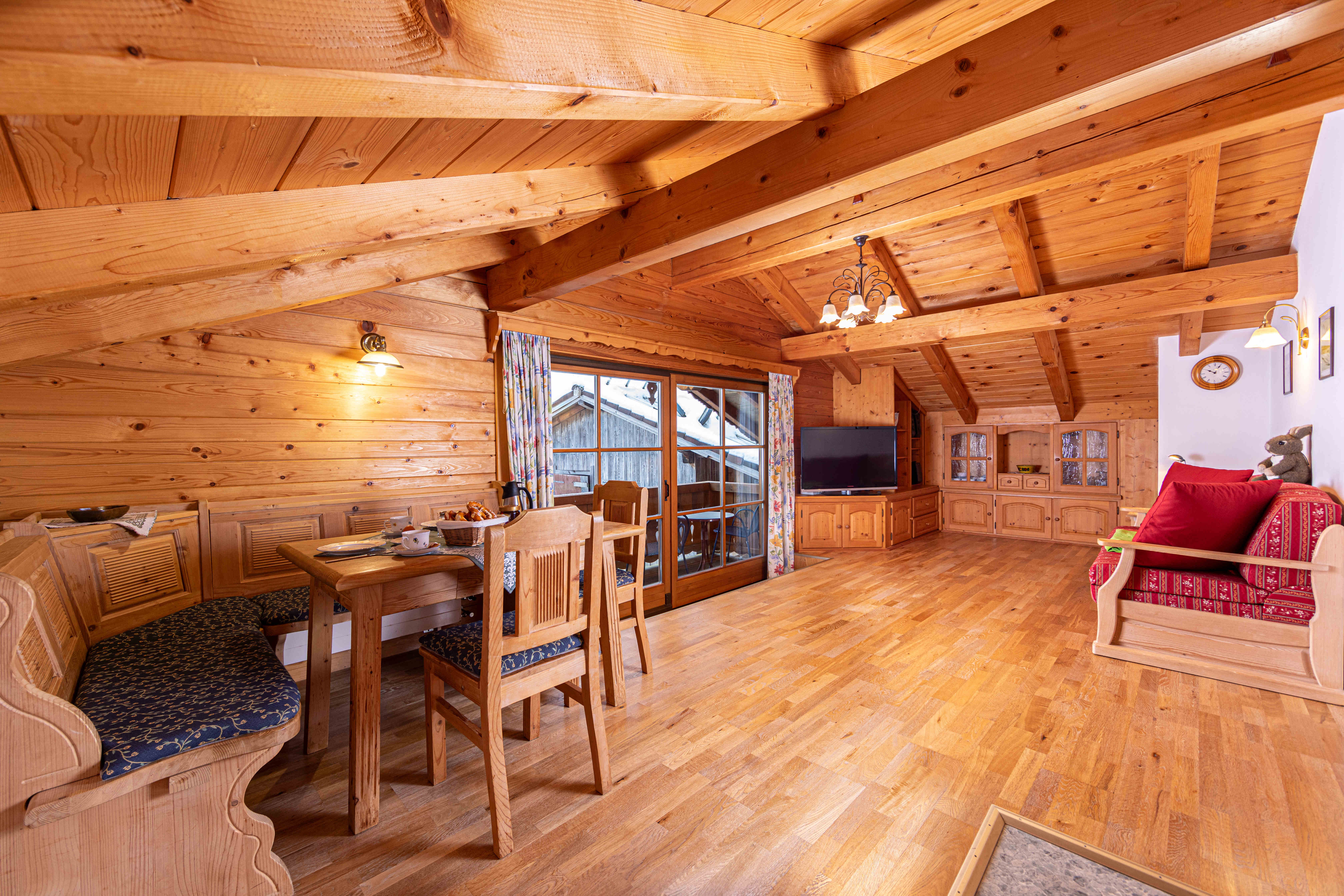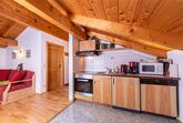 Unsere urgemütliche Ferienwohnung, mit Vollholzmöbeln vom Schreiner ausgestattet, befindet sich in ruhiger Lage im Dachgeschoss und bietet vom Balkon aus einen wunderbaren Blick auf die umliegenden Wiesen. Die Küche ist mit allen modernen Annehmlichkeiten wie E-Herd mit Ceranfeld, Geschirrspüler, Mikrowelle und Kaffeemaschine ausgestattet.