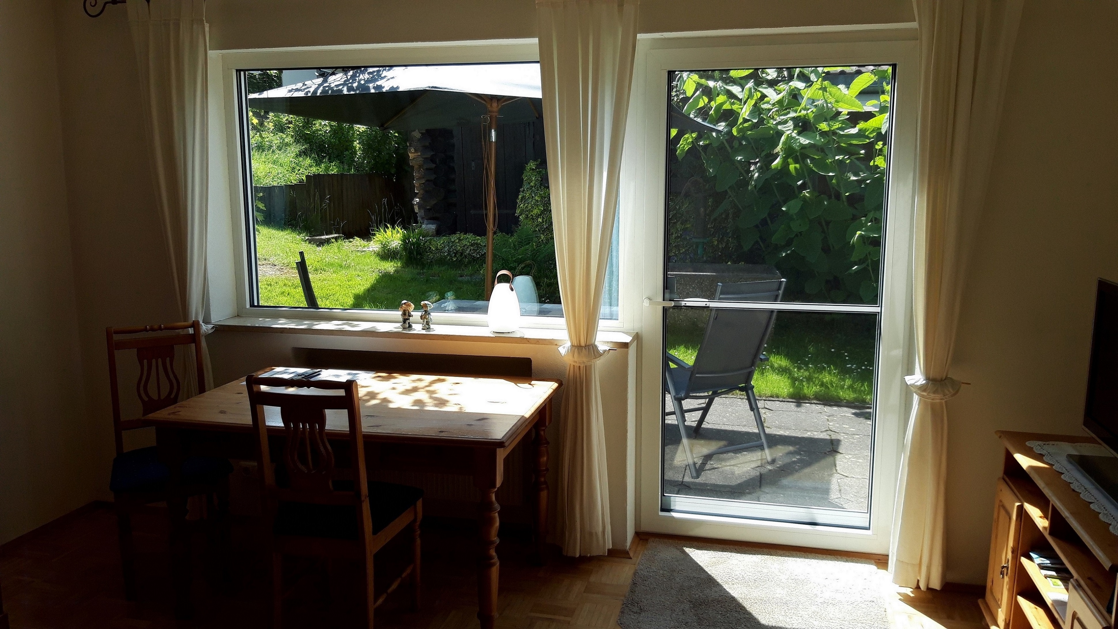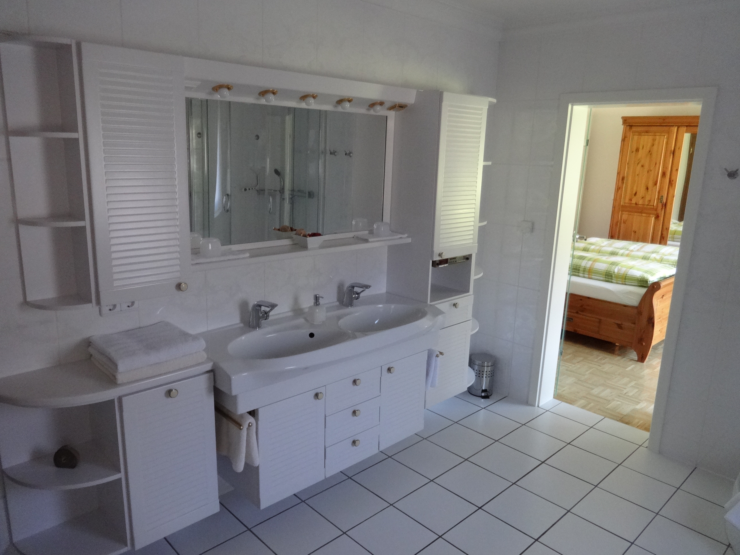 Unser schönstes Zimmer ist ebenfalls sehr groß und hat einen direkten Zugang zu einer eigenen Terrasse. Das Zimmer liegt nach Westen und deshalb haben Sie am Abend noch lange Sonne und ein ganz lauschiges Plätzchen nur für sich. Ebenfalls im Detail auf einander abgestimmt ist dieses Zimmer mit Landhausmöbeln eingerichtet. Ganz entspannt können Sie bei gekippter Terrassentüre oder geöffneten Fenstern schlafen, denn unsere Zimmer sind alle mit Insektenschutzgittern ausgestattet. Das dazugehörige Bad ist 12m² groß und top-modern mit luxuriösen Badmöbeln und einer Regenwalddusche ausgestattet. Natürlich fehlt weder der High-End Kosmetikspiegel noch der Fön und auch in diesem Bad kommt die wohlige Wärme vom beheizten Fußboden.