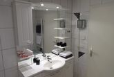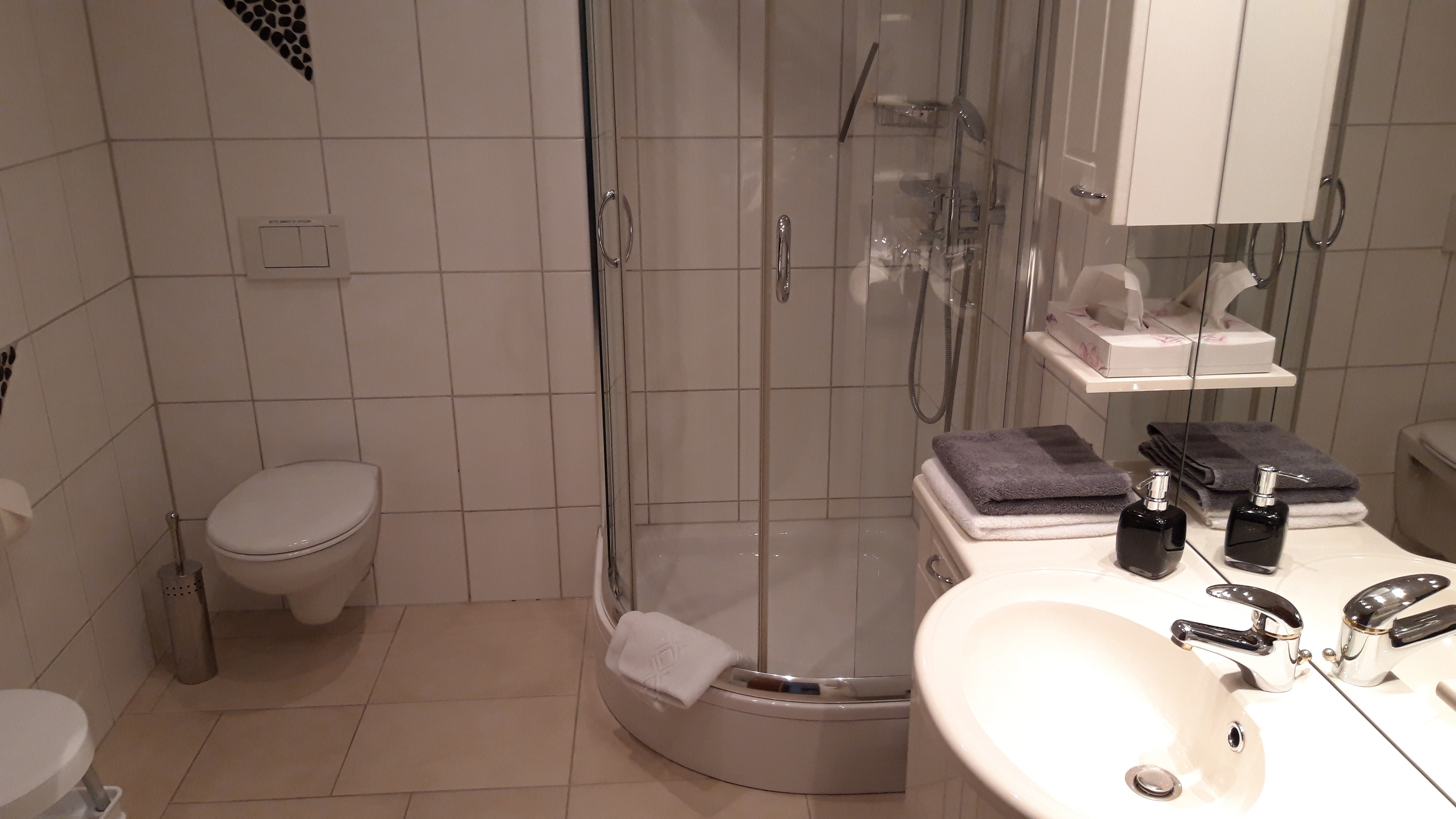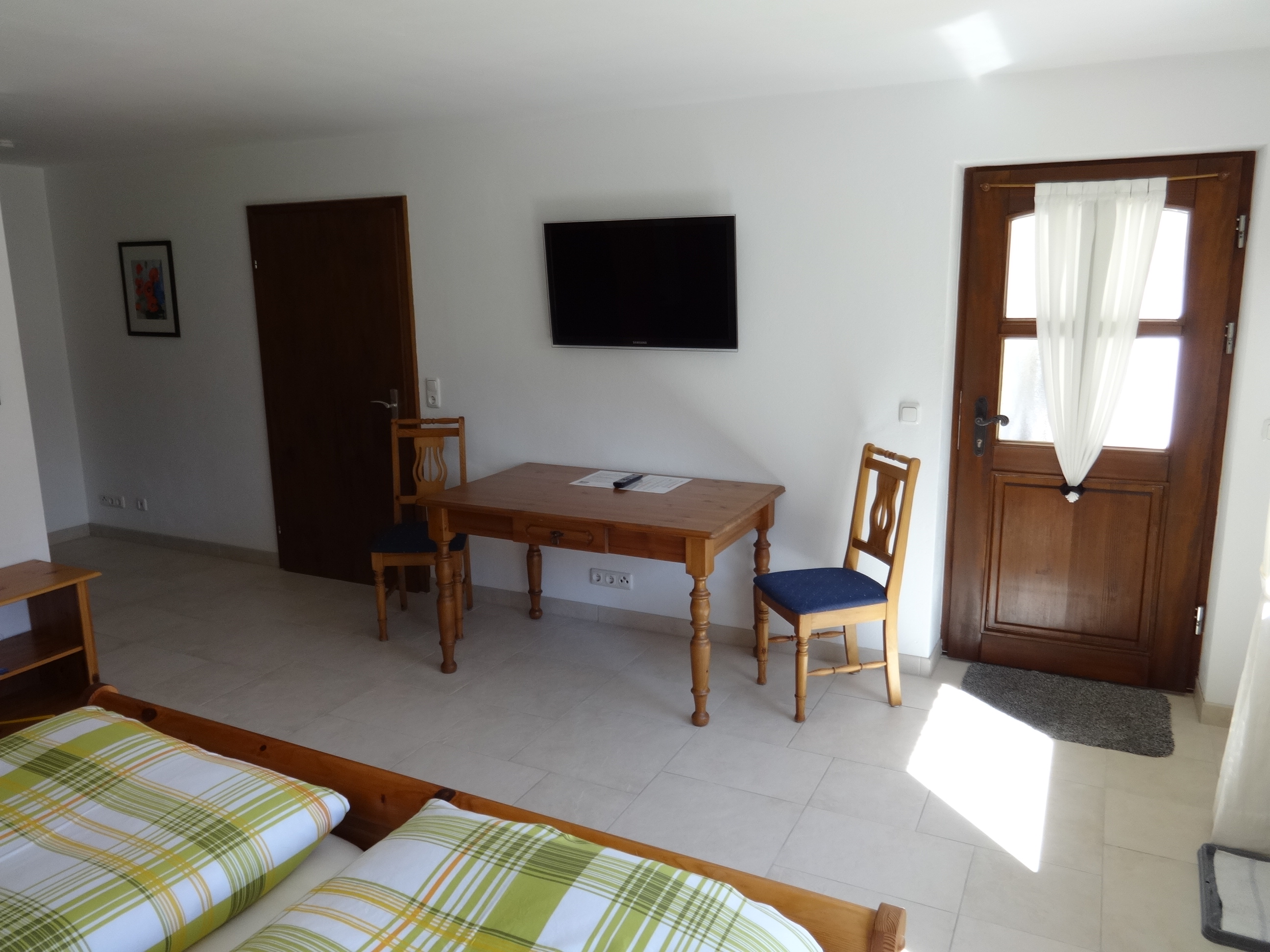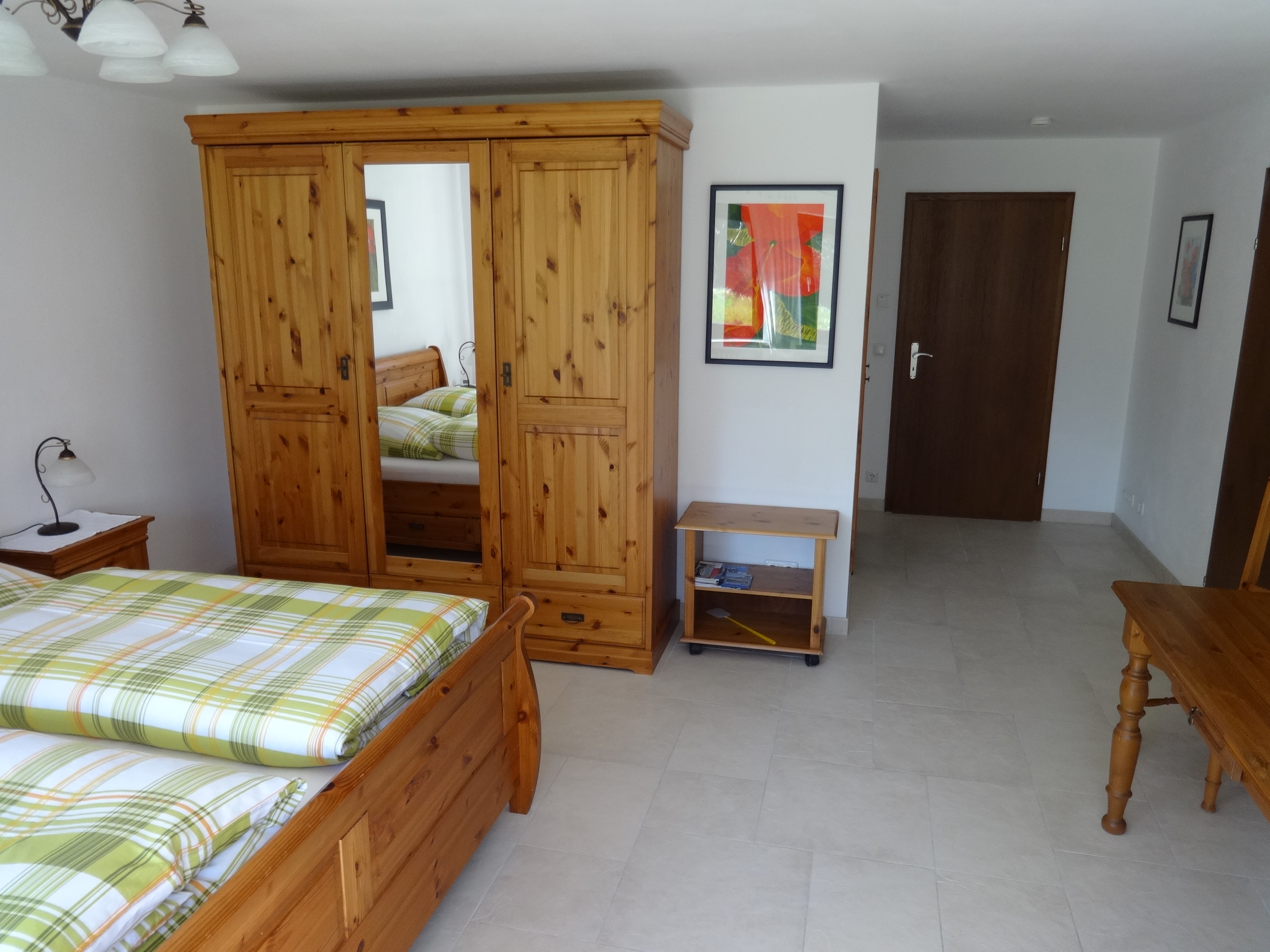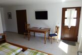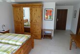 Unser größtes Zimmer mit über 30m² und ebenfalls Blick in den Garten kann ganz bequem mit zwei weiteren Zustellbetten bestückt werden. Ebenfalls im Detail auf einander abgestimmt ist dieses Zimmer mit Landhausmöbeln eingerichtet. Im Sommer angenehm kühl und im Winter kuschelig warm durch Fußbodenheizung. So herrscht das ganze Jahr über ein angenehmes Raumklima. Ganz entspannt können Sie bei geöffnetem Fenster schlafen denn unsere Zimmer sind alle mit Insektenschutzgittern ausgestattet. Das dazugehörige Bad ist top-modern mit schönen Badmöbeln und einer Regenwalddusche ausgestattet. Natürlich fehlt weder der High-End Kosmetikspiegel noch der Fön und auch im Bad kommt die wohlige Wärme vom beheizten Fußboden.