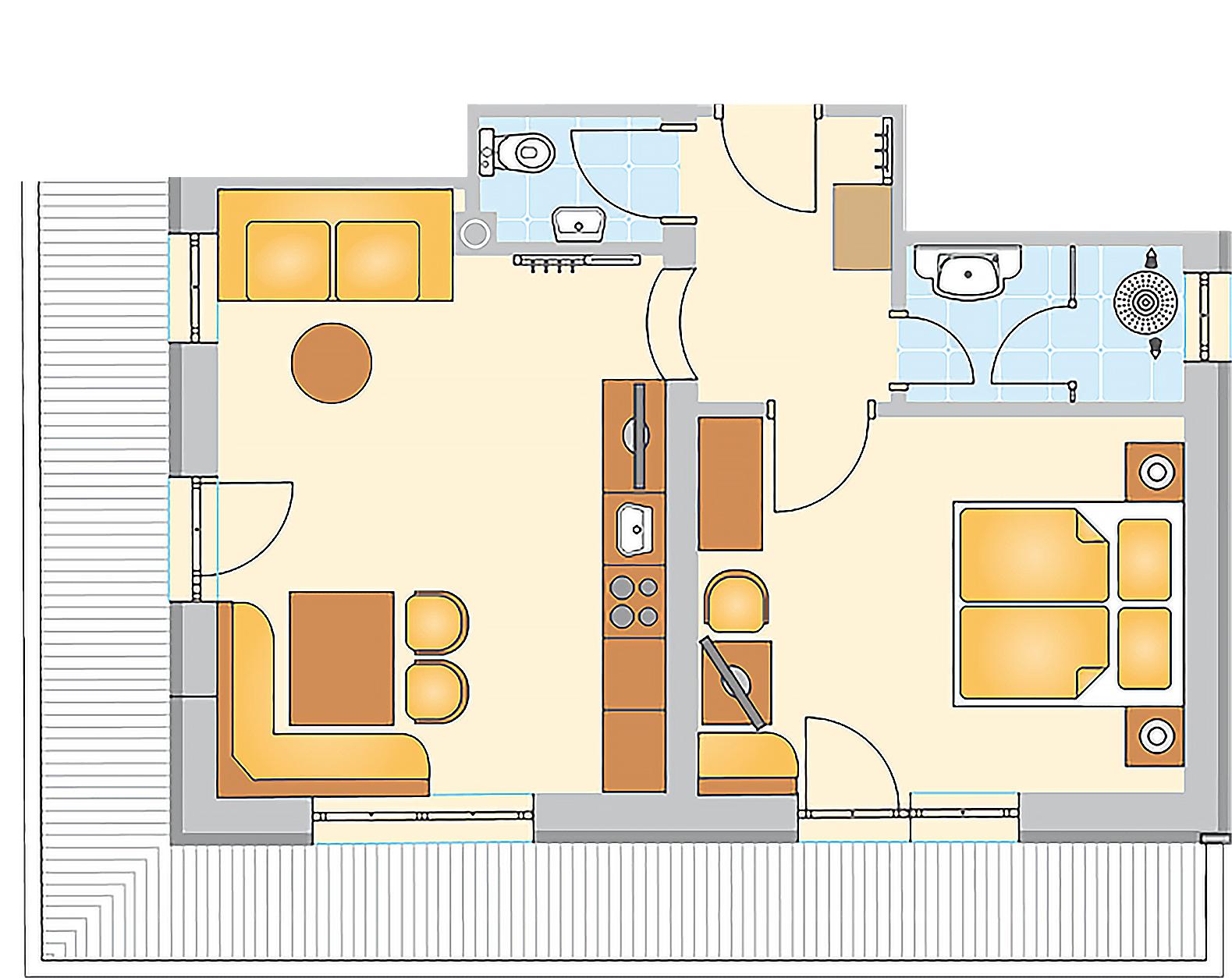 Das Appartement verfügt über 1 Doppelzimmer mit Dusche/WC, voll ausgestattete Wohnküche (Induktionsherd, Mikrowelle, Backrohr, Geschirrspüler, Kühlschrank mit Gefrierfach, Kaffeemaschine, Toaster, Wasserkocher), Vorraum mit Garderobe, Balkon. Das Appartement mit 45 m² bietet folgende Annehmlichkeiten.
