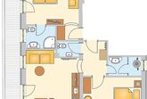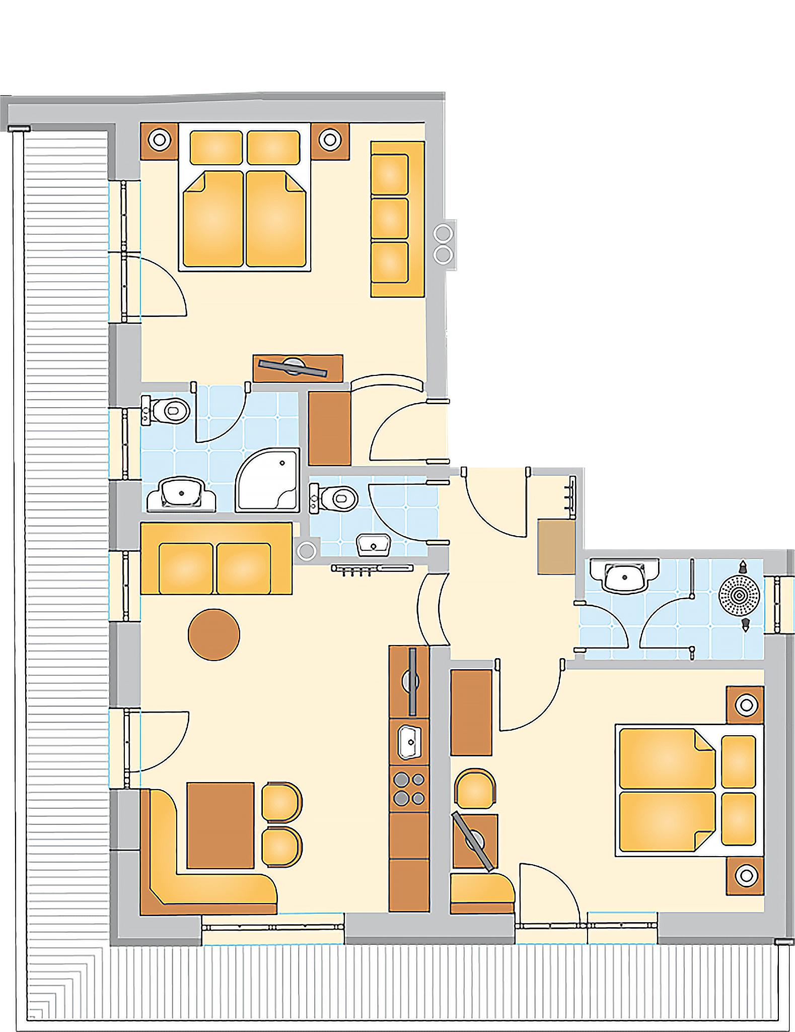 Das Appartement verfügt über 2 Doppelzimmer mit Dusche/WC, Wohnzimmer mit Couch, Sitzbereich und voll ausgestattete Küche (Induktionsherd, Mikrowelle, Backrohr, Geschirrspüler, Kühlschrank mit Gefrierfach, Kaffeemaschine, Toaster, Wasserkocher), Vorraum mit Garderobe, Balkon. Das Appartement mit 65 m² bietet folgende Annehmlichkeiten.