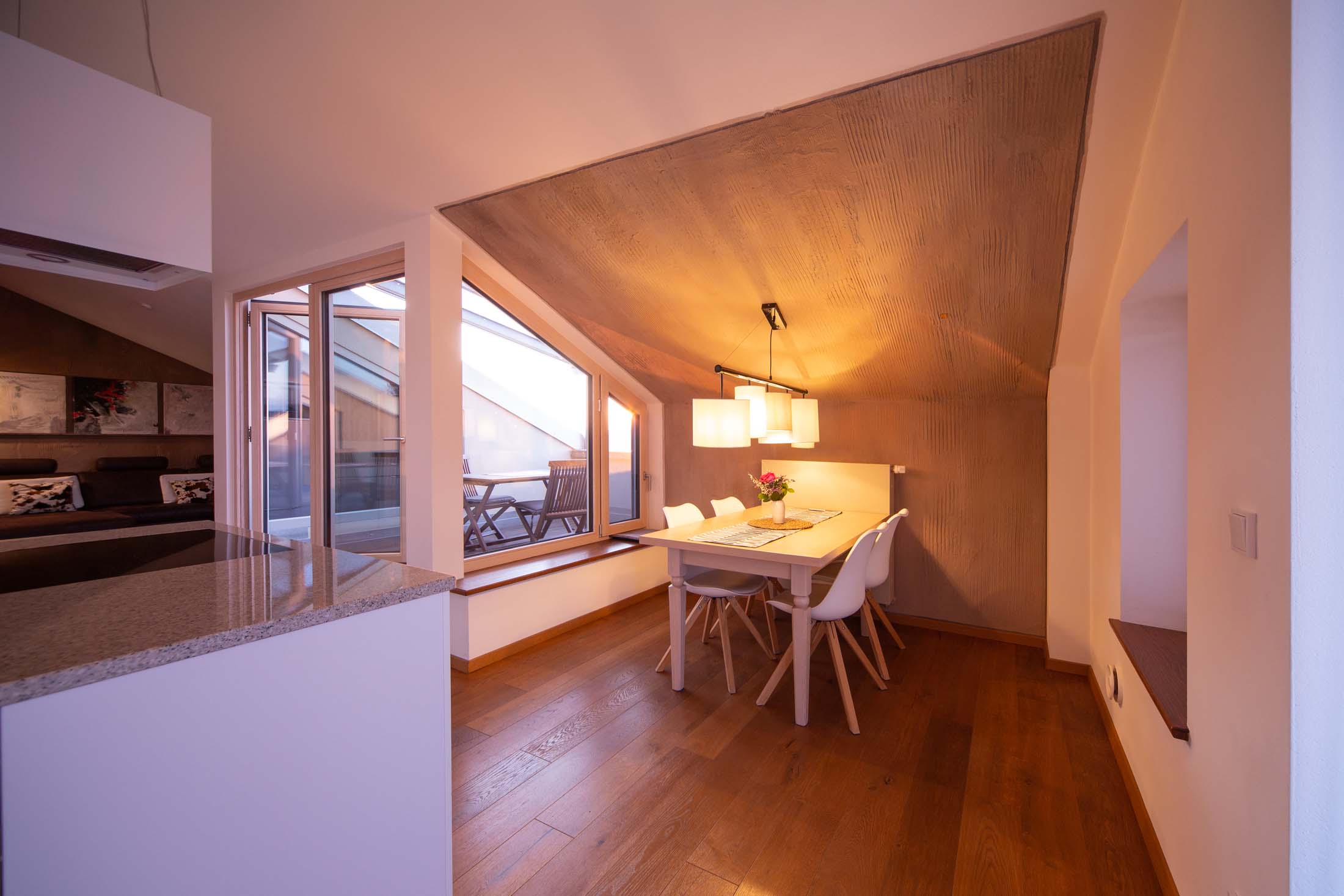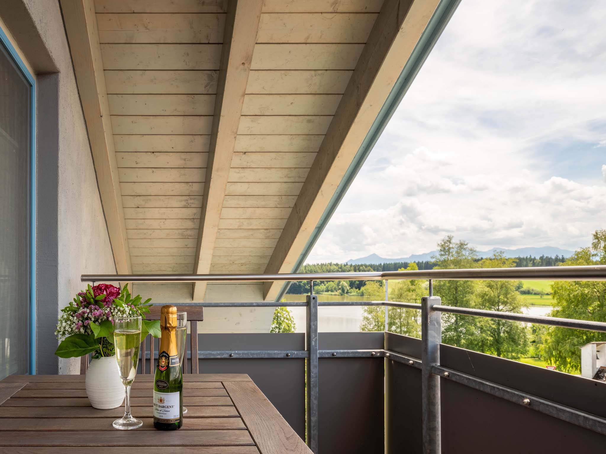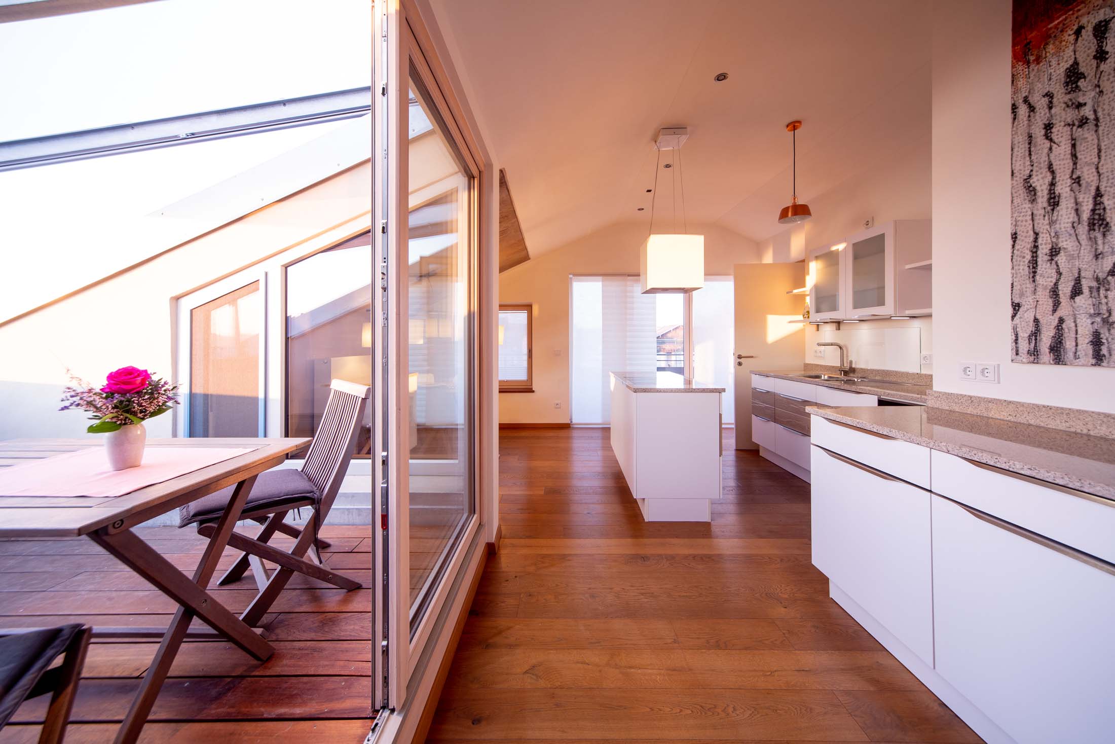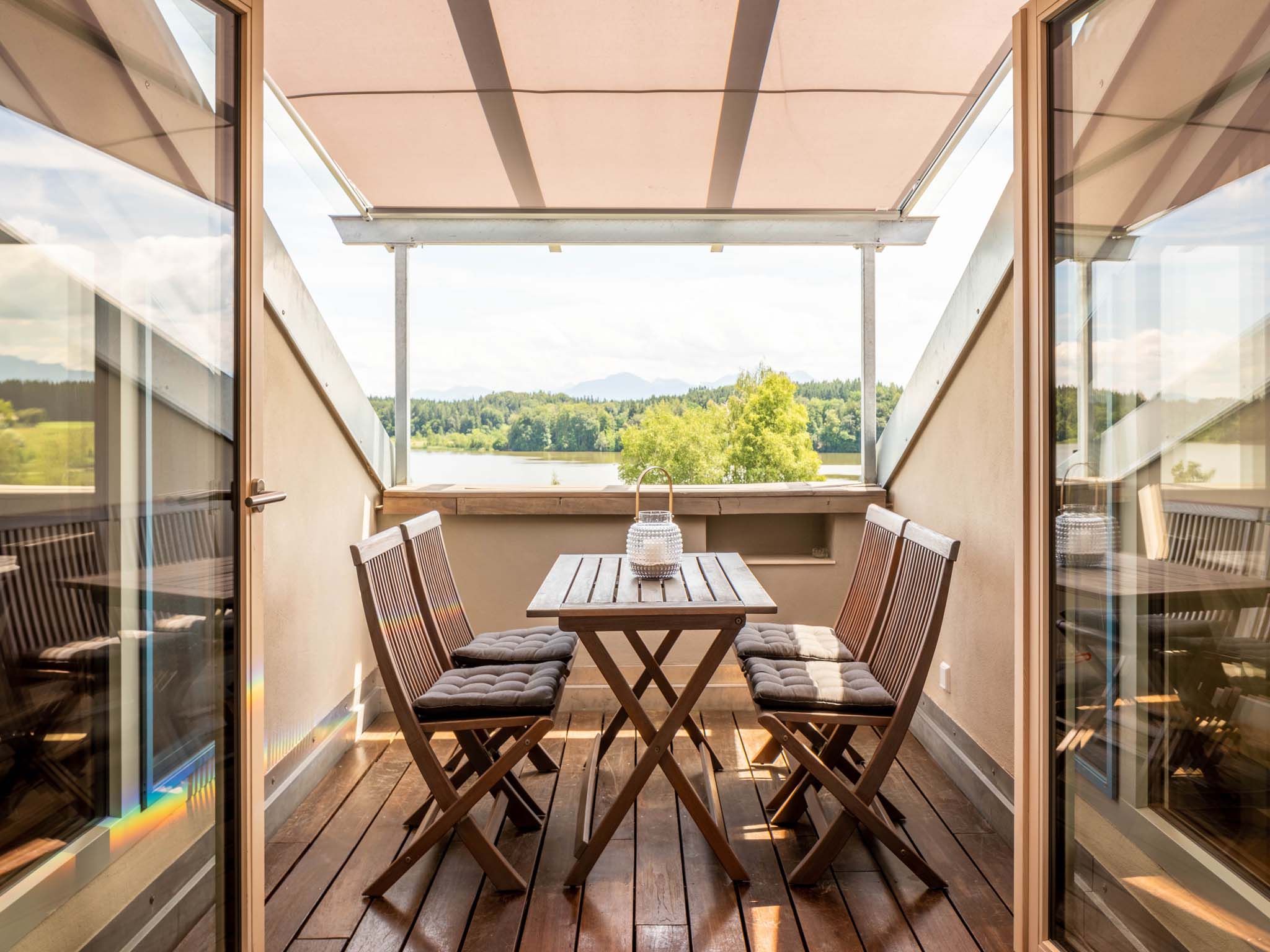 In dieser hellen, sehr modern gestalteten Ferienwohnung haben Sie einen Ausblick von oben über den Pelhamer-See in die Chiemgauer Alpenkette. Die sehr großzügige Wohnung verfügt über einen offenen Wohnraum, zwei getrennte Schlafzimmer sowie zwei Bäder und zwei Balkone. Ruhige, klare Formen bestimmen die Räumlichkeiten dieser Wohnung.