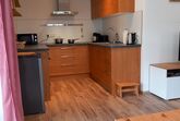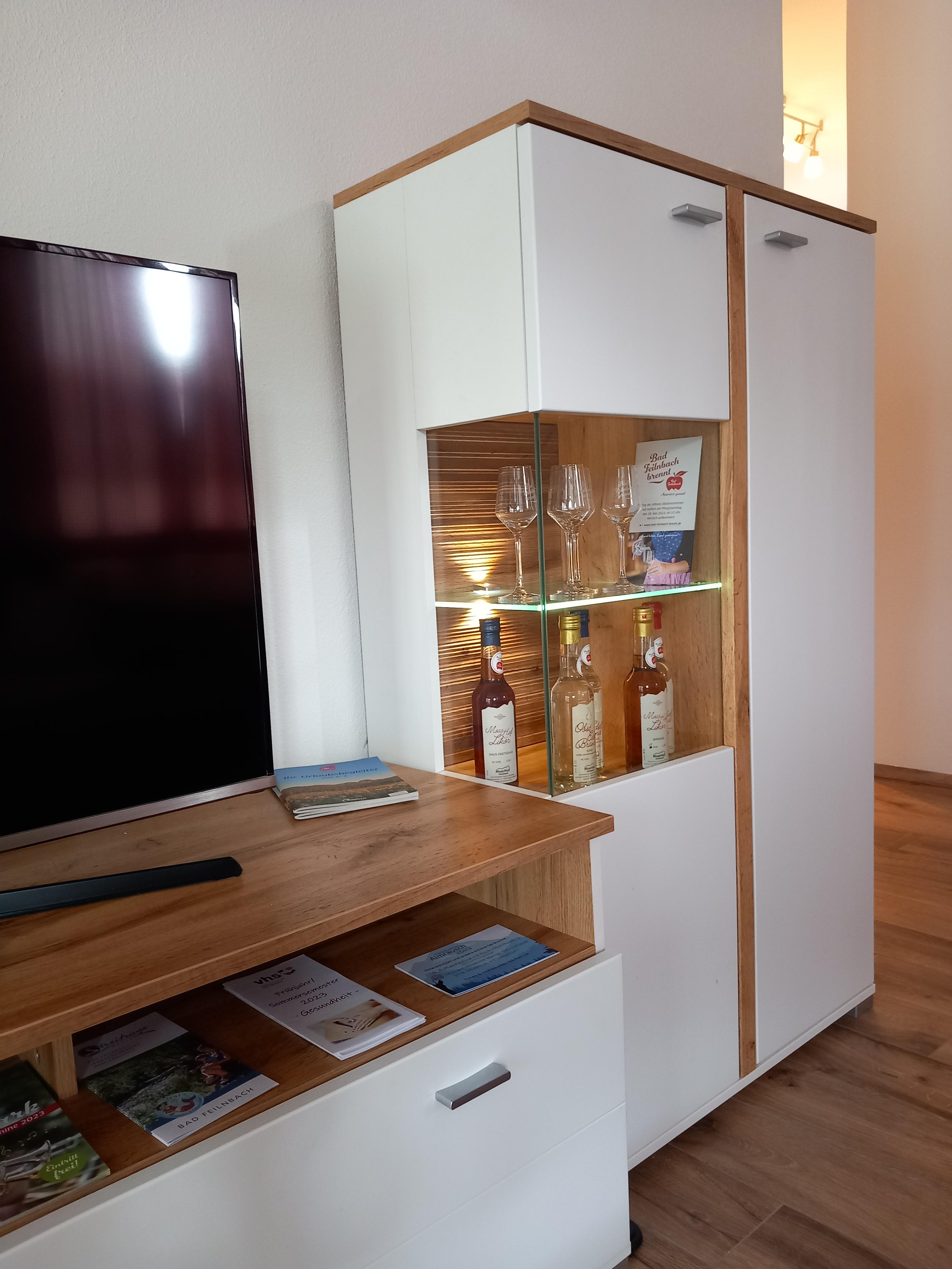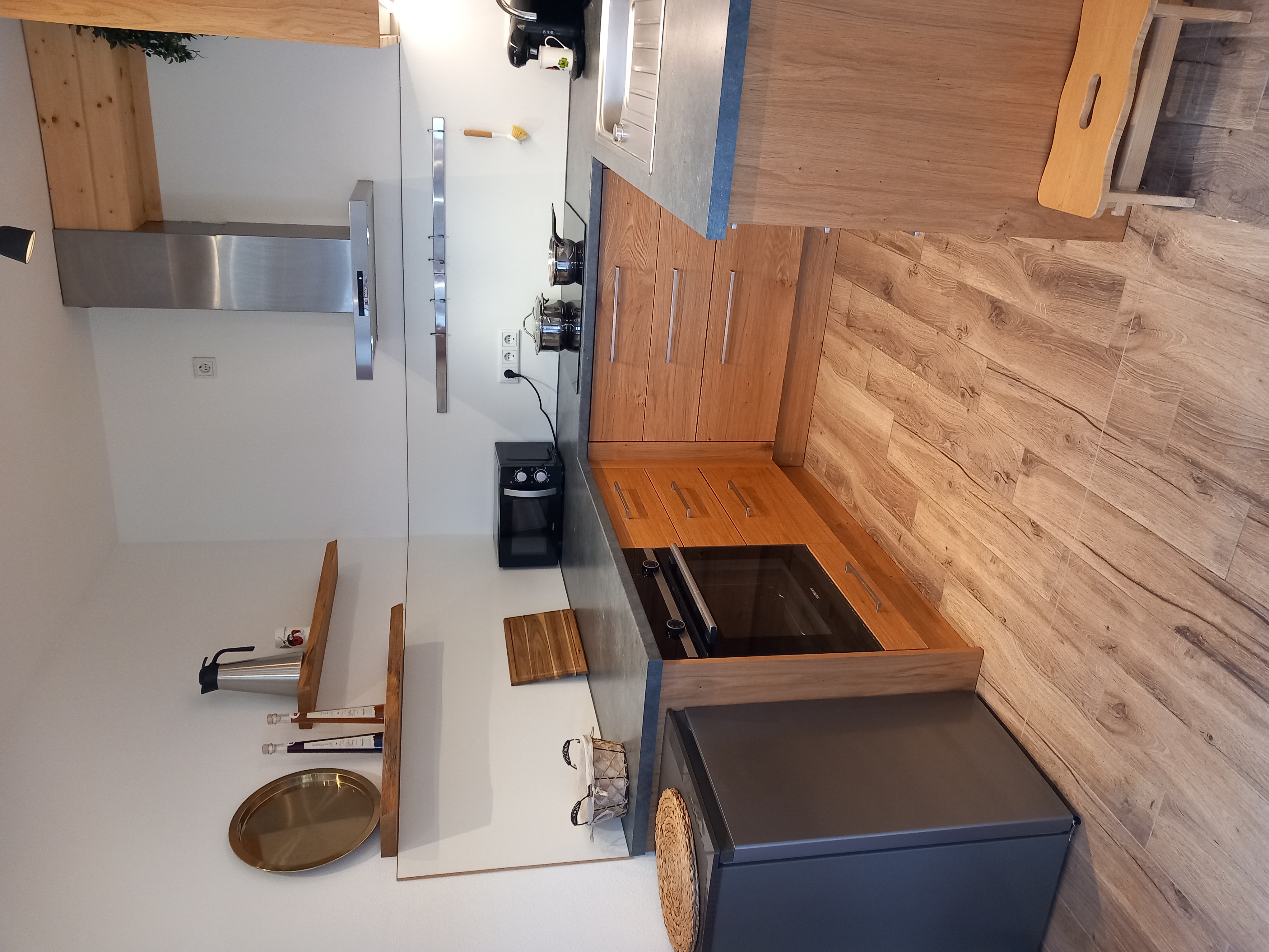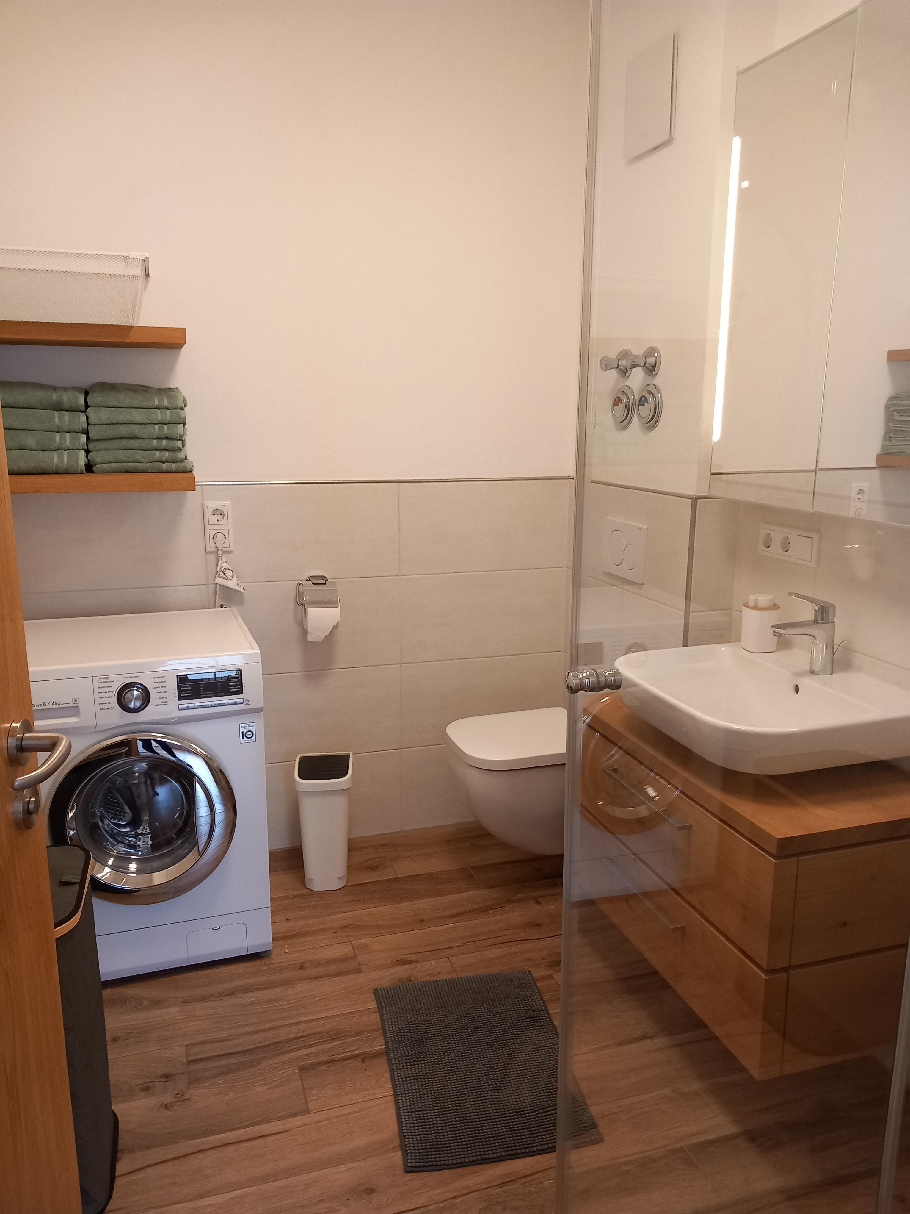 Eigener Eingang, großer Wohnraum mit Essecke, bestens ausgestattete Küche, 1 Schlafzimmer, Badezimmer mit Dusche und WC, Waschmaschine mit Trocknerfunktion, freies WLAN