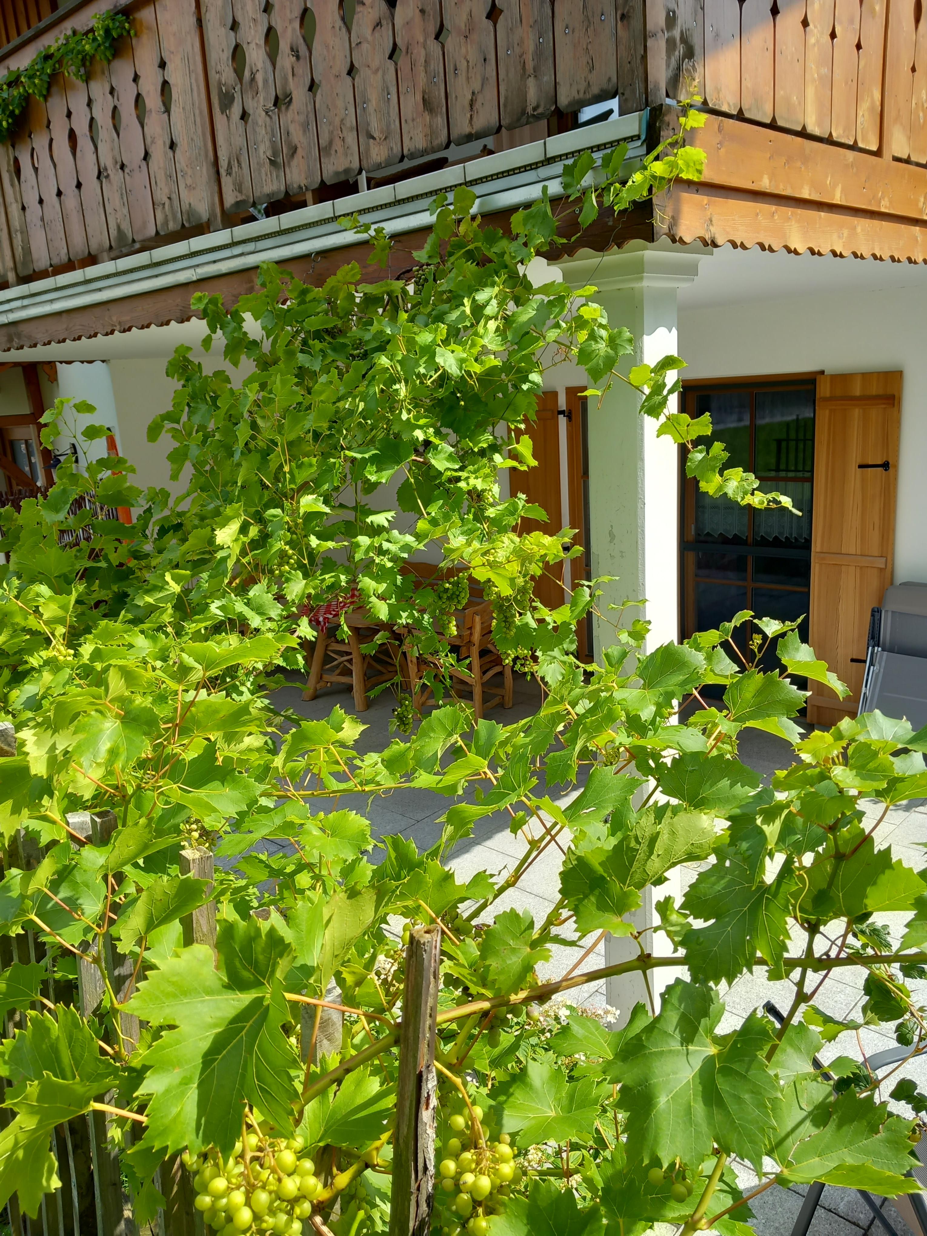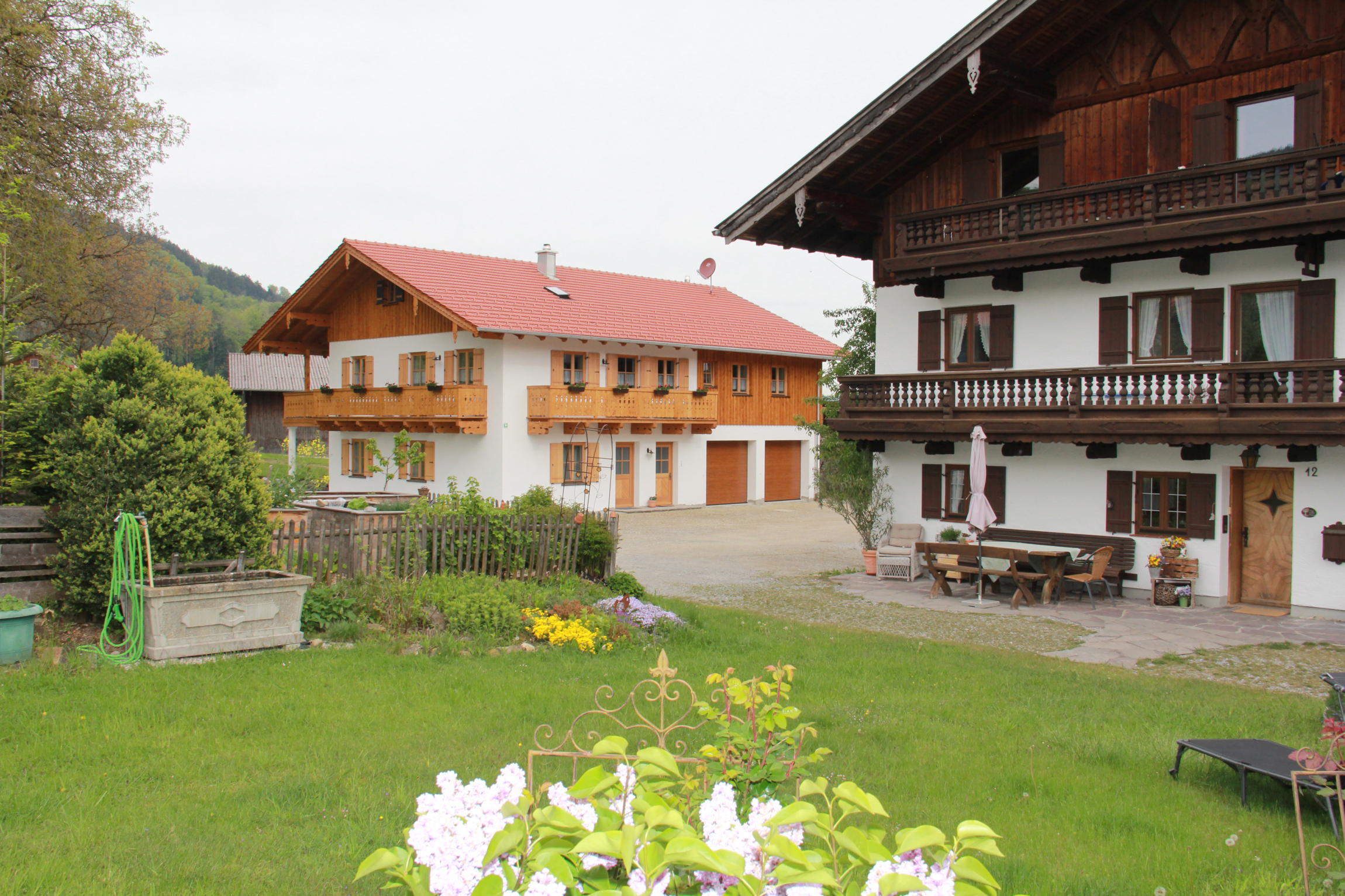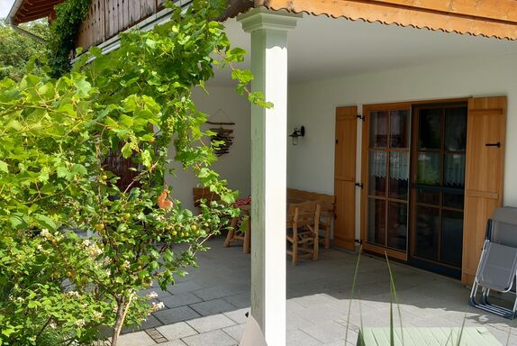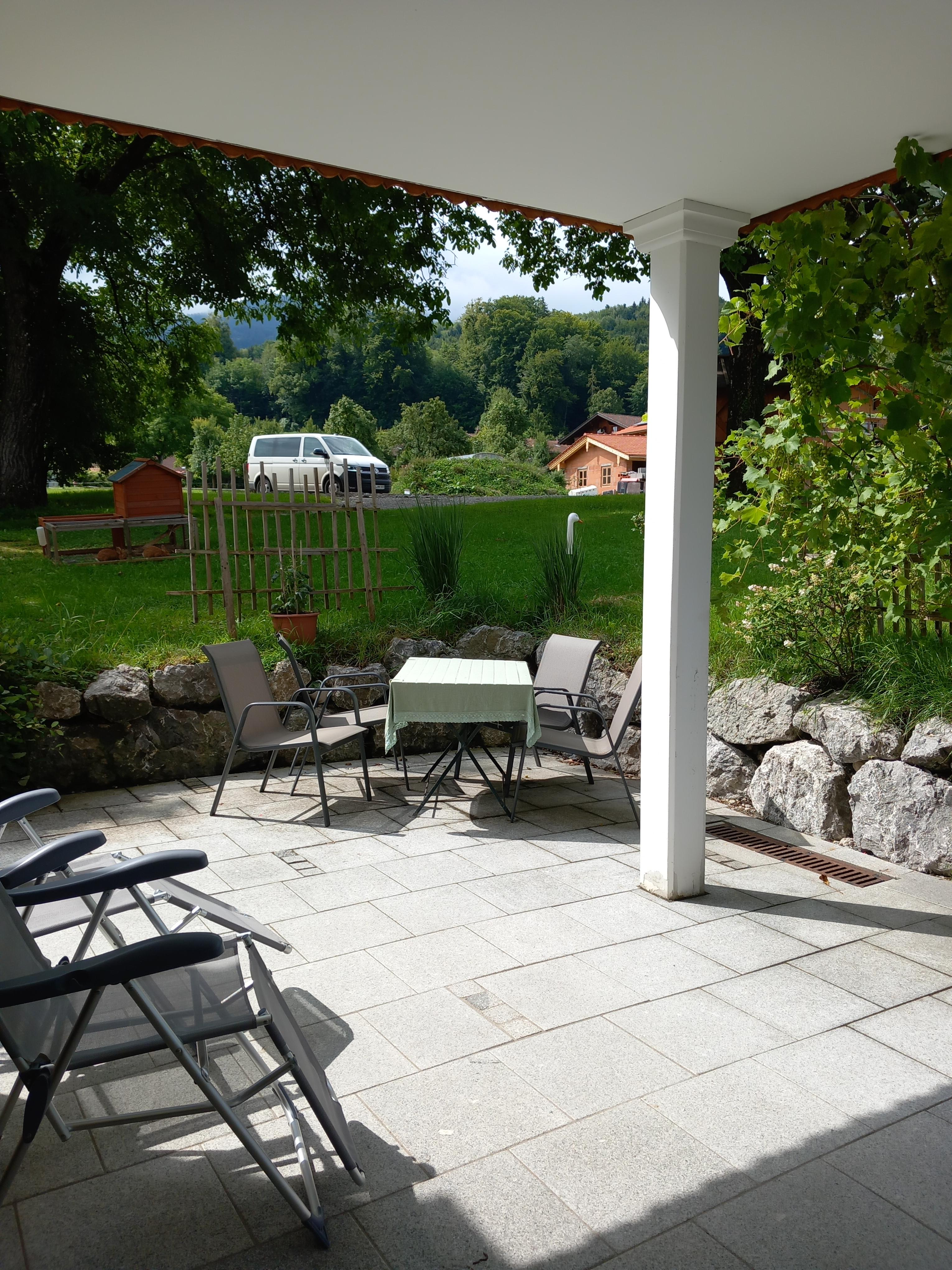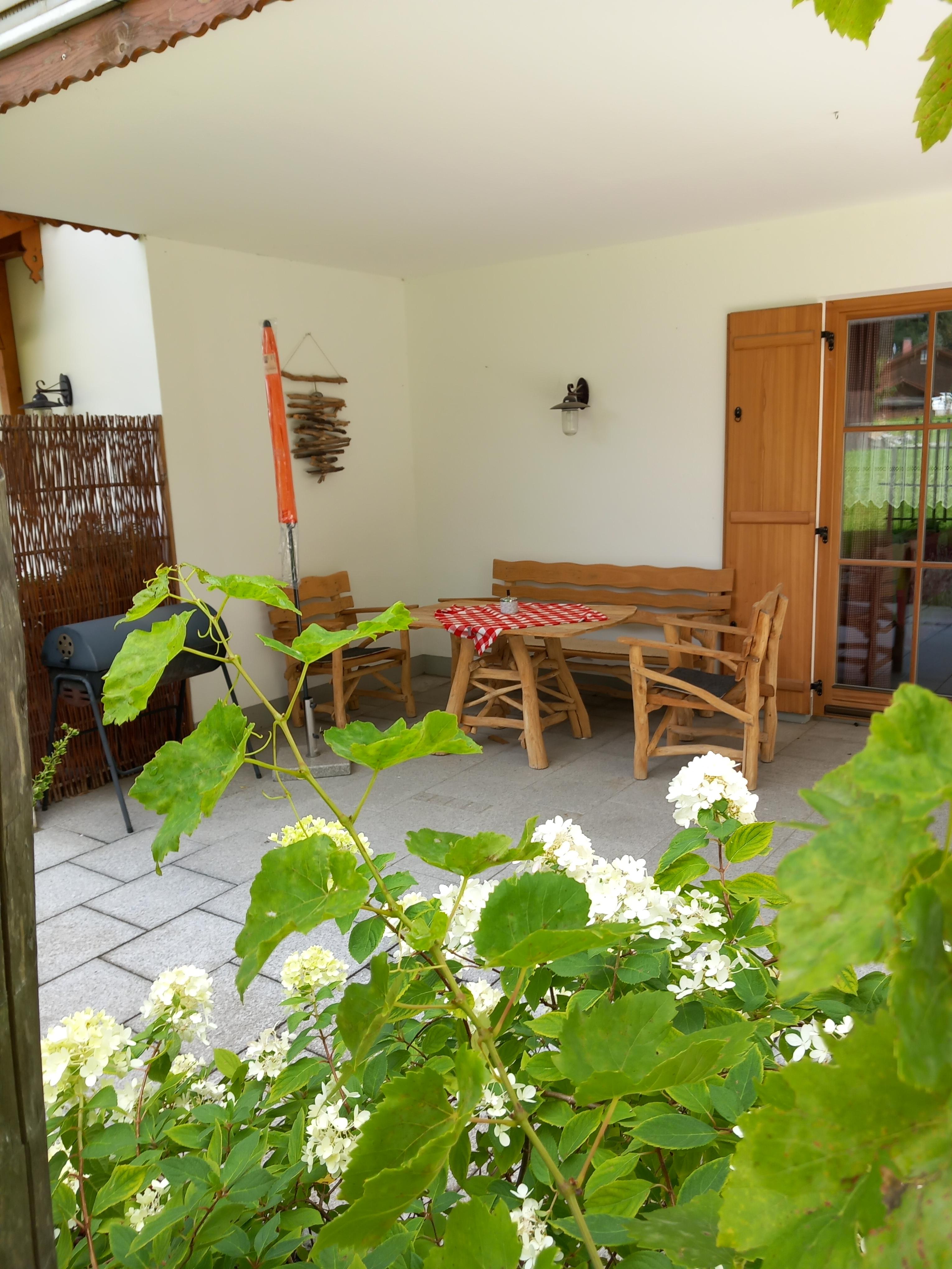 Genießen Sie auf unserer großen überdachten Terasse den Blick zum Hocheck und zum Auerberg.
