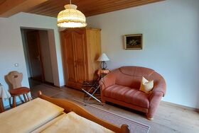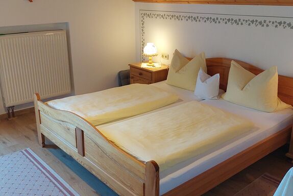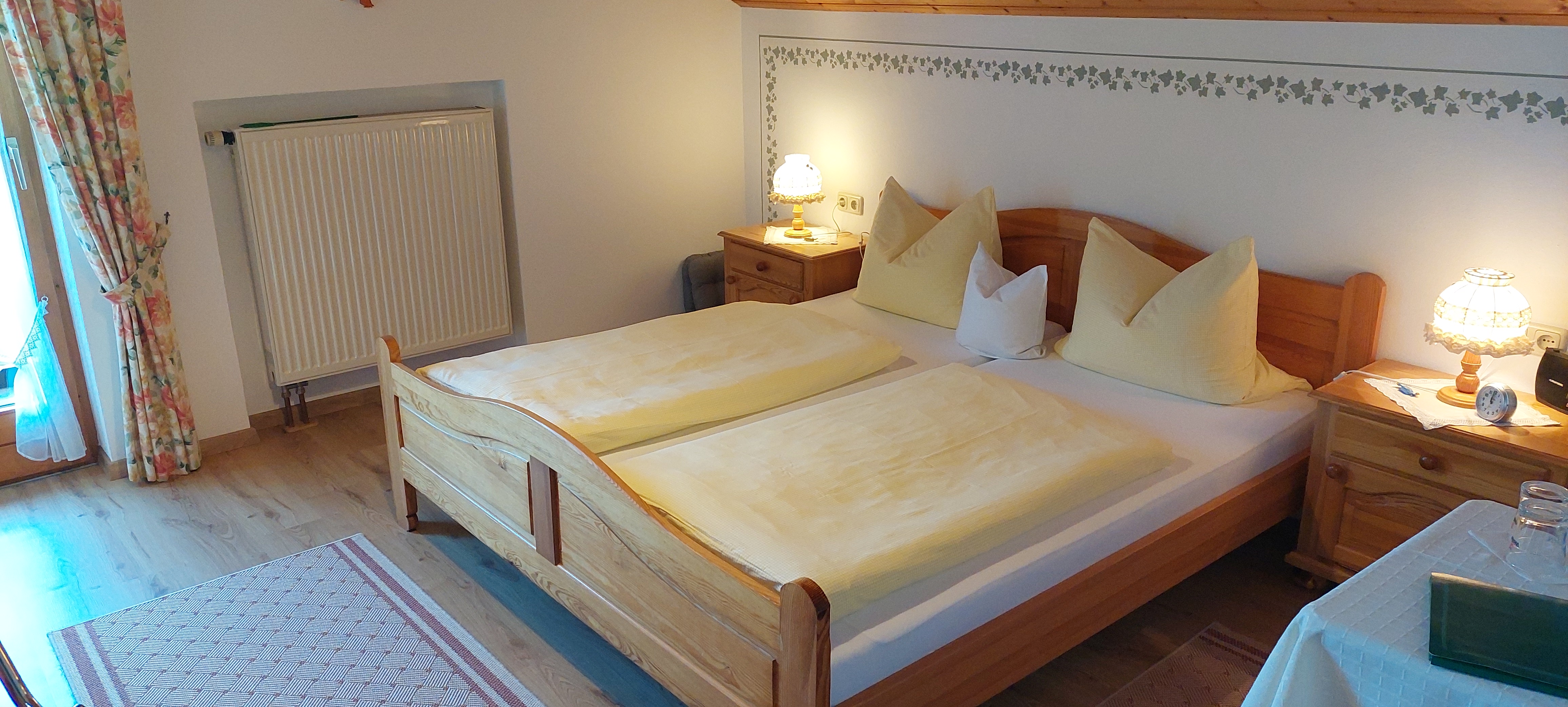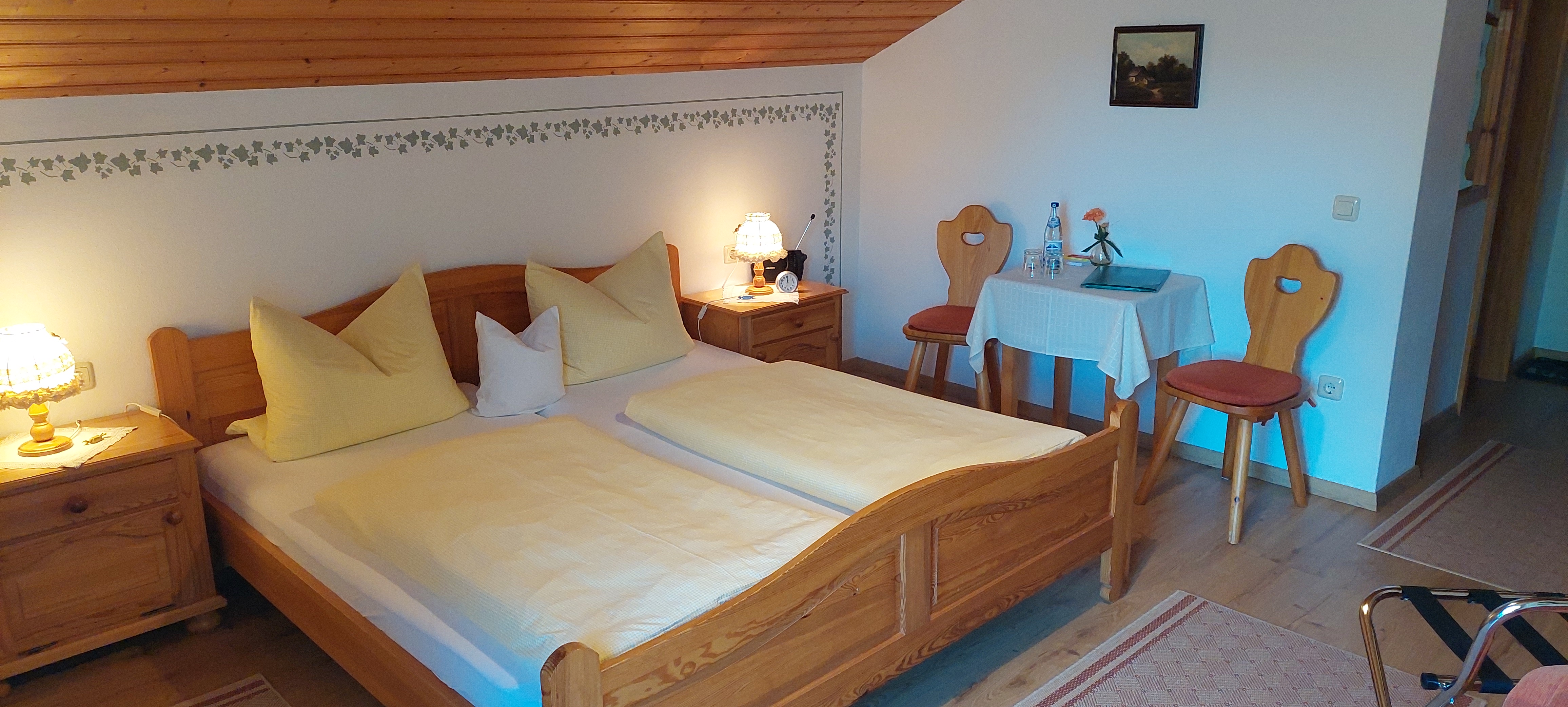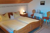Helles Nichtraucher Doppelzimmer mit einem Doppelbett 2,00 x 1,80 m, Dusche/WC, Fön, kostenloses WLAN und Balkon. Gemütlicher Aufenthaltsraum mit Kabel-TV, Liegewiese und Terrasse. Frühstück servieren wir in unserem Frühstücksraum. Hunde und Haustiere dürfen nicht mitgebracht werden.
