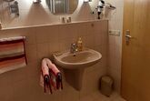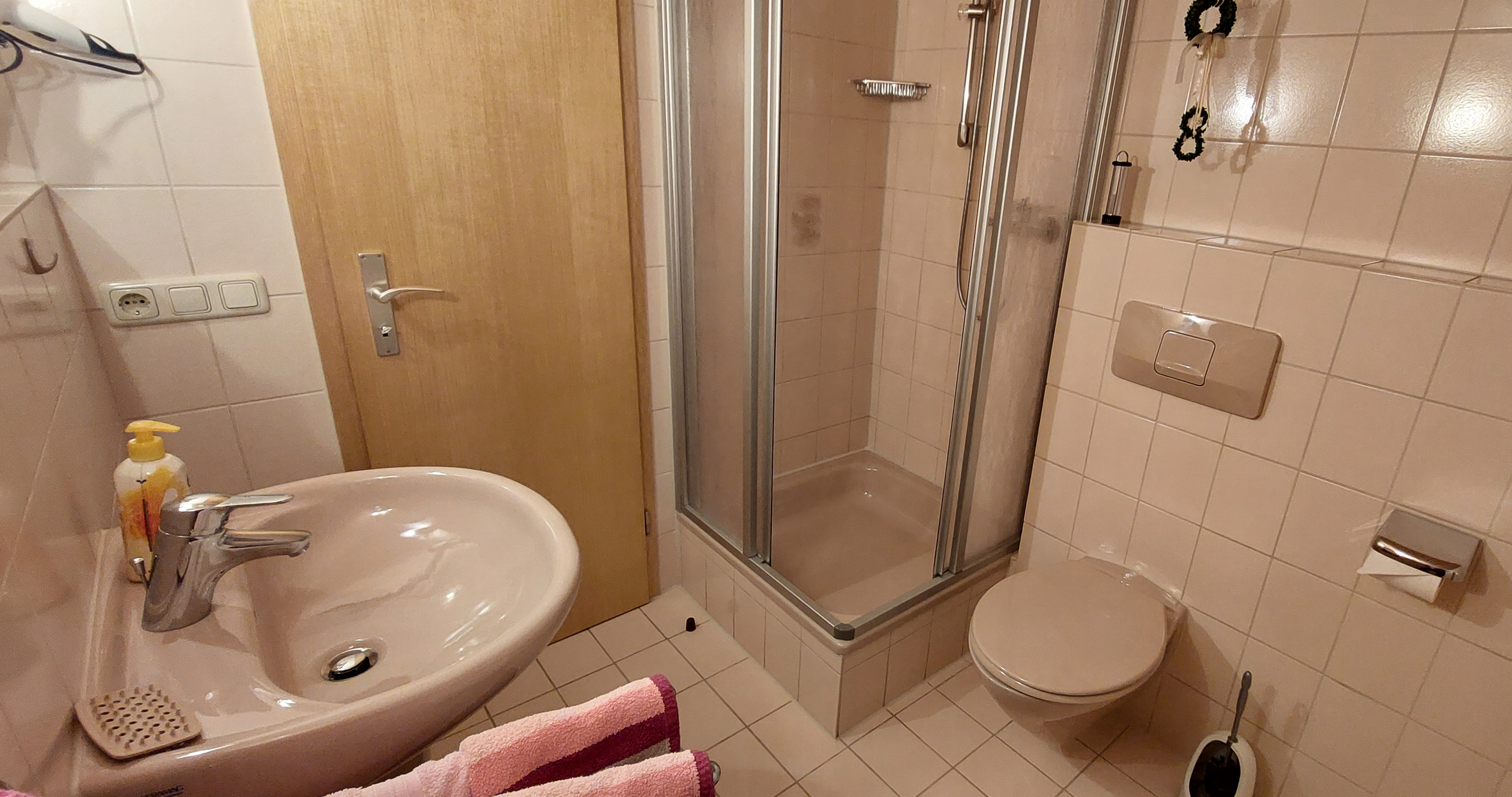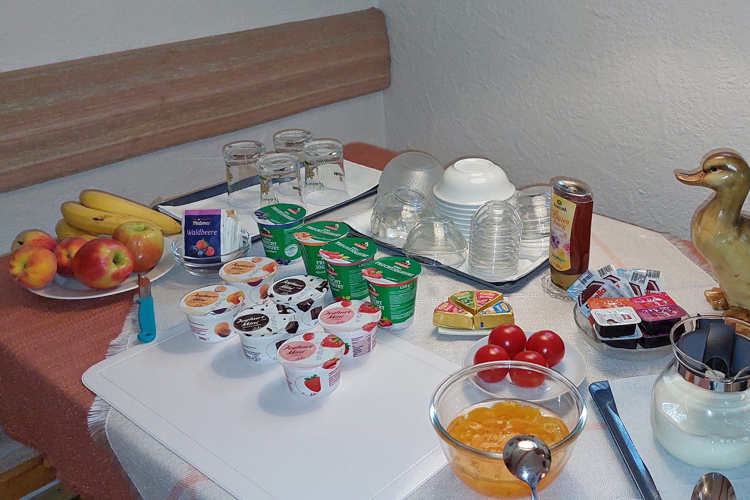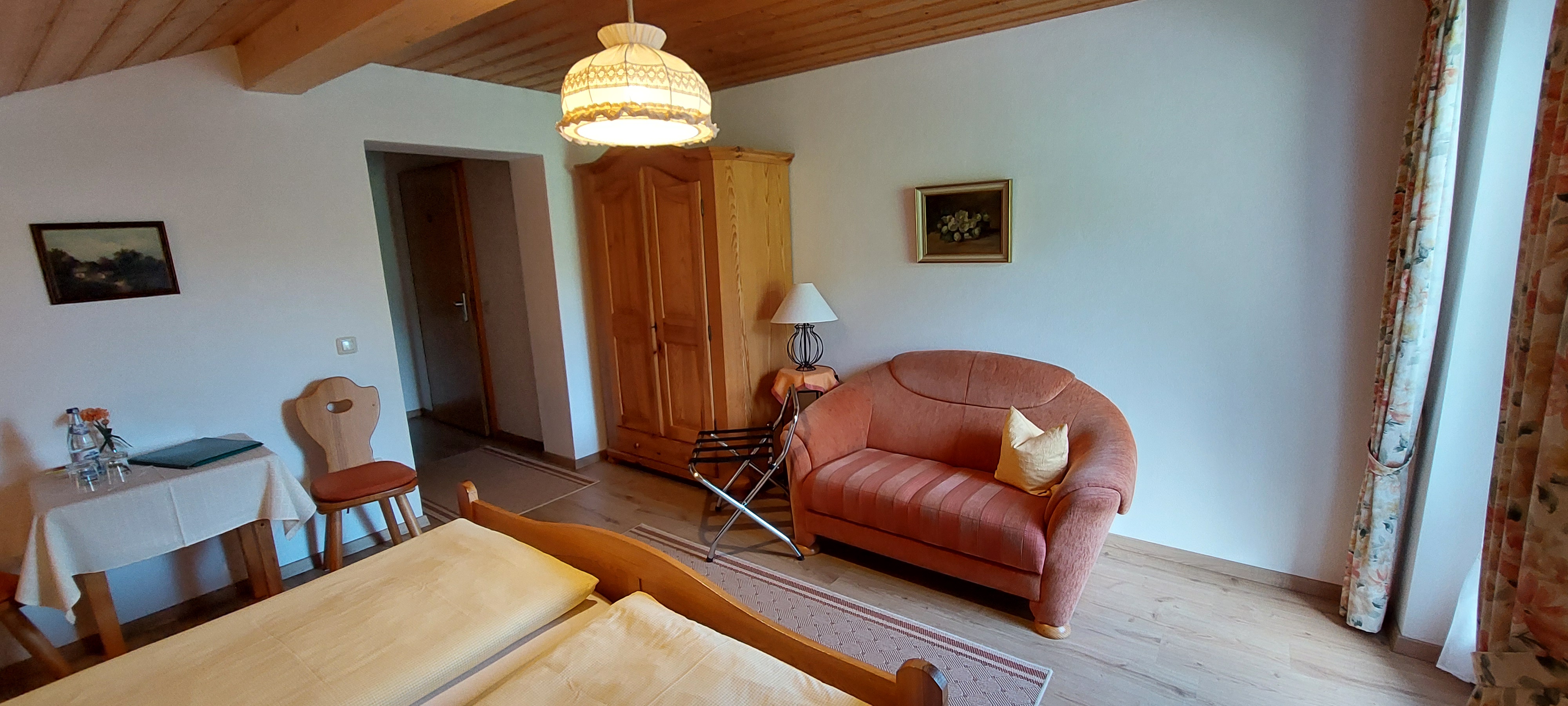 Helles Nichtraucher Doppelzimmer mit einem Doppelbett 2,00 x 1,80 m, Dusche/WC, Fön, kostenloses WLAN und Balkon. Gemütlicher Aufenthaltsraum mit Kabel-TV, Liegewiese und Terrasse. Frühstück servieren wir in unserem Frühstücksraum. Hunde und Haustiere dürfen nicht mitgebracht werden.