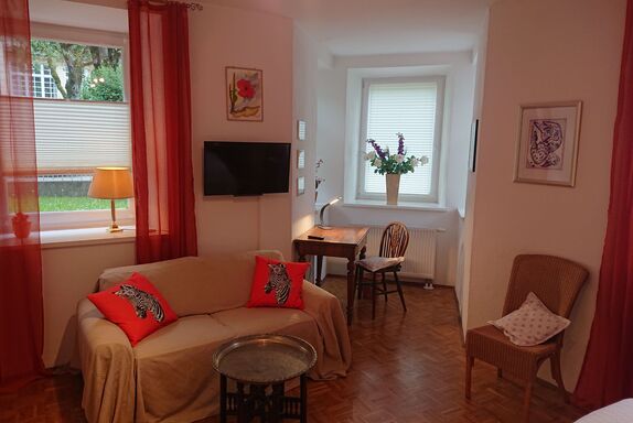 Sie sollen sich einfach wohlfühlen! Das geschmackvoll eingerichtete Apartment (67 m²) mit gehobener Ausstattung, in einer alten Villa in der Kurzone 1 gelegen, bietet Platz für vier Personen. Es ist aufgeteilt in ein Schlafzimmer mit Doppelbett und ein Wohnzimmer mit einer Schlafcouch. In einer voll ausgestatteten Küche mit gemütlicher Eckbank können Sie nach Ihren Tagesauflügen schnell ein leckeres Mahl bereiten. Auf der eigenen Terrasse genießen Sie schon vorher in der Abendsonne Ihren wohlverdienten Sundowner. Natürlich stehen in jedem Zimmer Flachbildfernseher und schnelles WLAN kostenfrei für Sie zur Verfügung. Auf dem Grundstück ist ein PKW-Stellplatz ausschließlich für Sie reserviert. Ihr mitgebrachtes Fahrrad können Sie in einem abschließbaren Raum ebenerdig diebstahlsicher abstellen. Das Bad Reichenhaller Wellnessparadies mit Bergblick, die RupertusTherme, ist zu Fuß gerade mal 2 Minuten entfernt und Sie können dort im Einklang mit der Natur die wohltuende Kraft und Wirkung warmer Bad Reichenhaller Alpensole aus dem Meer der Urzeit genießen. Mit dem Reichenhaller Citybus - die Haltestelle ist 1 Minute entfernt - gelangen Sie auch bequem in die ansonsten fußläufig leicht zu erreichende Reichenhaller Innenstadt und zum Hauptbahnhof.