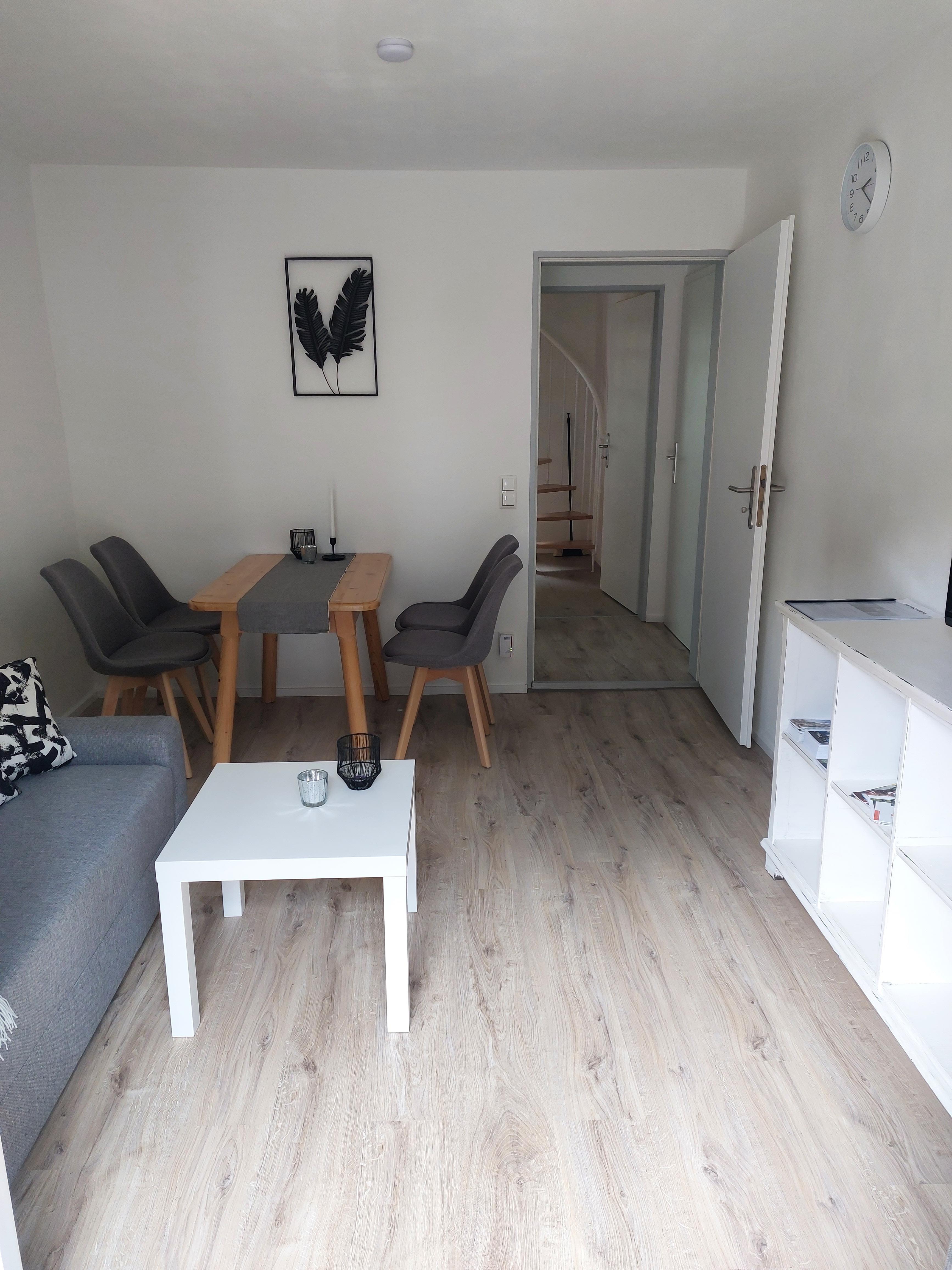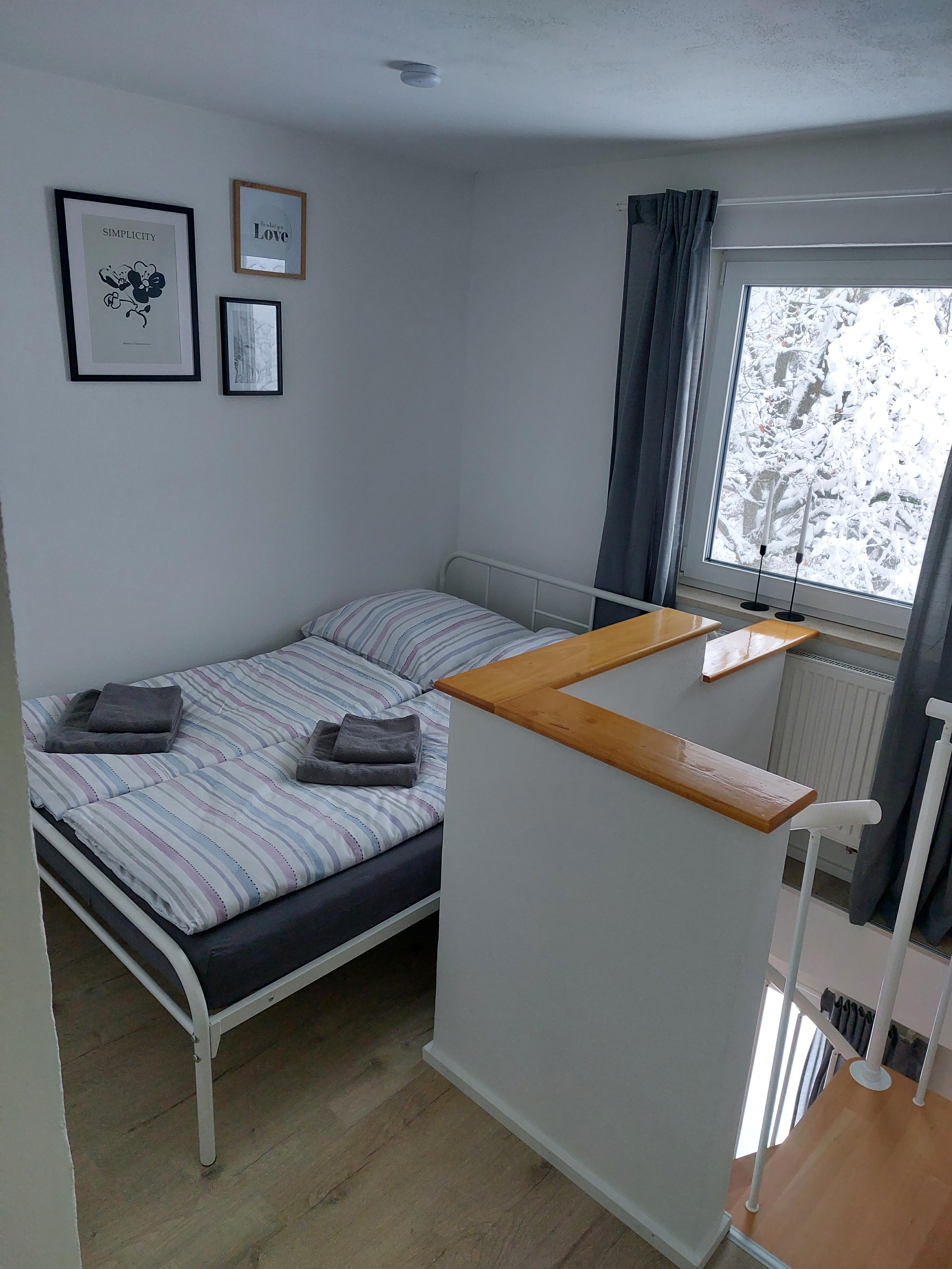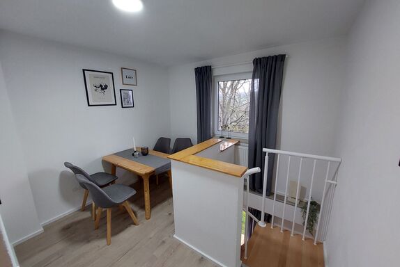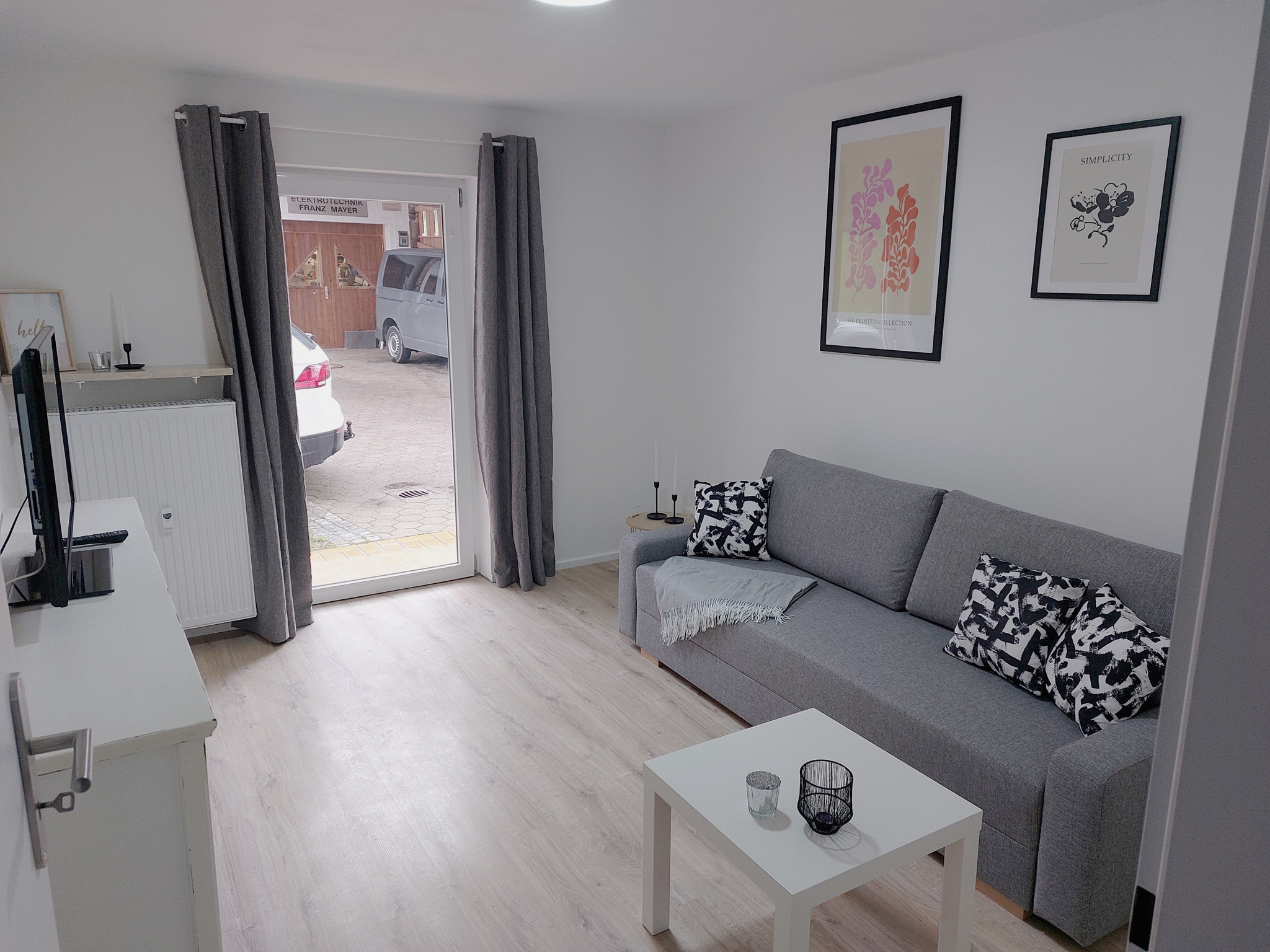 Unsere liebevoll eingerichtete Ferienwohnung (50 qm) für bis zu 4 Personen befindet sich am Ortsrand von Waging am See, direkt am Waldrand, idyllisch über Waging gelegen. Sie wurde im Jahr 2023 umfangreich saniert und lädt zu einem unbeschwerten Urlaub am wärmsten Badesee Oberbayerns ein. Auch Kinder sind bei uns herzlich willkommen. Die Wohnung erstreckt sich über zwei Geschosse. Im Erdgeschoss verfügt sie über eine gemütliche und voll ausgestattete Küche mit Kaffeepadautomat, ein geschmackvoll eingerichtetes Wohnzimmer / Esszimmer mit Flachbild-Fernseher und ein separates Bad mit begehbarer Dusche und Handtuchtrockner. Rauf über die Wendeltreppe gelangen Sie in ein kleines Zimmer mit französischem Doppelbett. Von da aus kommen sie in ein separates Schlafzimmer mit extra Badezimmer. Vom Balkon aus blicken sie auf eine natürliche Blumenwiese mit alten Obstbäumen. Zur Wohnung gehört außerdem eine Terrasse im Innenhof, auf der die Geselligkeit bestimmt nicht zu kurz kommt. In der gesamten Wohnung steht Ihnen kostenloses WLAN zur Verfügung.