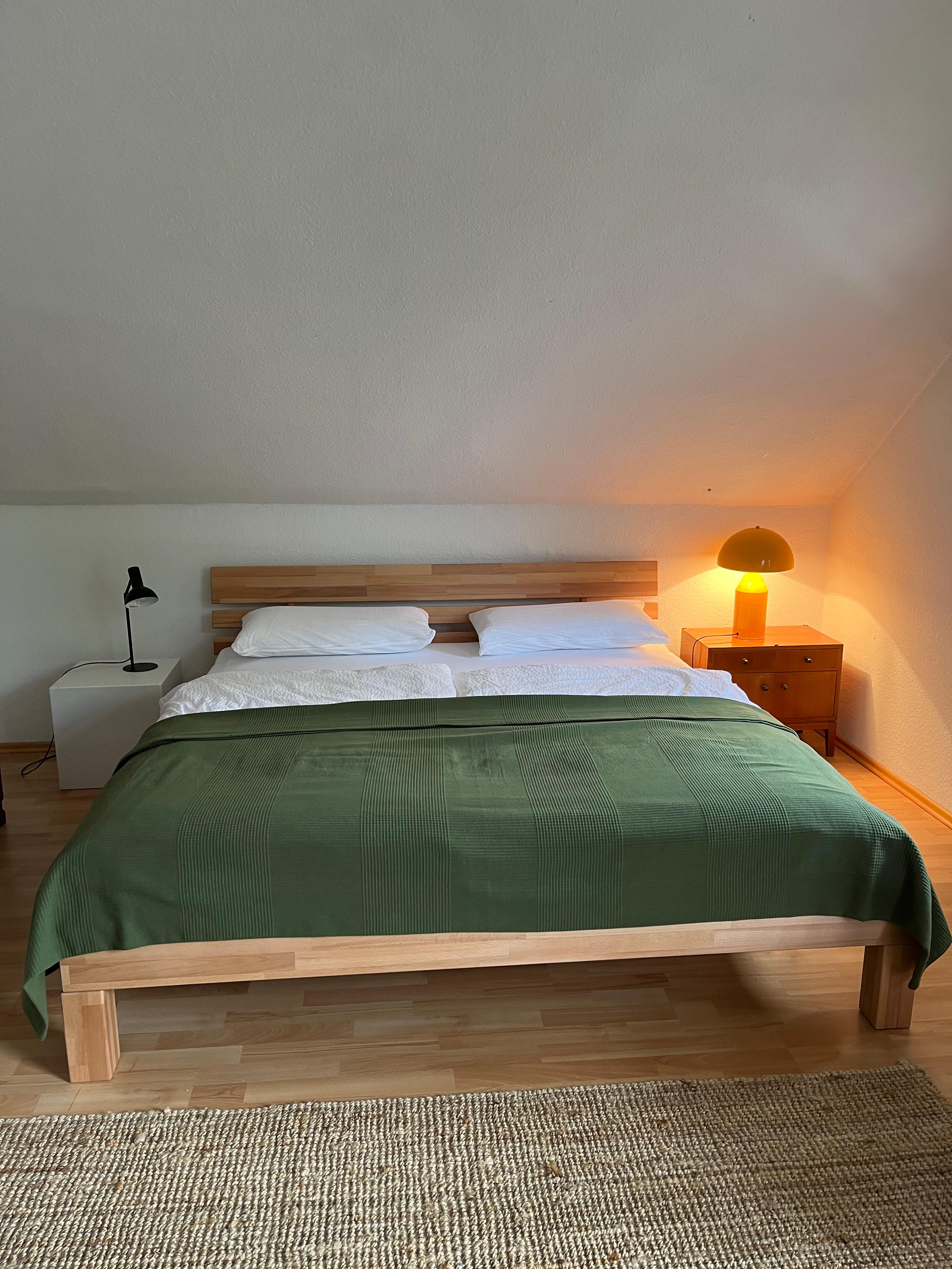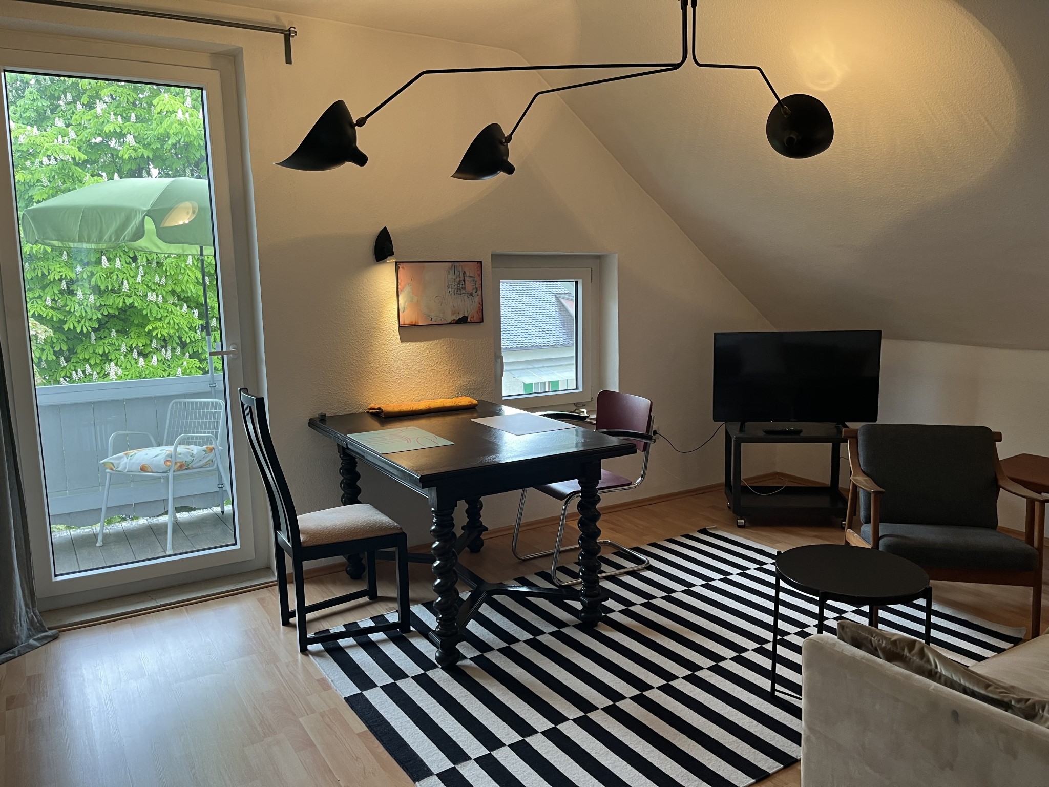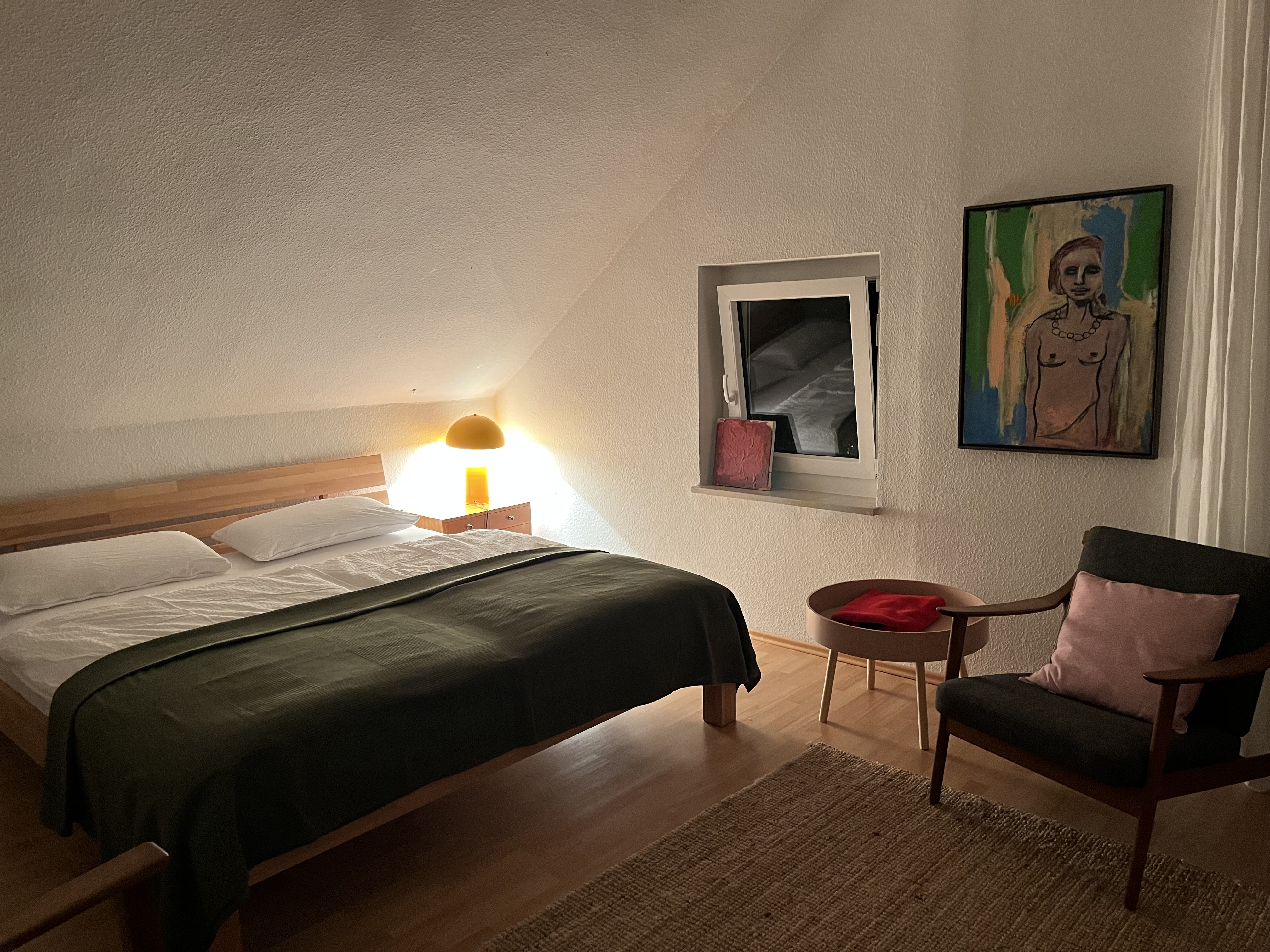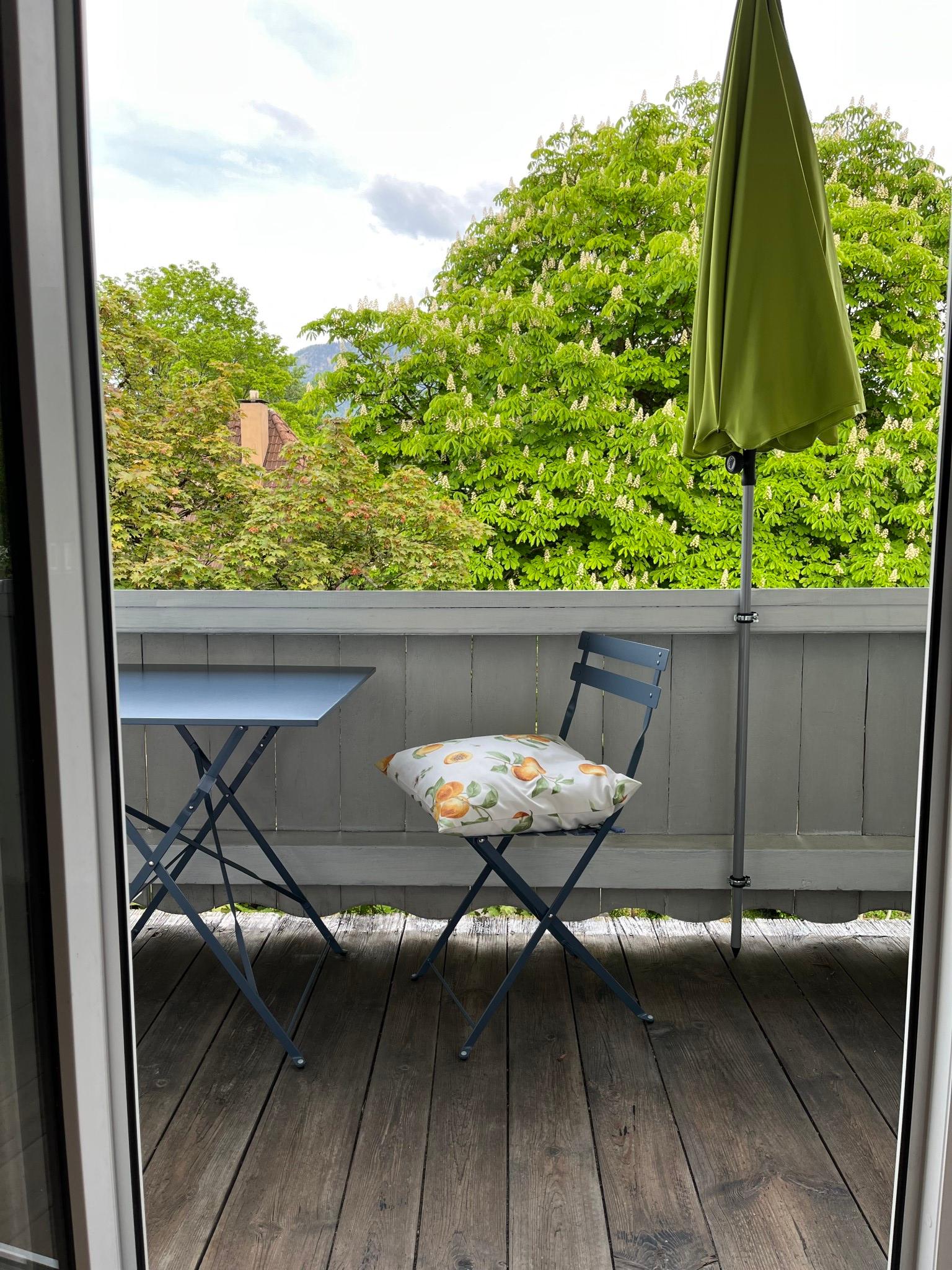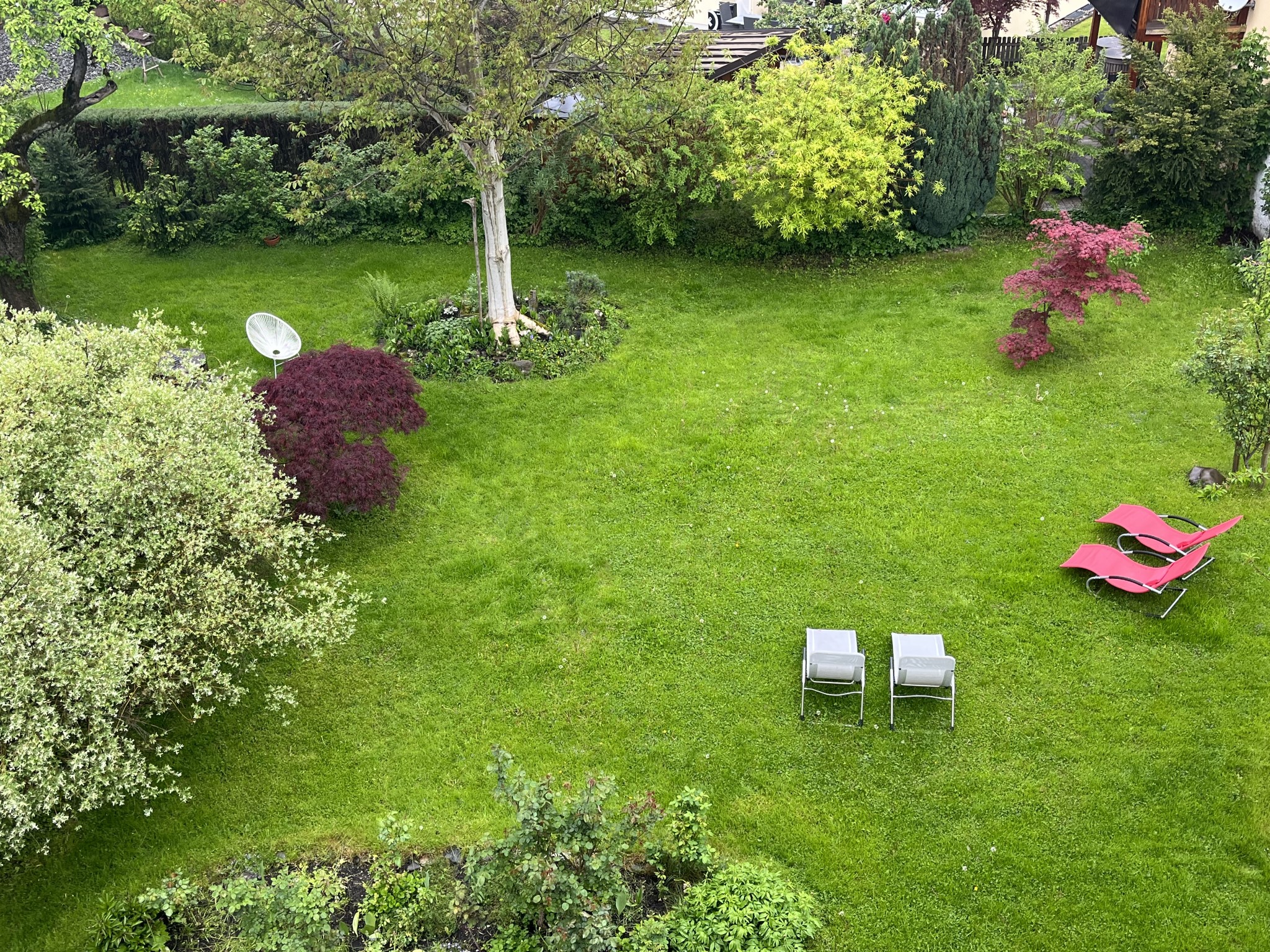 Die charmante, großzügige Dachgeschosswohnung ist liebevoll und individuell eingerichtet und lädt zum Relaxen ein. Das Wohnzimmer verfügt über ein großes Sofa zum Entspannen, das auch als zusätzlicher Schlafplatz verwendet werden kann. Ein TV, kostenloses W-Lan, ein digitales, tragbares Radio, verschiedene Spiele und Bücher stellen sicher, dass keine Langeweile aufkommt. Das Schlafzimmer verfügt über ein großes Doppelbett und bietet, wie das Wohnzimmer einen direkten Zugang zum Balkon, wo sich die erste Tasse Kaffee am Morgen oder das letzte Glas Wein am Abend, mit dem Blick auf die Berge, fabelhaft genießen lässt. Die Küche ist komplett mit Spülmaschine, Kühl-Gefrierschrank, Herd, Kaffeemaschine, Espressokanne einen Toaster und ausreichendem Kochgeschirr ausgestattet. Das großzügige Bad mit Fenster, das einen Blick auf die Berge und den Garten freigibt, verfügt über eine Badewanne mit Duschvorrichtung, ein Waschbecken und eine Waschmaschine. Die Toilette ist vom Bad getrennt. Auch der große Garten des Hauses kann benutzt werden. Es gibt dort einen ausgewiesenen Gästebereich. Ein Parkplatz im Anwesen steht zur Verfügung.
