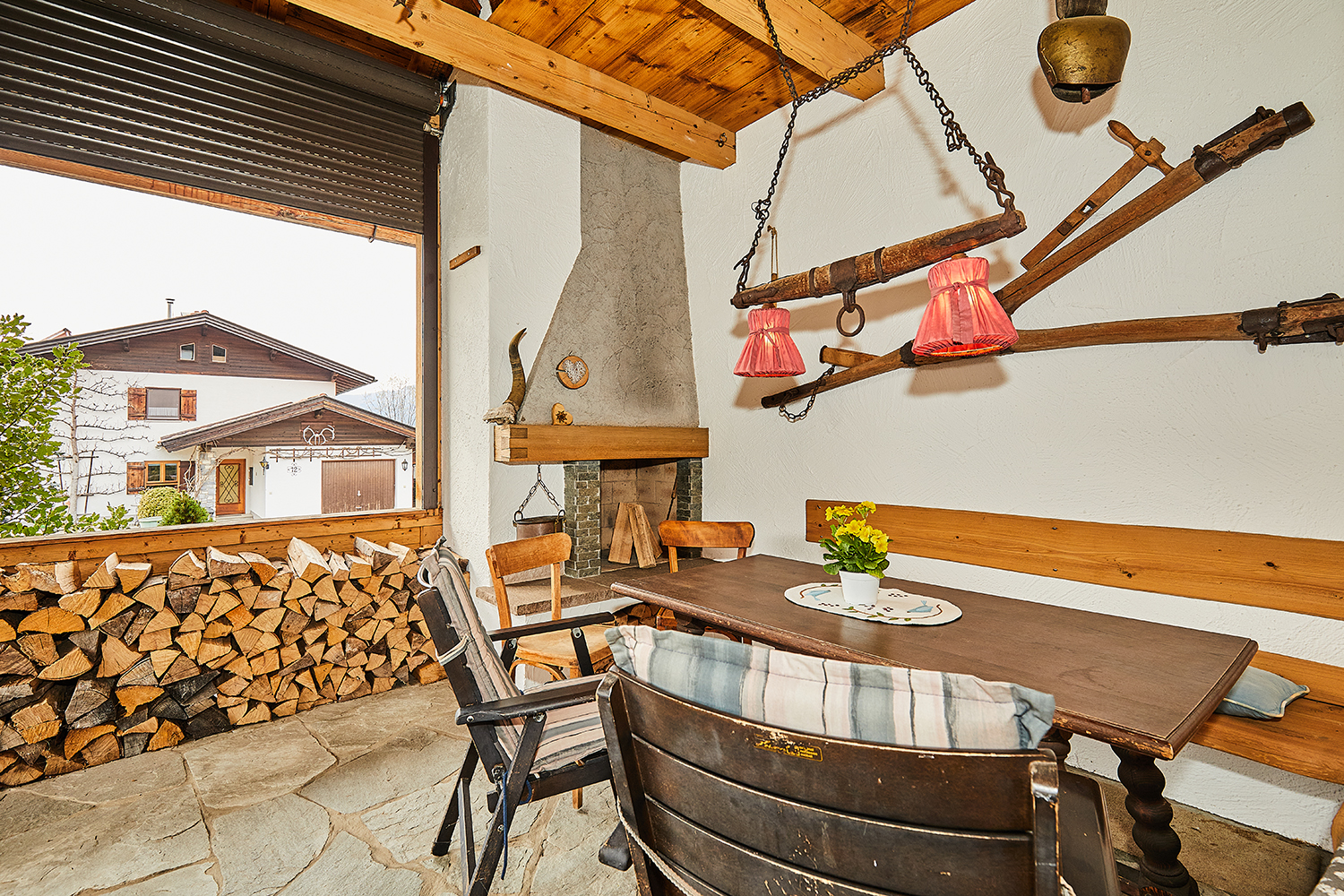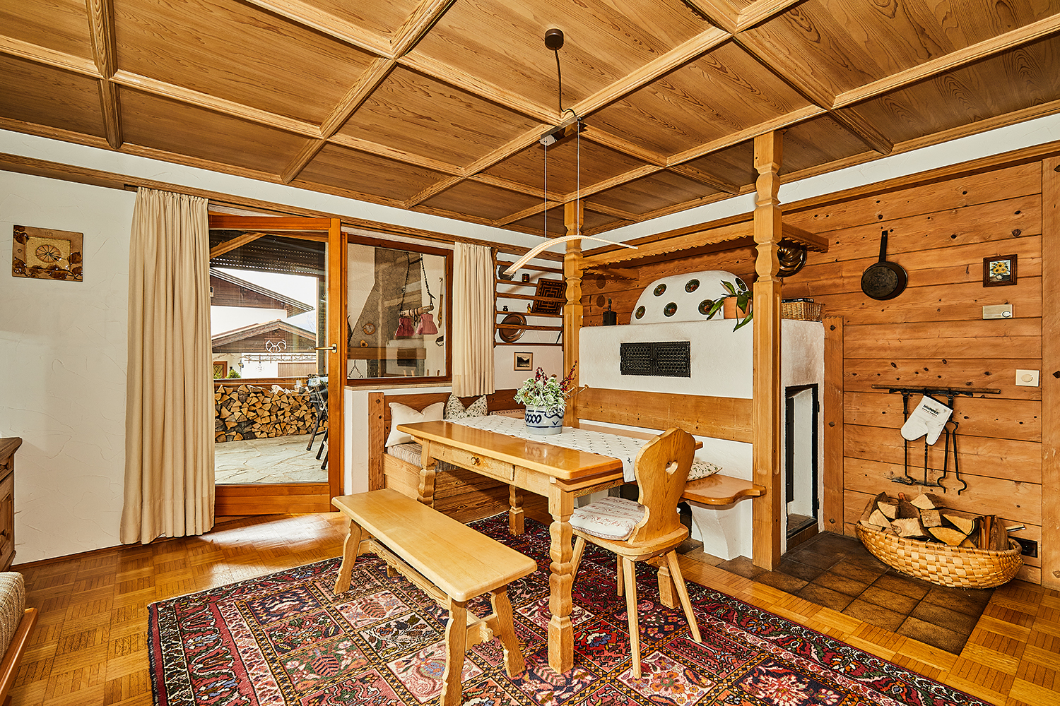 Kachelofen und überdachte Terrasse. In der großen, gut ausgetatteten Küche können Sie Ihre Malzeiten vorbereiten und dann im großen Esszimmer verzehren. Ihr Vorteil als unser Gast: Wir sind