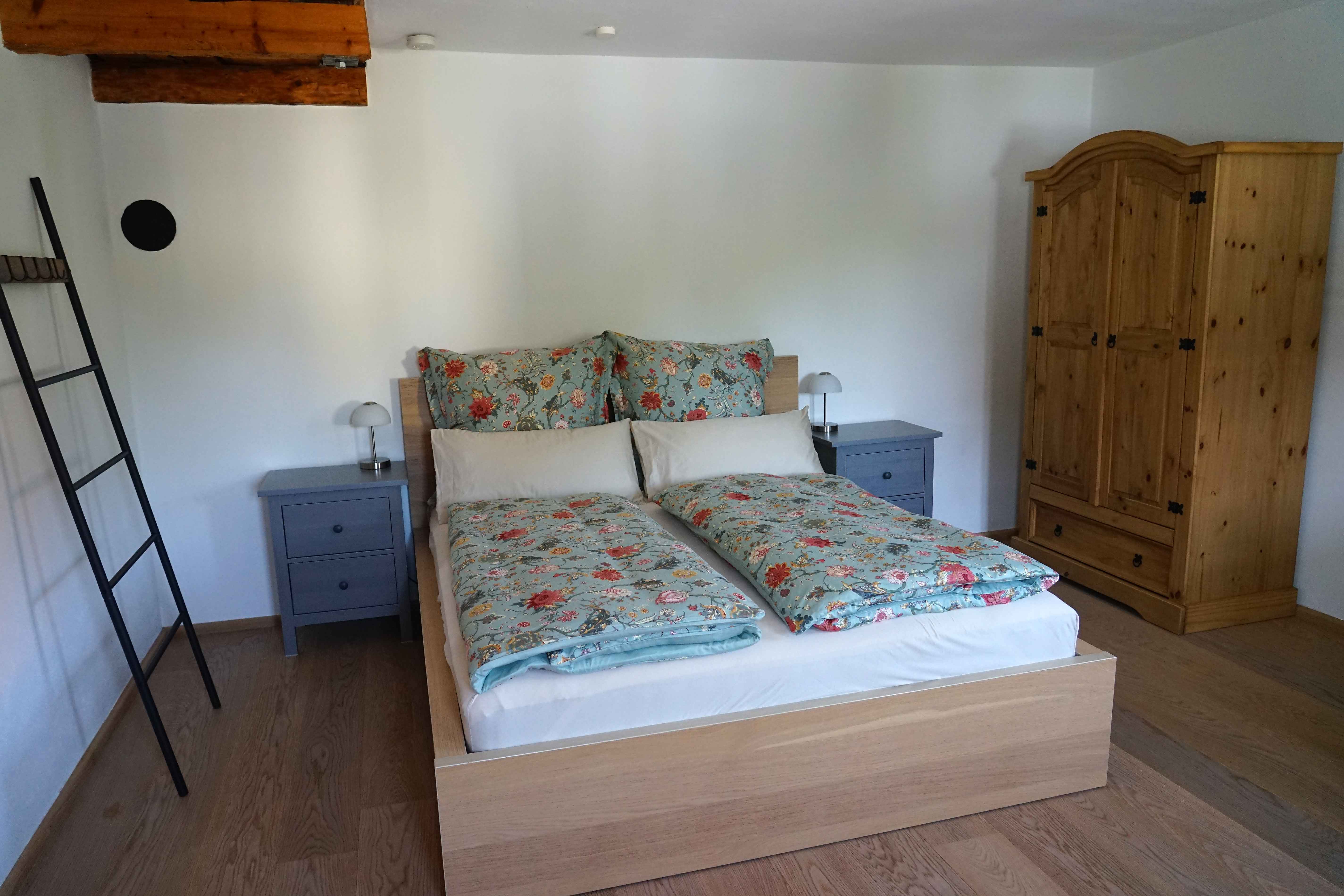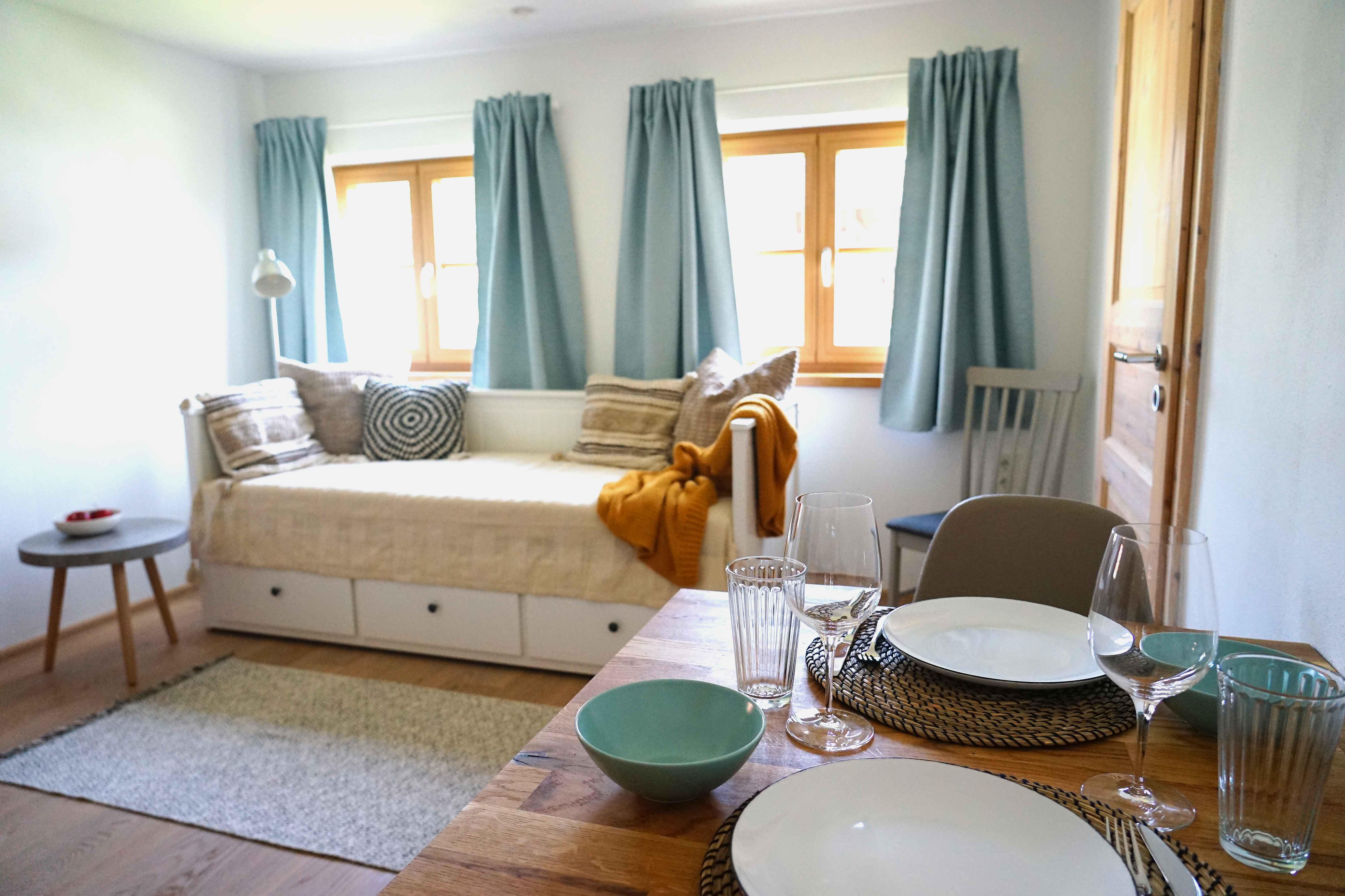 Die ca. 50 m² große, ruhig gelegene und sonnige 2-Zimmer-Wohnung mit Schlafzimmer (Doppelbett 160x200), Wohn-/Esszimmer (mit Esstisch, ausziehbarem Tagesbett und TV), Küche, Bad mit Fenster und Dusche + Flur mit Garderobe befindet sich im ersten Stock. Alle Zimmer sind mit Fenstern und moderner Fußbodenheizung, Parkett und Fliesen ausgestattet. Auf dem Stockwerk befindet sich außerdem ein kleiner Westbalkon mit Sitzgarnitur. Die Küche ist mit Geschirrspüler, Kaffeemaschine, Bio-Gewürzen, Bio-Tee und -Kaffee sowie Essig/Öl voll ausgestattet. WLAN, Netflix und ein Parkplatz im Hof sind kostenlos. Direkt im Hof befindet sich (gegen Aufpreis) eine Lademöglichkeit für Elektrofahrzeuge. Im Zimmer liegen Yogamatten für dich bereit.