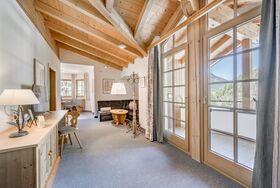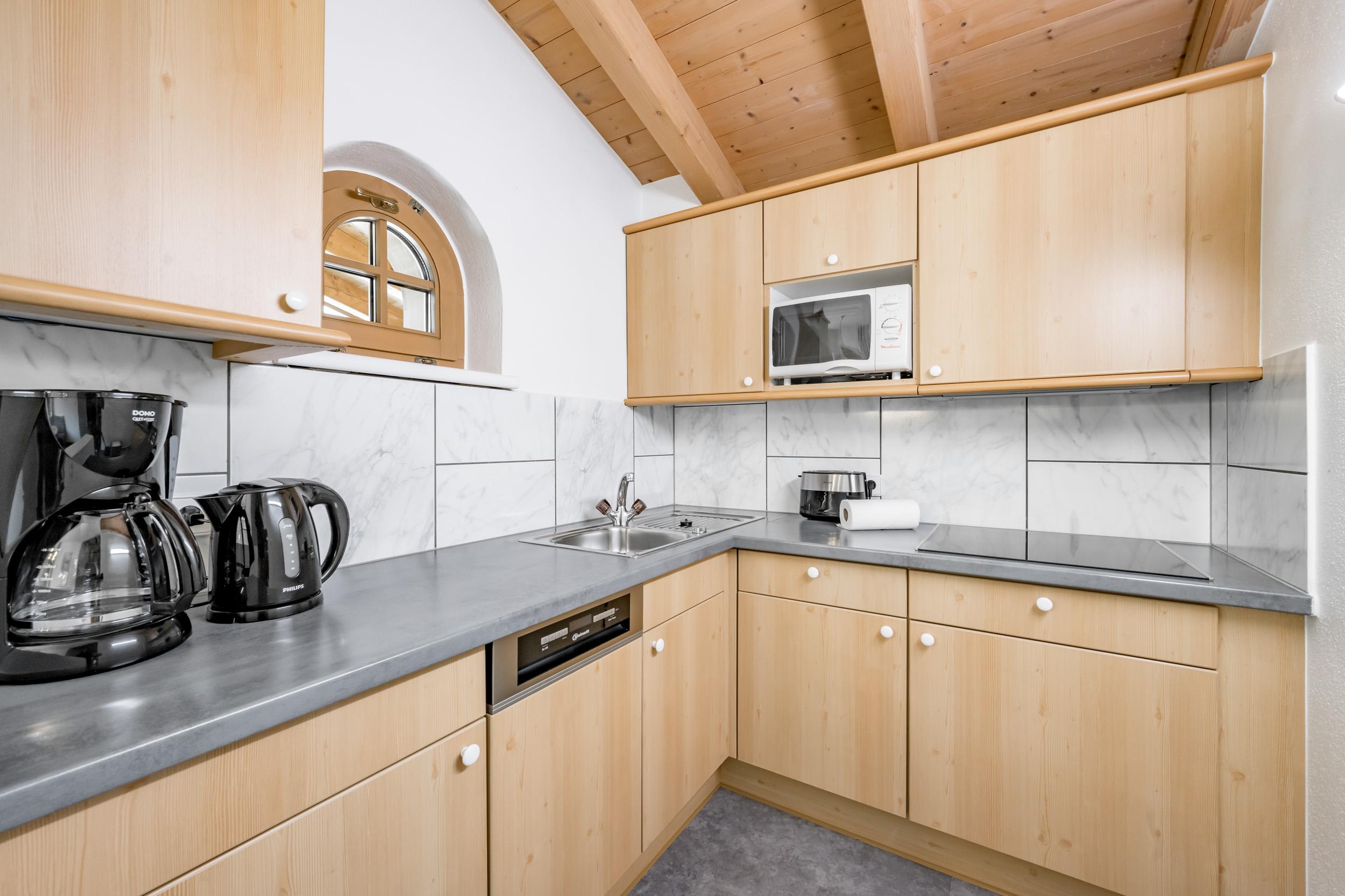 Großzügiges Appartement Nr. 6 (ca. 72 m²) im 2. OG mit Sichtdachstuhl und Balkon, gemütlichem Wohnraum mit ausziehbarem Sofa, offener, voll ausgestatteter Küchenecke (Cerankochfeld, Mikrowelle, Geschirrspüler, Kaffeemaschine, Wasserkocher uvm.) und mit Essecke im Erker, 1 Doppelzimmer mit Badezimmer (Dusche/WC und Haarföhn), 1 Doppelzimmer, 1 Badezimmer mit Badewanne/WC und Haarföhn, Kabel-TV.