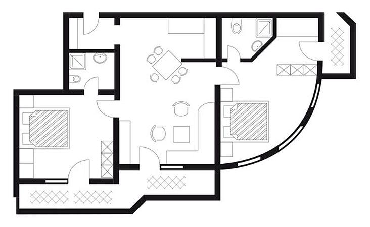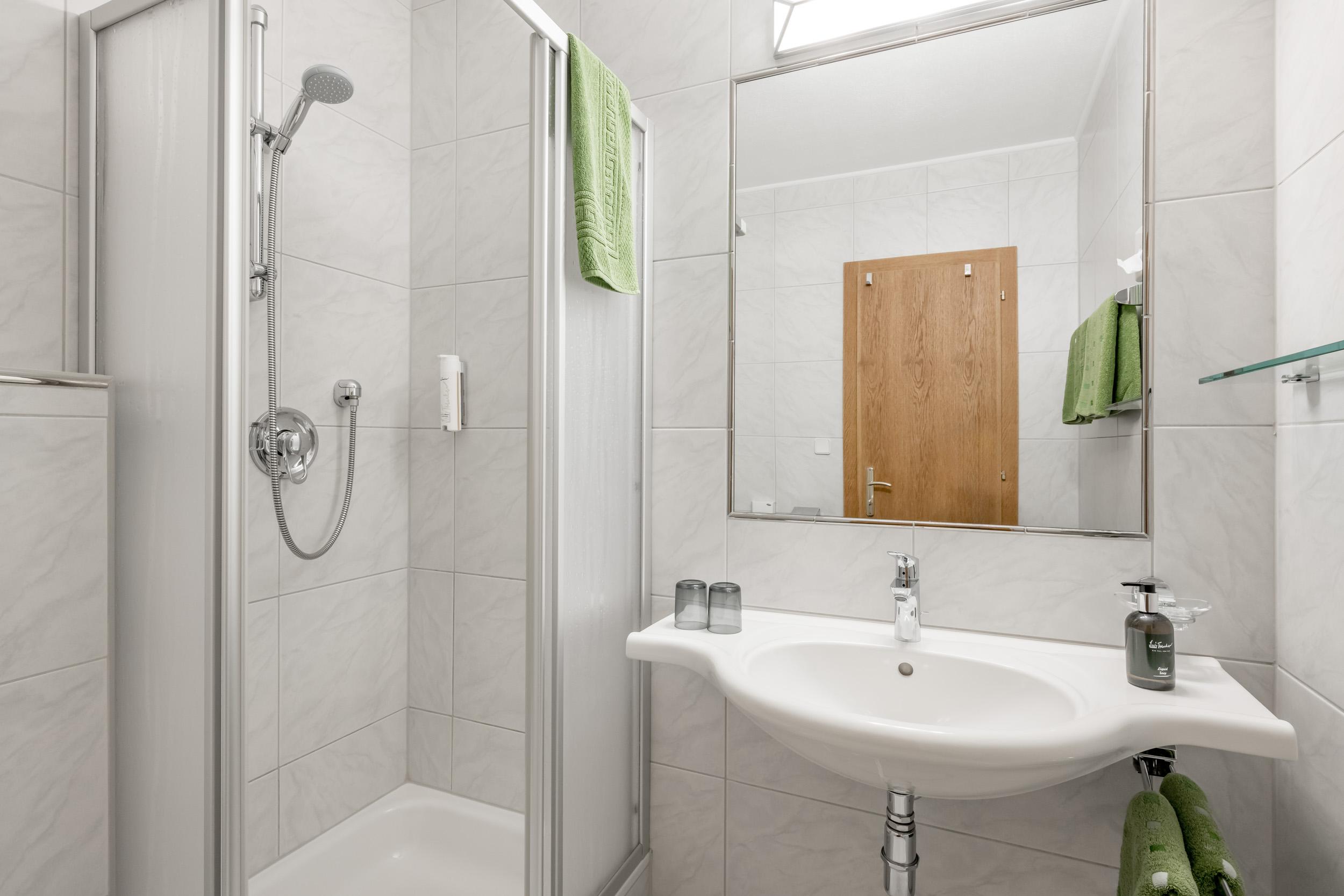 Großzügiges Appartement Nr.2 (ca. 87 m²) im 1. OG mit Balkon, gemütlichem Wohnraum mit offener und voll ausgestatteter Kochecke (Cerankochfeld, Mikrowelle, Geschirrspüler, Kaffeemaschine, Wasserkocher uvm.) und gemütlicher Essecke, 2 Doppelzimmer mit jeweils einem Badezimmer mit Dusche/WC und Haarföhn, Kabel-TV.