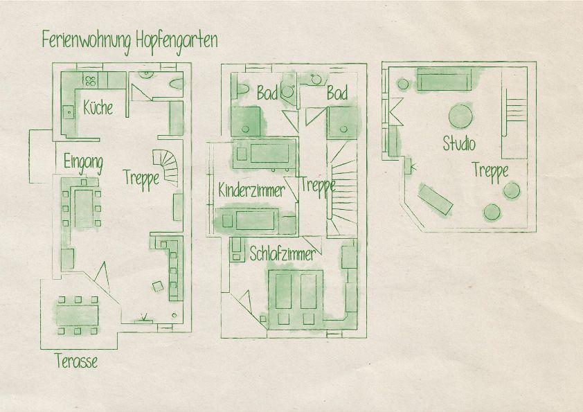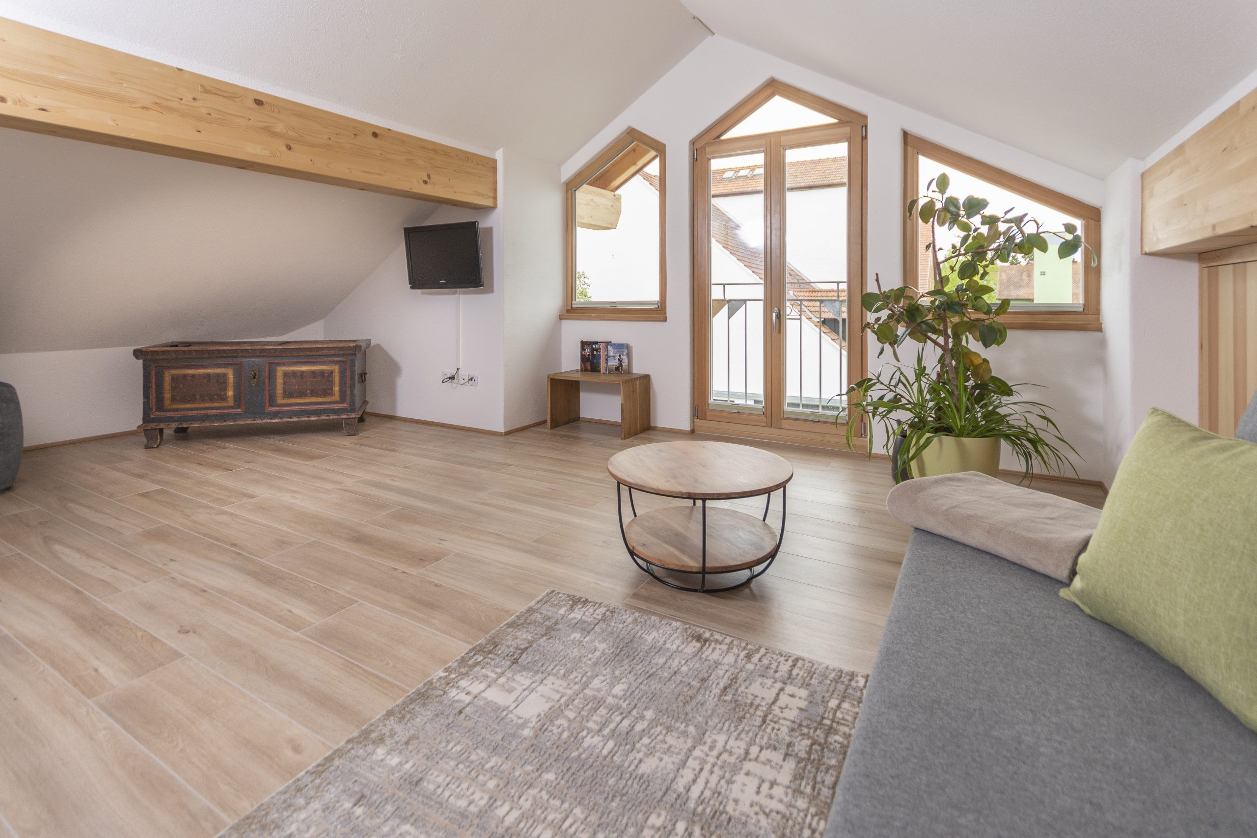 Im EG befinden sich die Küche und der Wohn-/Essbereich mit direktem Zugang zu Ihrer eigenen Terasse. Hier genießen Sie Ihr Frühstück in der Morgensonne oder ein Glas Wein zum Sonnenuntergang. Im OG finden Sie das Elternschlafzimmer mit einem kleinen Balkon, ein Kinderzimmer direkt daneben und 2 Bäder. Im DG erwartet Sie ein Studio mit dem Blick in den Hof und über Lilling. Dieses Studio ist Ihr Rückzugsort für gemütliches Relaxen, kann aber auch als drittes Schlafzimmer oder zweites Wohn-/Spielzimmer genutzt werden. Im Studio können auch noch bis zu 2 Personen übernachten.