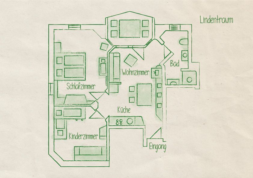 Unsere Ferienwohnung Lindentraum befindet sich im ersten Stock des Gästehauses und umfasst 55m². Sie hat 2 Schlafzimmer (Elternschlafzimmer, Kinderzimmer) und einen Südbalkon mit traumhaftem Blick über unseren Obstgarten. Die Wohnung eignet sich gut für bis zu 2 Kinder. Ein zusätzliches Kinderbett befindet sich im Elternschlafzimmer.