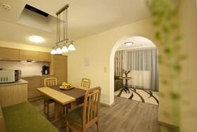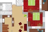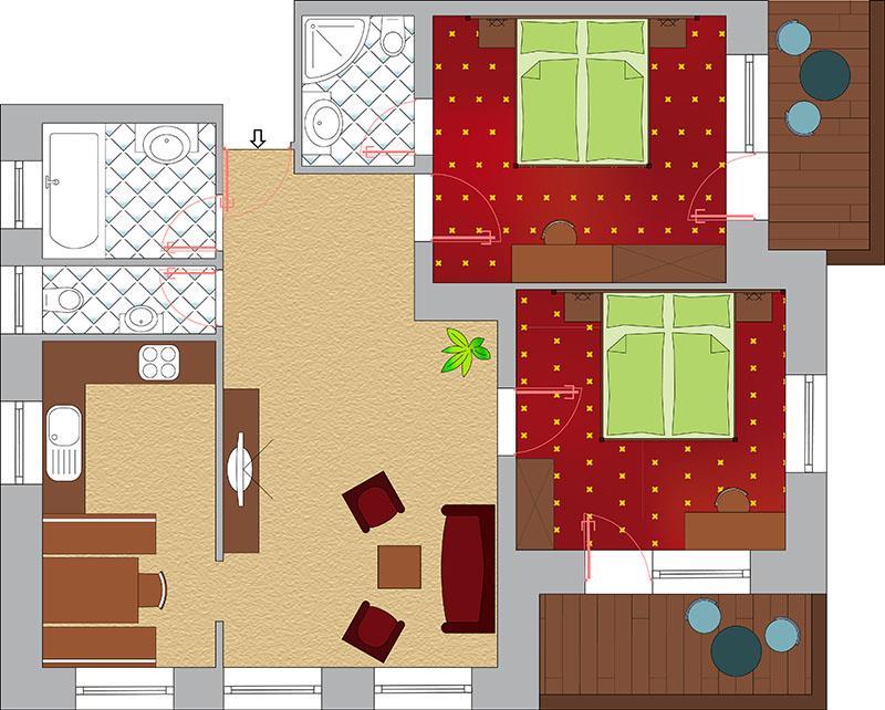 Luxuriöses Appartement mit 2 getrennten Schlafzimmer, 1 Dusche/WC, 1 Bad, separates WC, Wohnzimmer mit Couch, Küche mit alle E-Geräten, Flat TV w-lan und Balkon. Größe: 63 bis 65 m².