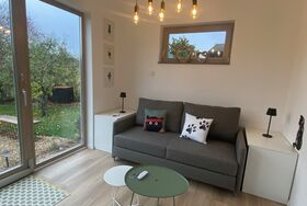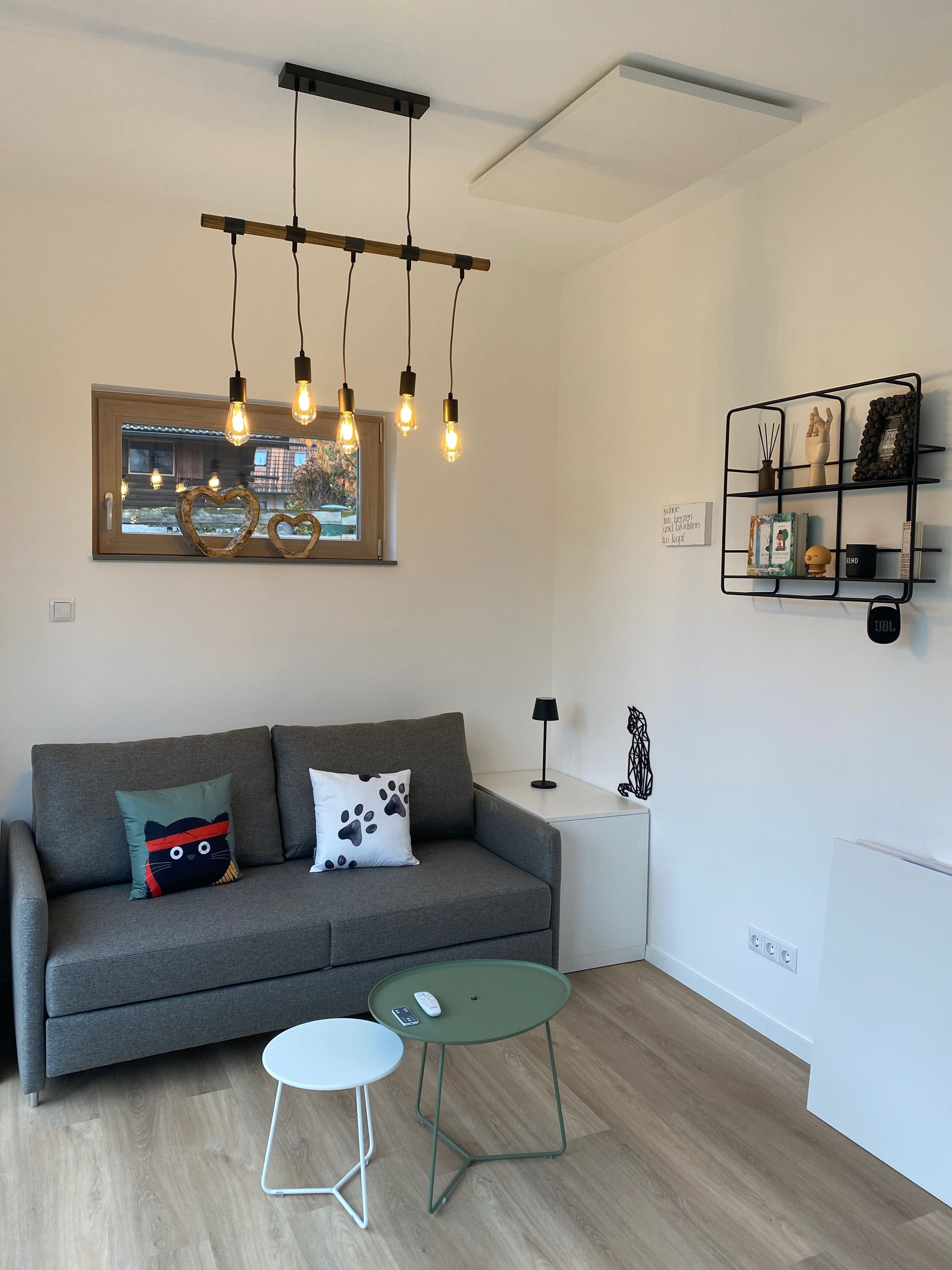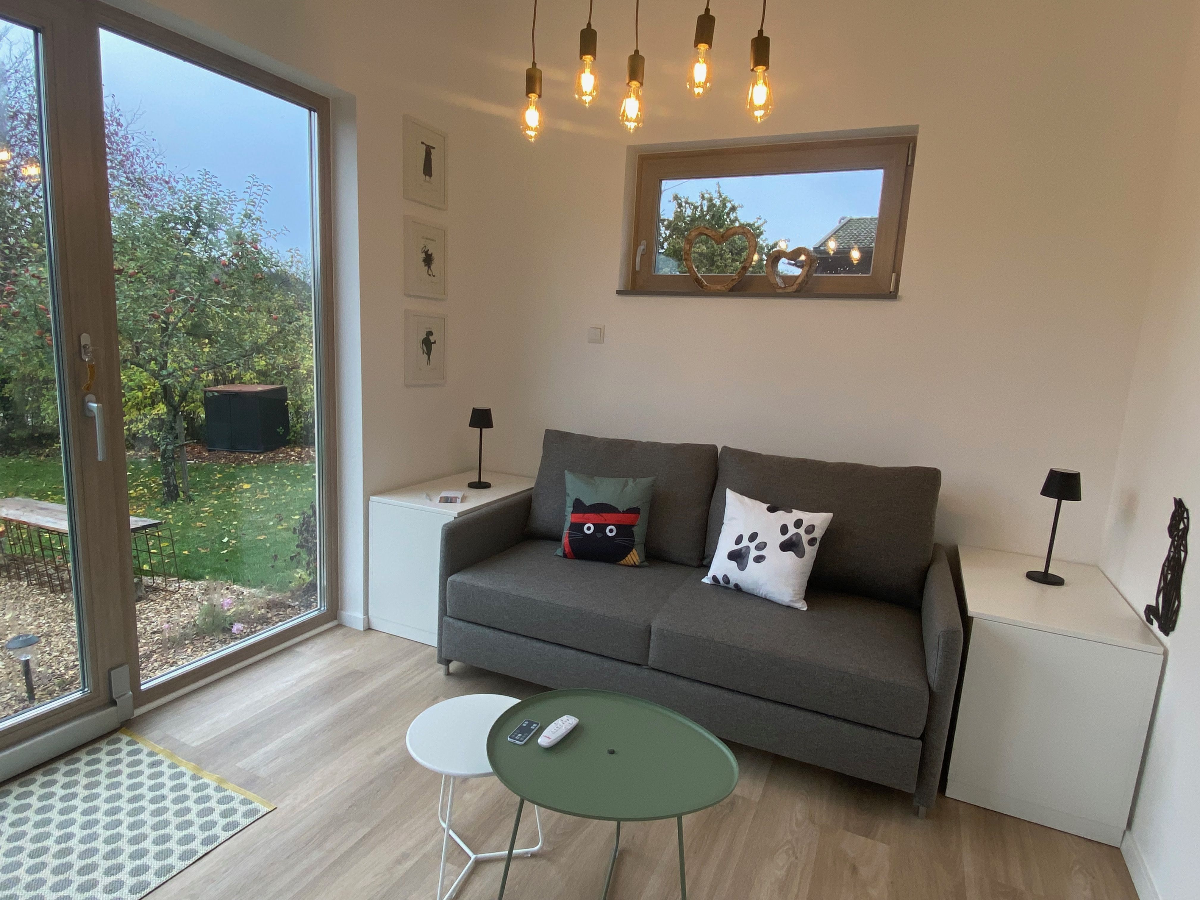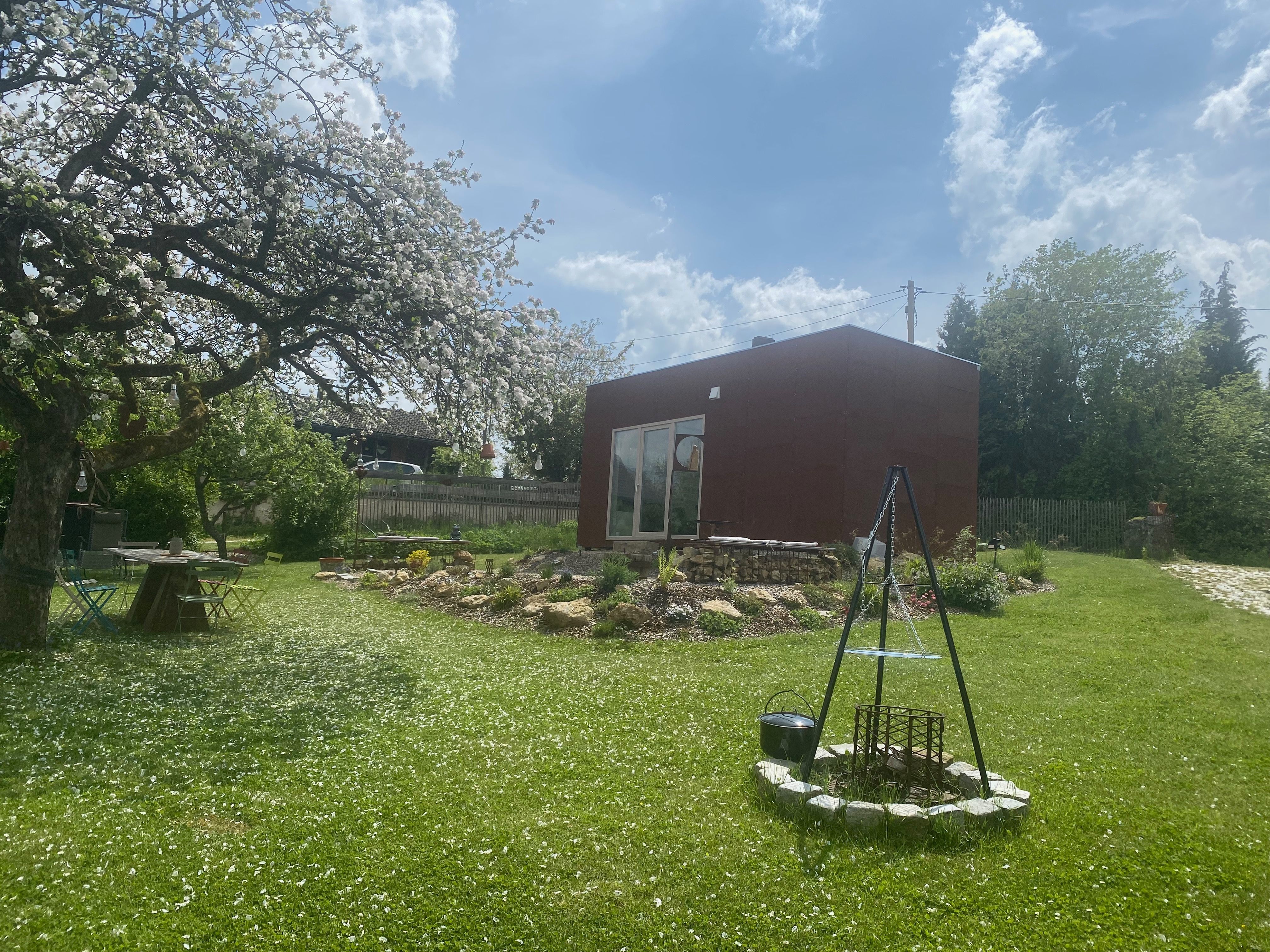 Unser kleines, aber feines Haus steht inmitten eines alten Obstgartens. Vom Hotelschlafsofa/Chillarea (160×200) über Esstisch, Küchenzeile, großzügigem Bad und großen Kleiderschrank, verfügt unser Tiny House über alles, was man für ein paar entspannende Tage benötigt. Ein großer Tisch unter dem Apfelbaum, Gartenliegen und eine Feuerstelle mit Grill und Suppentopf laden zum verweilen in der Natur ein.