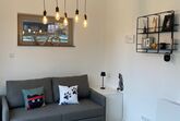 Wohn-, Schlafraum mit hochwertiger Schlafcouch und Küchenzeile incl. Klapptisch. Bad mit ebenerdiger Dusche und Regenbrause, großer Einbauschrank