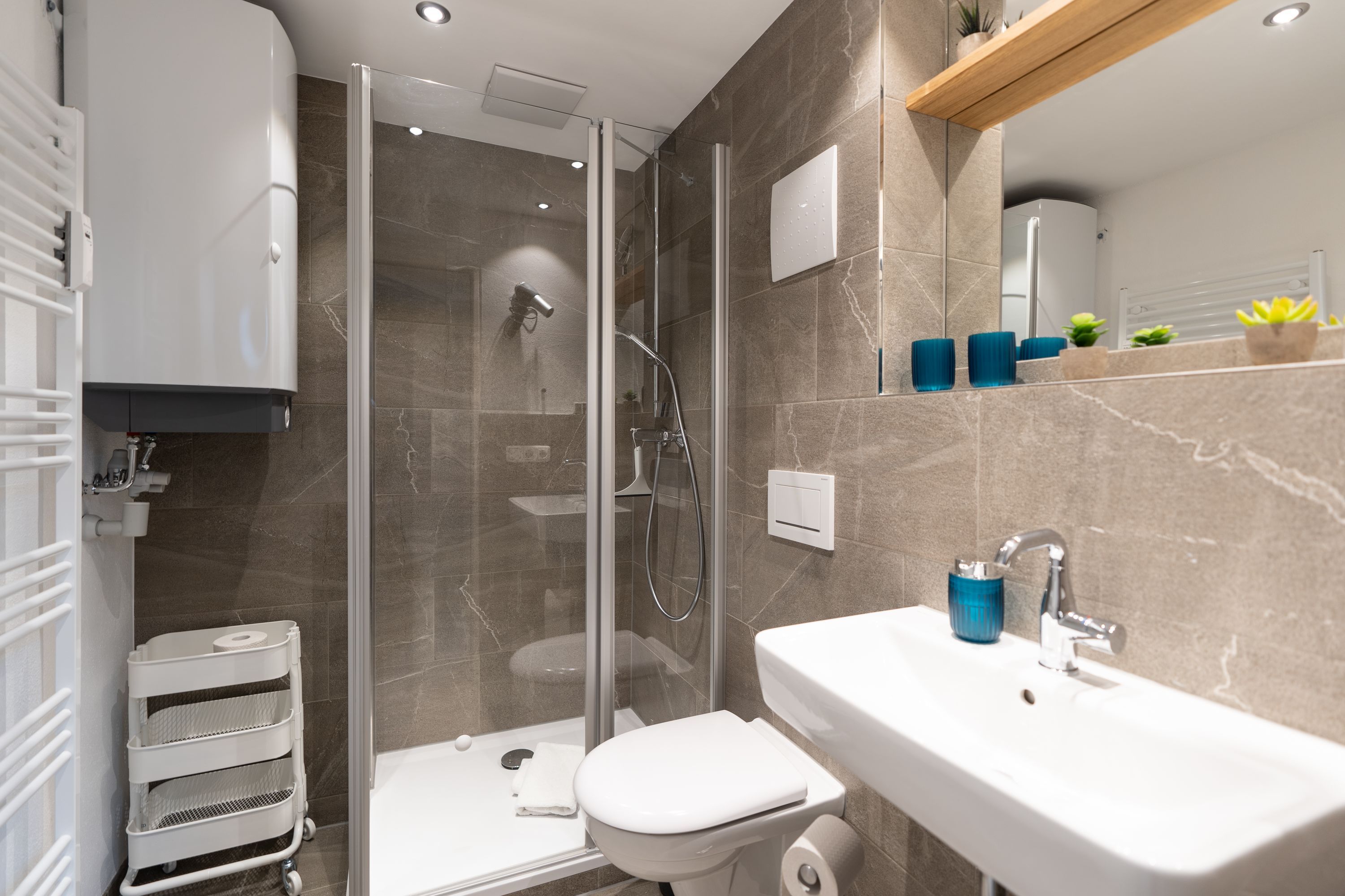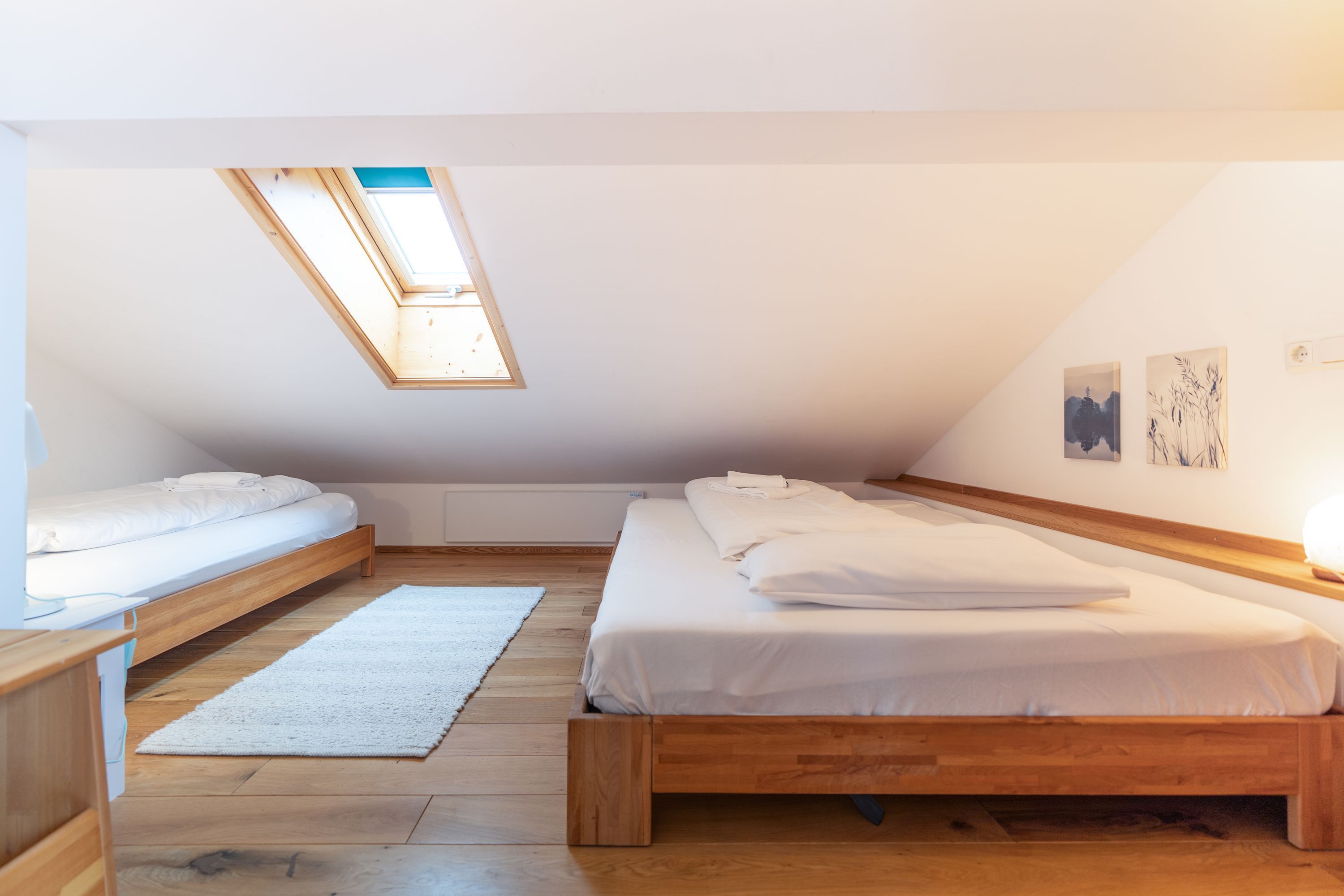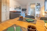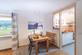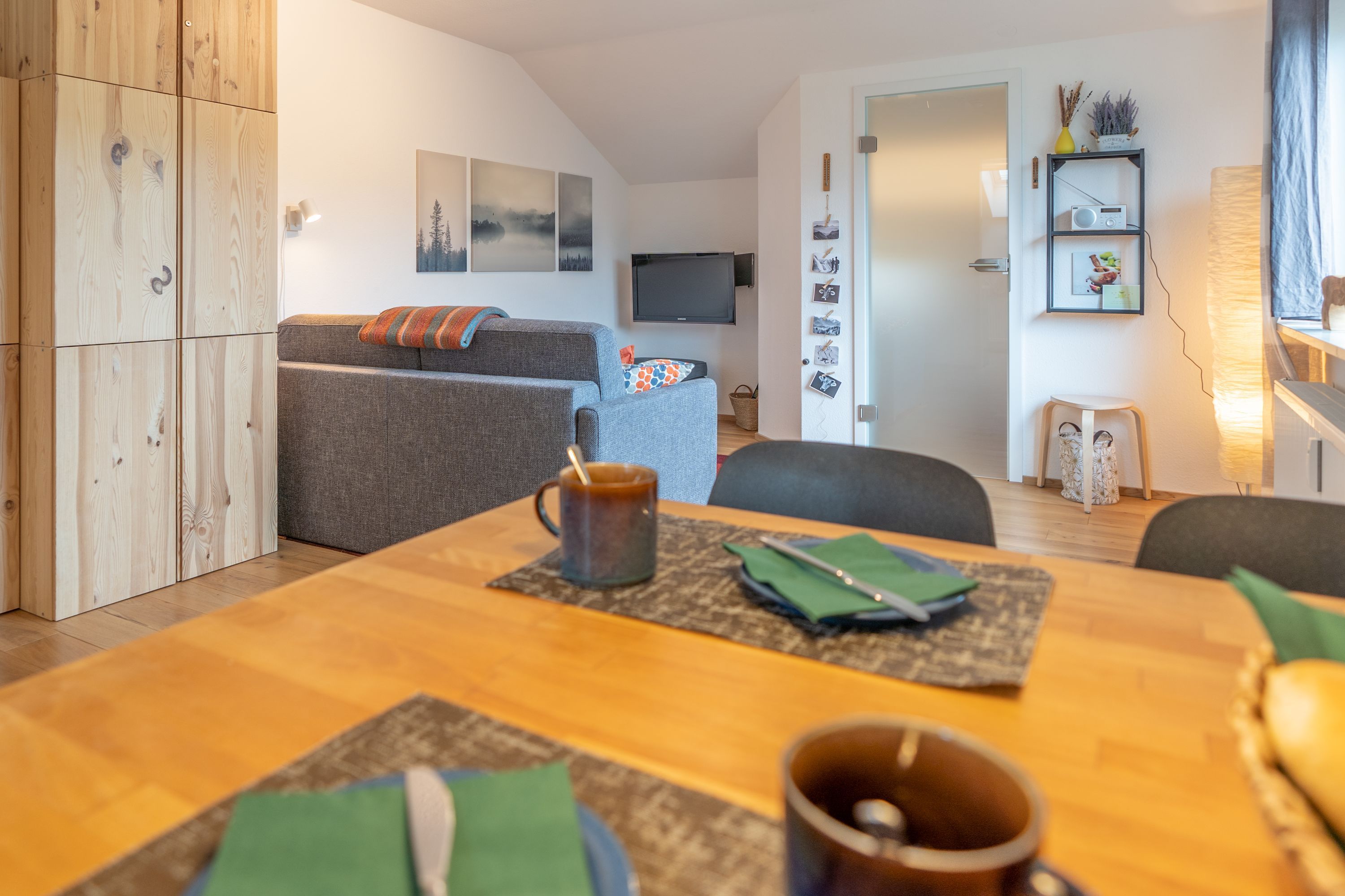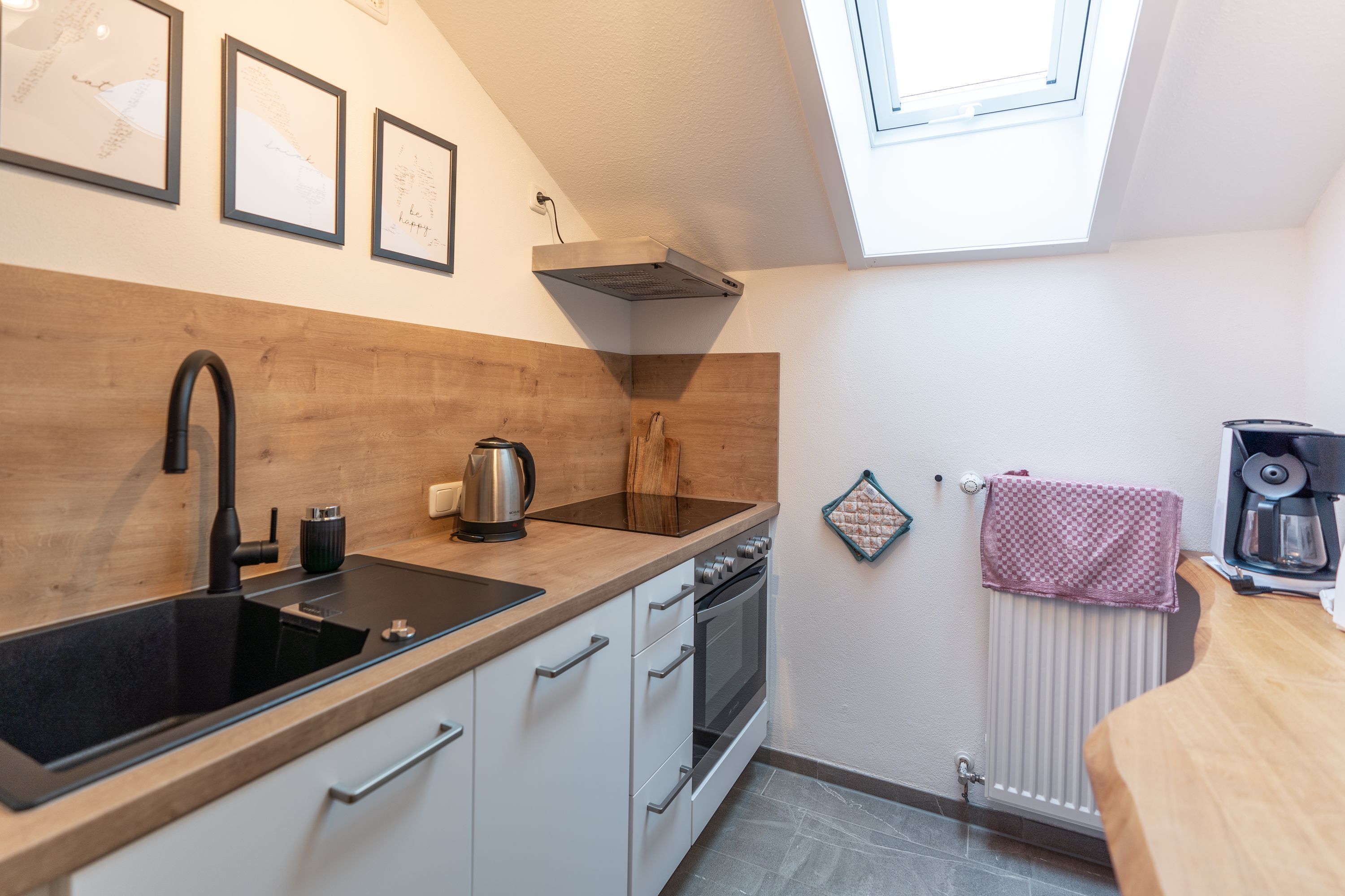 Die neue, helle und gut ausgestattete Ku?che ist modern zum Wohnraum hin geo?ffnet, und schließt direkt an den Essbereich an. Das moderne Badezimmer ist mit Dusche, WC, Föhn und Handtuchheizung ausgestattet. Das in der Dachschräge befindliche Schlafzimmer verfügt über ein französisches- und ein zusätzliches Einzelbett, die Raumhöhe beträgt hier unter 1,50 m. Ein PKW-Stellplatz und eine Abstellmöglichkeit für Ihre Skier runden das Paket ab. WLAN kann kostenfrei genutzt werden.