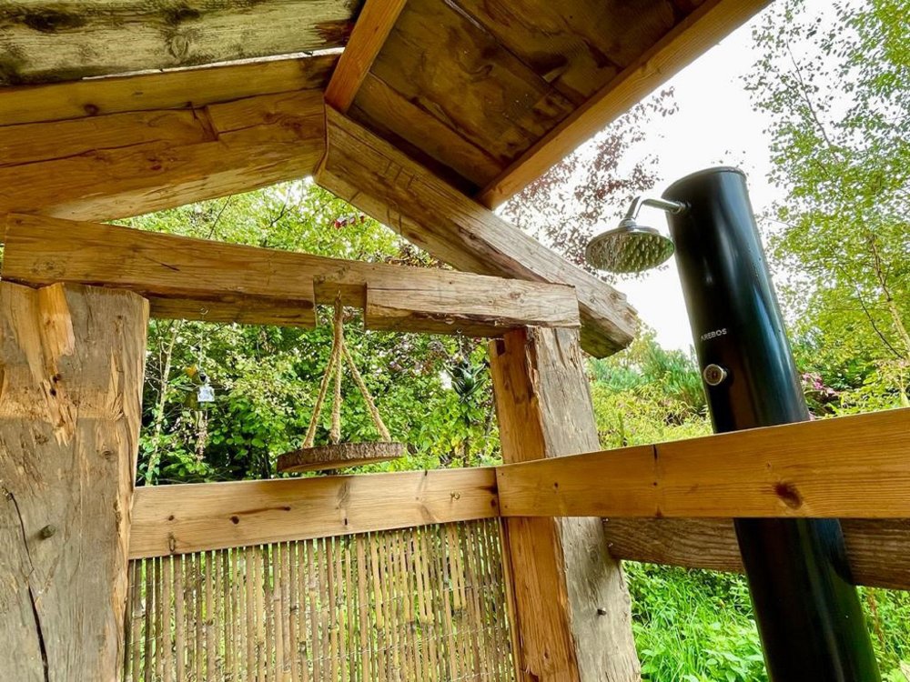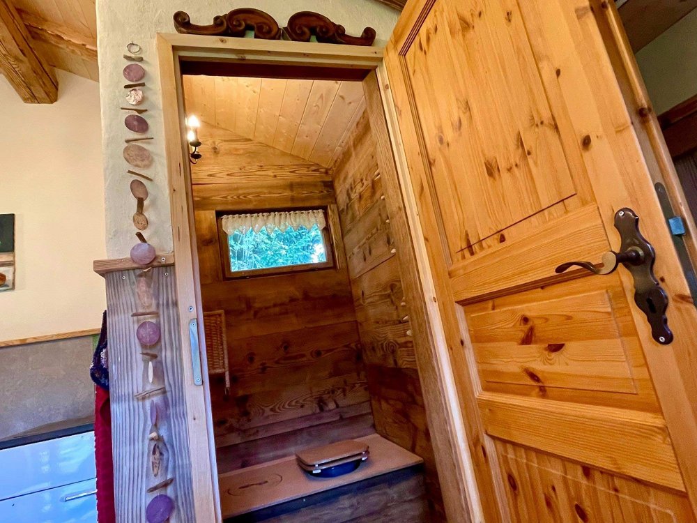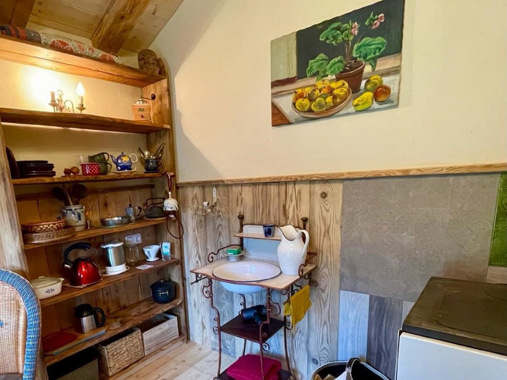 Die Auszeithütte ist wie ein modern gebautes Passiv-Biohaus aufgebaut und gut isoliert. Sie wurde aus 100-jährigem Holz gebaut und mit Lehm ausgekleidet. Innen gibt es einen alten Holzofen, der zum Heizen und einfachen Kochen geeignet ist. Es gibt einen antiken Waschtisch ohne fließendes Wasser. Innen ist auch eine separate Komposttoilette (gemäß umweltfreundlicher Aspekte) installiert. Alles, was wir von uns geben, wird über Kompostierung der Natur wieder zurückgegeben. Eine Outdoor-Solardusche ergänzt die auf Minimalismus ausgerichtete Hütte.