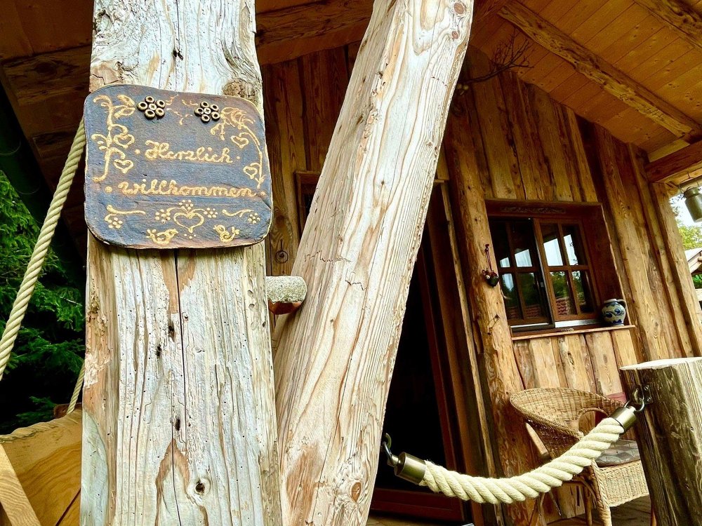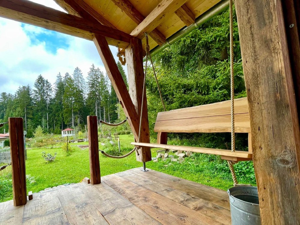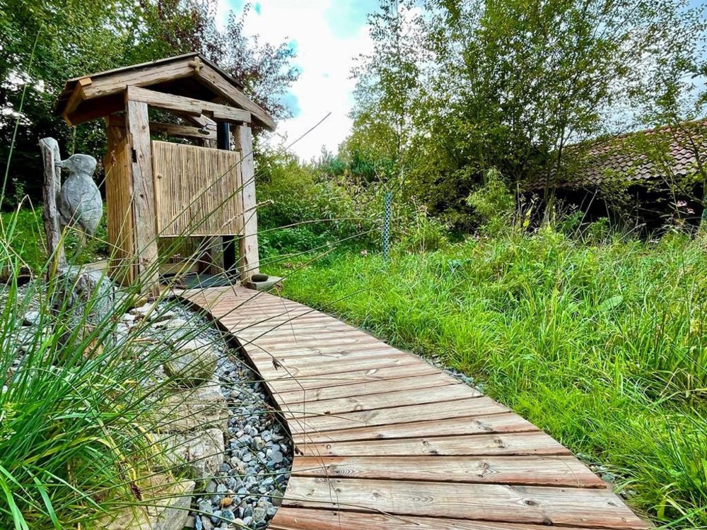 Ein auf 1,20 Meter Breite ausziehbares Sofa dient auch als Bett. Es ist zwar Strom vorhanden, aber eine Beleuchtung durch Kerzenlicht verleiht der Hütte einen noch ursprünglicheren Charakter. Die überdachte Terrasse lädt zum Verweilen an frischer Luft ein. Die Schaukelbank beruhigt das Gemüt und fördert gute Inspirationen. Im großzügigen Garten laden diverse Plätze zum Verweilen ein. Hier ist auch ein ursprünglicher Gartenteich mit Fischen vorhanden. Ein schön angelegter Barfußweg befindet sich direkt vor der Hütte. Unmittelbar hinter der Auszeithütte öffnet sich ein Waldstück, in dem man sich verlieren und wiederfinden kann. Weitere Ausstattungsmerkmale finden sich auf den Bildern zur Auszeithütte.
