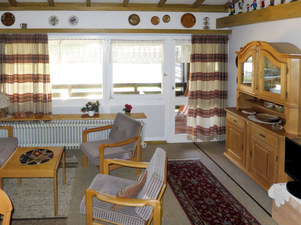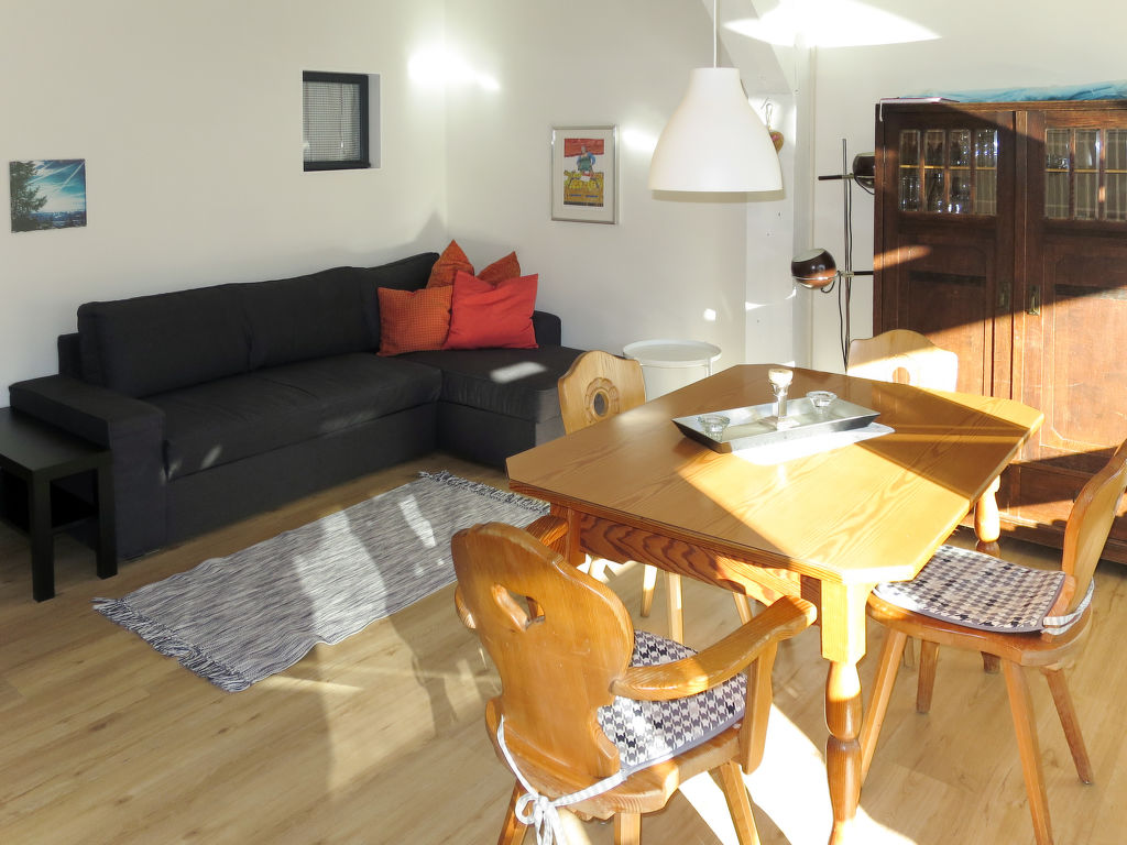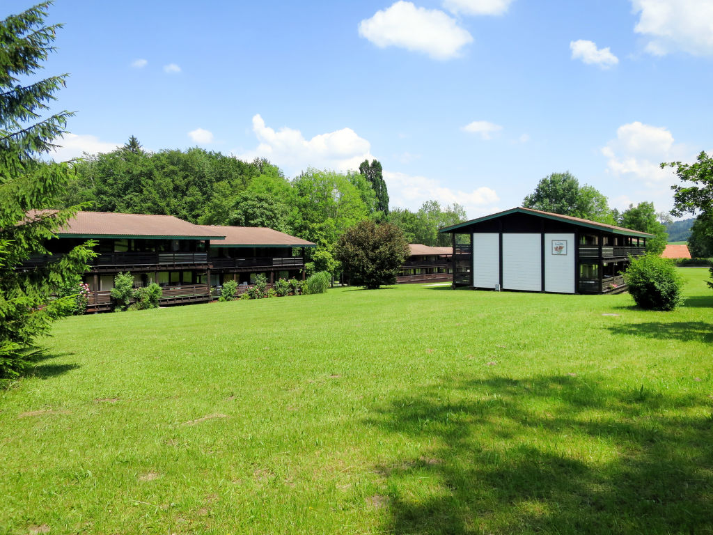 Inzell, 1-Zimmer-Wohnung 42 m2. Objekt geeignet für 2 Erwachsene + 2 Kinder. Zweckmässig und mit viel Holz eingerichtet: Wohn-/Schlafzimmer mit 1 Doppeldiwanbett, Esstisch und Sat-TV. Ausgang zum Balkon. Schlafnische mit 2 Betten. Kleine Kochnische im Eingang (2 Kochplatten, elektrische Kaffeemaschine). Bad/WC oder Dusche/WC. Heizung. Balkon. Balkonmöbel. Bitte beachten: Nichtraucher-Unterkunft. Maximal 1 Haustier/Hund erlaubt. Rauchmelder. Internetzugang nur im Rezeptionsbereich der Anlage. Anstelle eines abgeschlossenen Schlafzimmers befinden sich manche Schlafplätze in einem offenen Bereich (Galerie, Nische etc.).