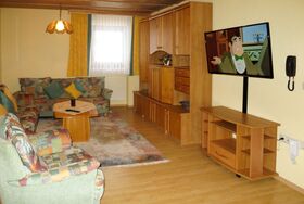 2-Zimmer-Wohnung 84 m2, im erhöhten Erdgeschoss. Zweckmässig eingerichtet: Wohn-/Schlafzimmer mit 1 Bett und Sat-TV (Flachbildschirm). Ausgang zum Balkon. 1 Zimmer mit 1 Bett, 1 Doppelbett und Bad/Dusche/WC. Küche (Backofen, Geschirrspüler, 4 Glaskeramikplatten, Toaster, Wasserkocher, Mikrowelle, elektrische Kaffeemaschine) mit Essecke. Holzheizung. Balkon. Balkonmöbel. Panoramasicht. Zur Verfügung: Internet (Wireless LAN, gratis). Bitte beachten: Nichtraucher-Unterkunft. Maximal 1 Haustier/Hund erlaubt. Eigener Eingang, Rauchmelder. Vom Wohnraum über 2 Stufen ins Schafzimmer.