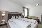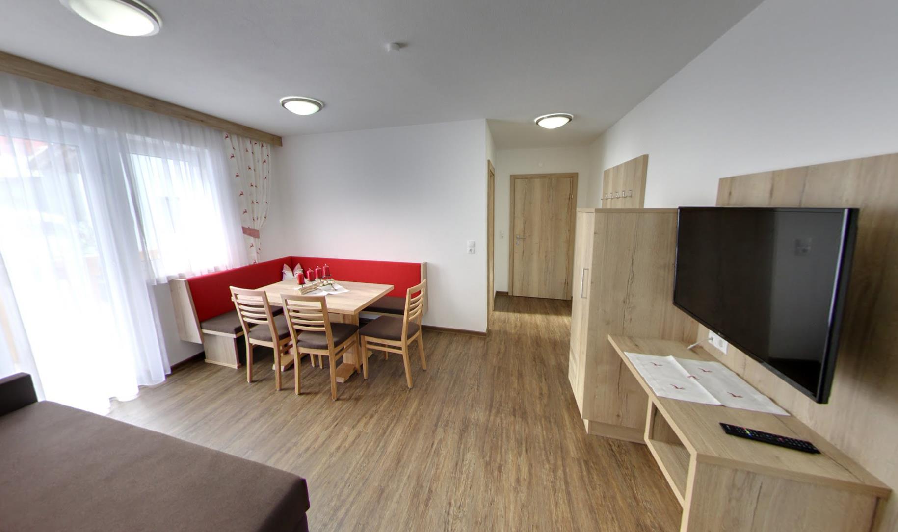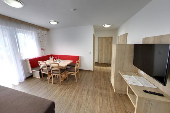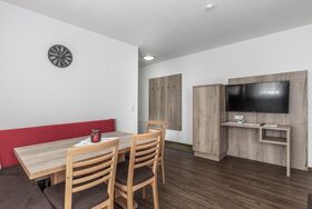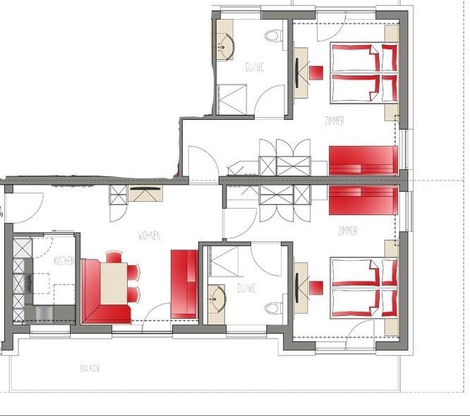 Appartement (ca. 80 m²) mit zwei Doppelzimmer mit jeweils einer Zusatzcouch für 1 weitere Person, großer Flat-TV, Balkon, und W-Lan. 2 Badezimmer mit Dusche, WC, Föhn. Ein Vorraum, abgetrennte Küche und separater Wohnraum mit Essbereich, großer Flat-TV und Balkon. Die Küche ist mit Herd, Backrohr, Geschirr, Spülmaschine, Kaffeemaschine mit Tabs,.. ausgestattet. Bei einer Belegung mit 2 Personen steht nur 1 Doppelzimmer zur verfügung.
