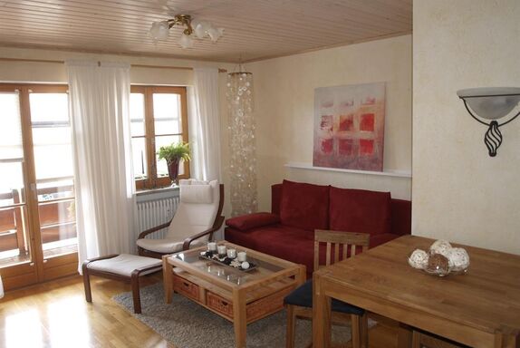 Moderne zwei Zimmer, Küche, Bad Ferienwohnung mit großem Balkon und Garage im Herzen von Oberstaufen.