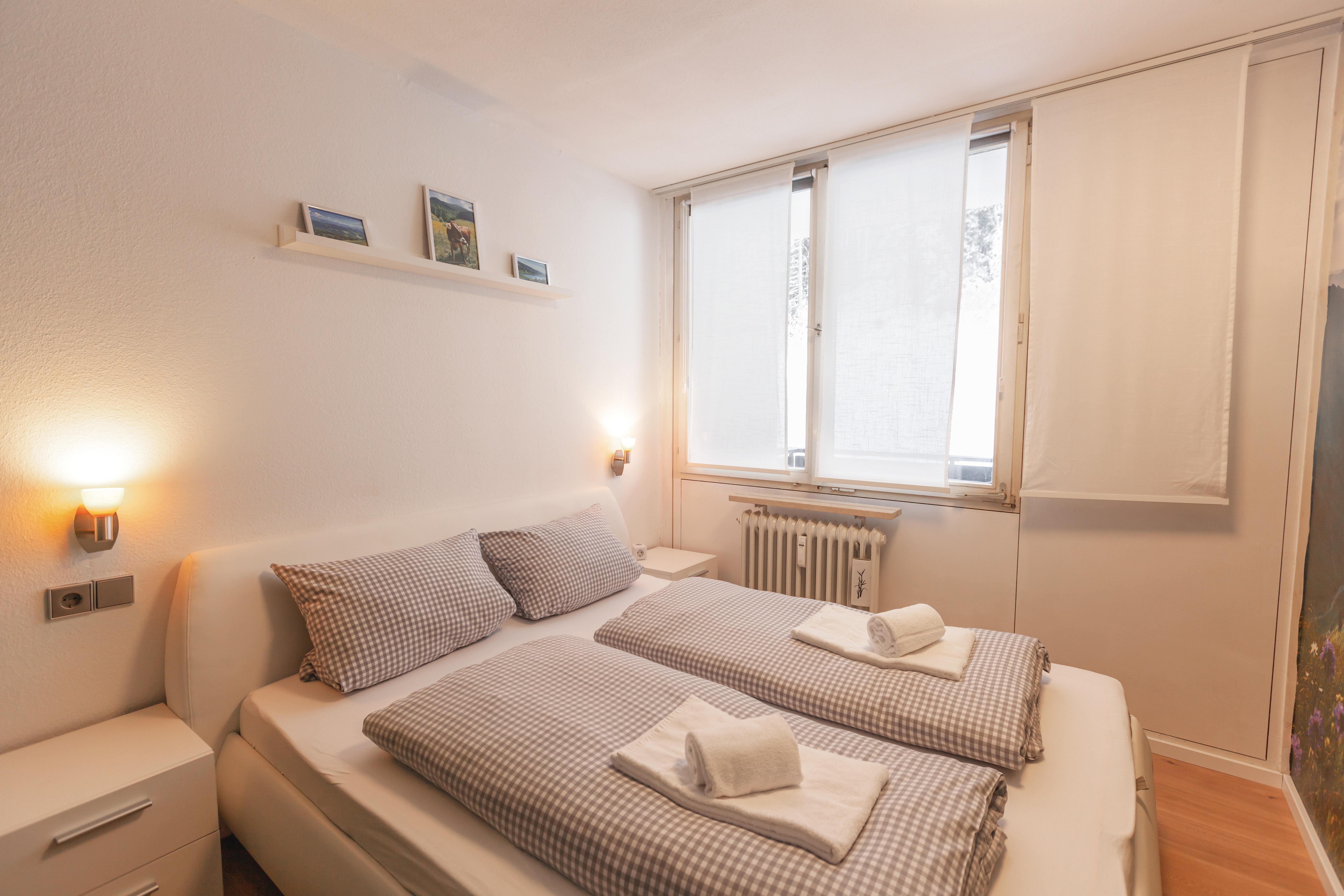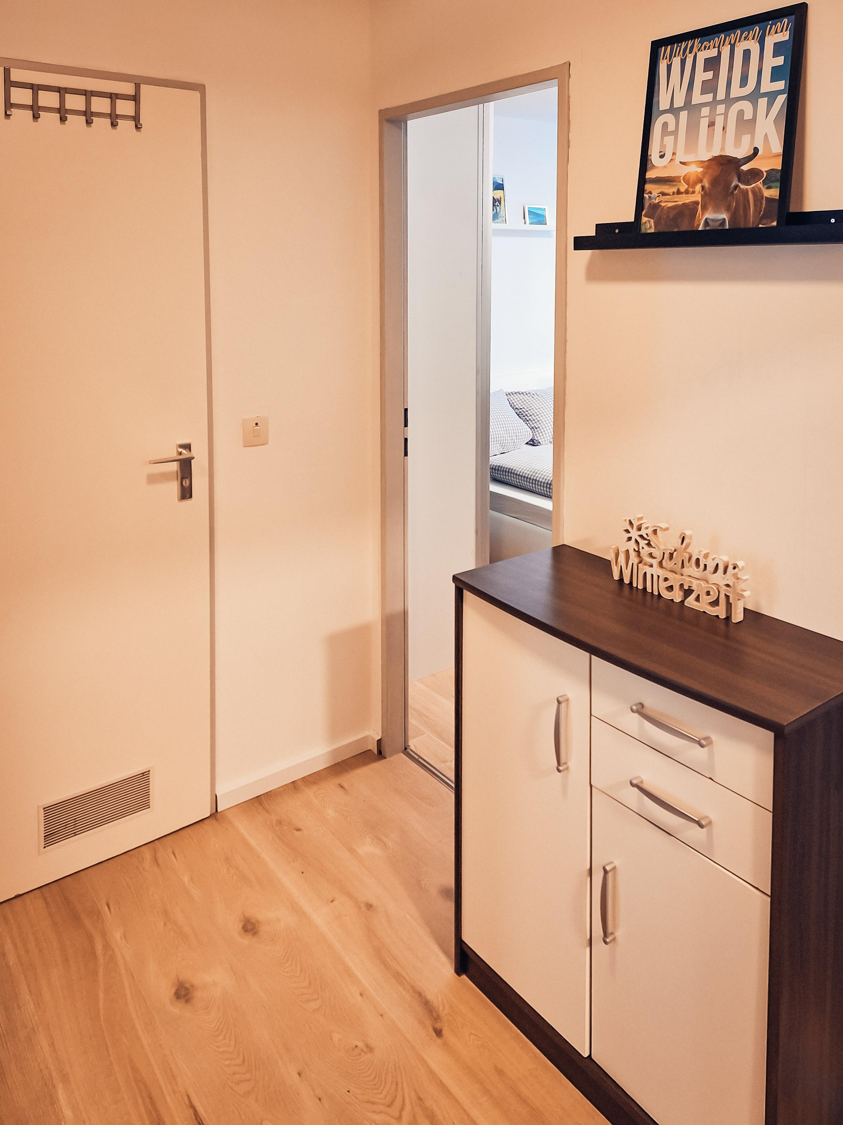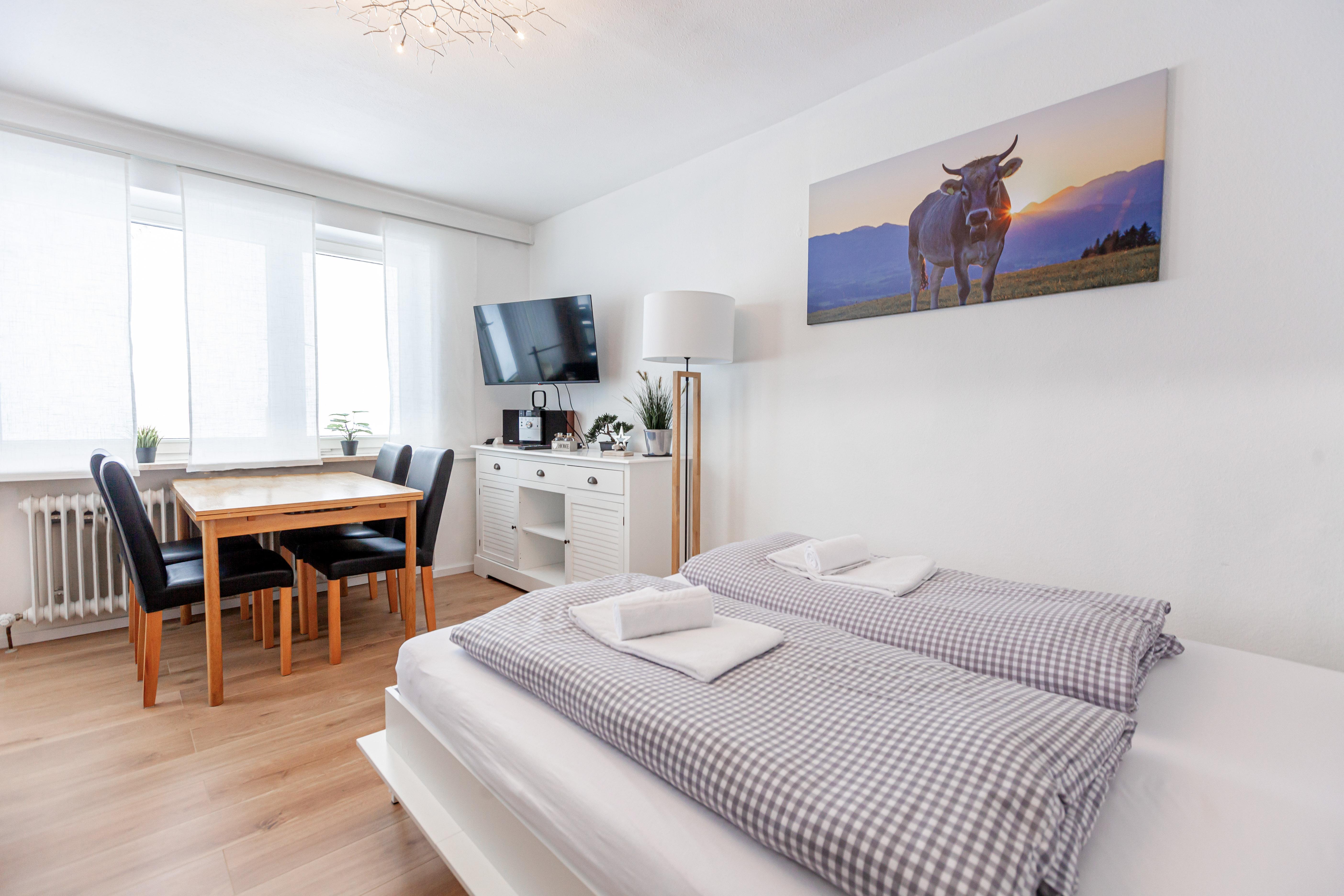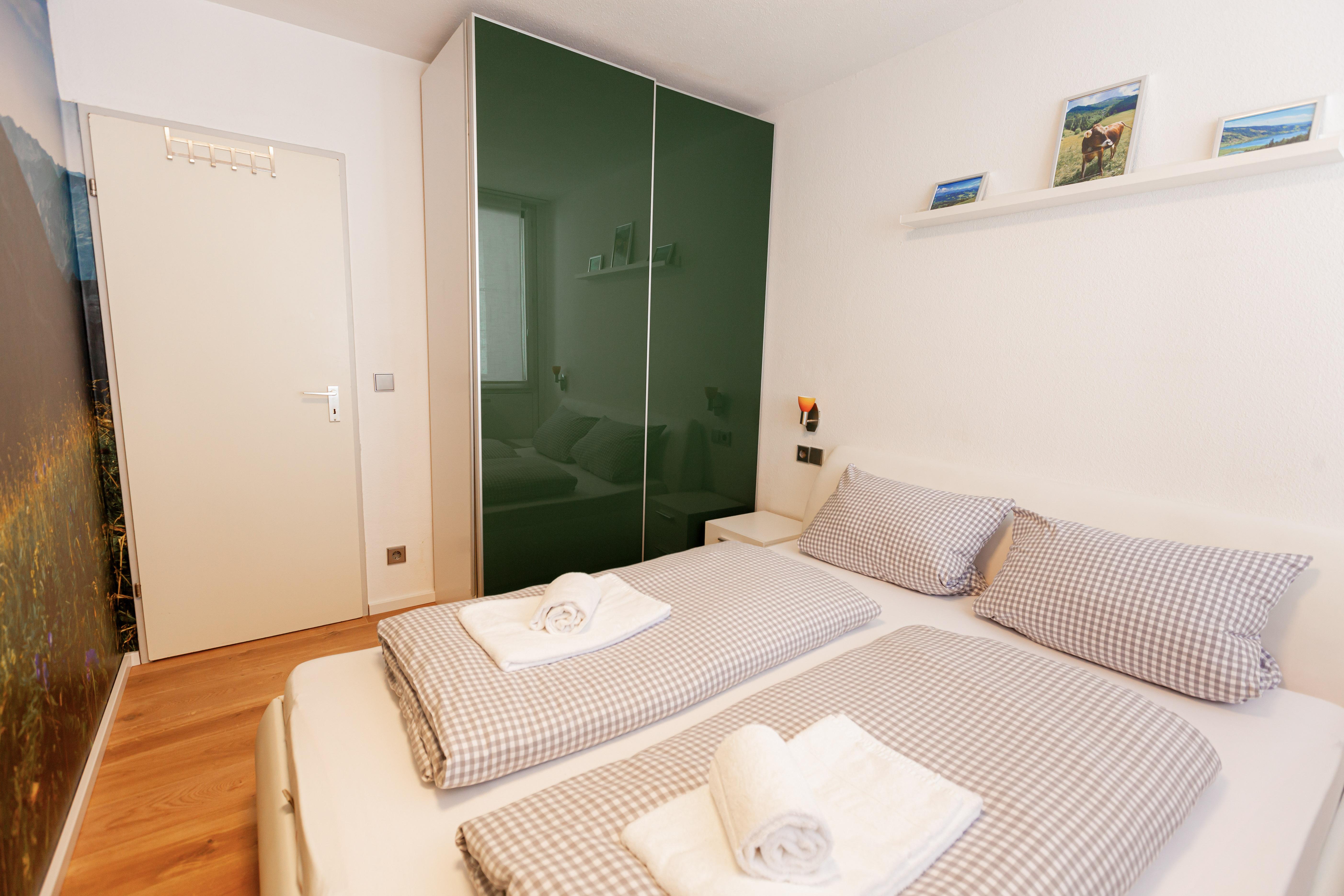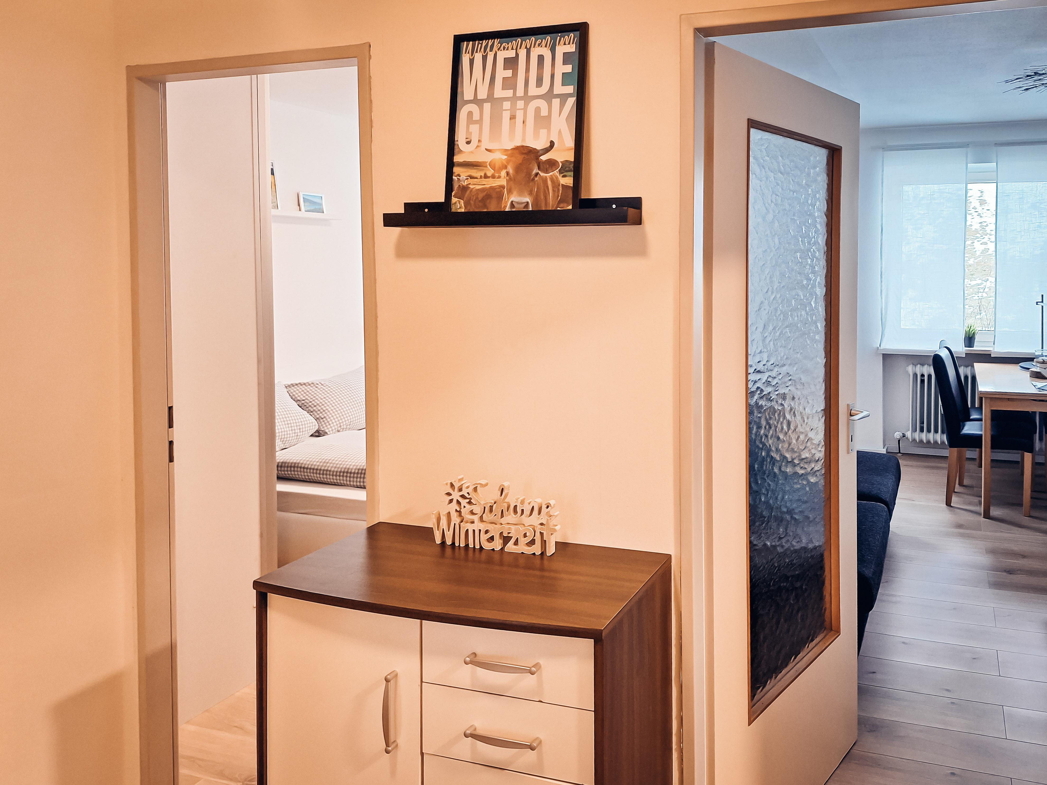 Die Ferienwohnung in Oberstaufen verfügt über 45 qm Wohnfläche mit einem geschlossenen Schlafzimmer mit einem Doppelbett für 2 Personen. Das Wohnzimmer verfügt über ein Schrankbett für 2 Personen, Sofa, TV und eine gemütliche Essecke. Die Küche des Apartments bietet Kühlschrank, Gefrierfach, Kochherd, Backofen, Wasserkocher, Kaffeemaschine und ausreichend Geschirr. Außerdem sind 1 Badezimmer mit Waschtisch und Dampfdusche, sowie ein WC und 1 Balkon mit Sitzmöbeln vorhanden. Ein Garagenplatz für Ihren PKW befindet sich im Haus.