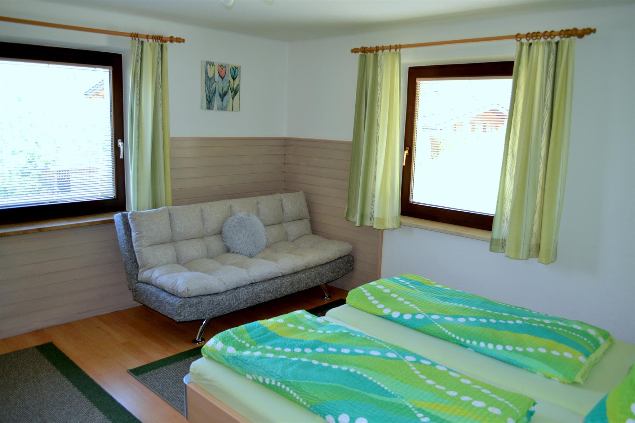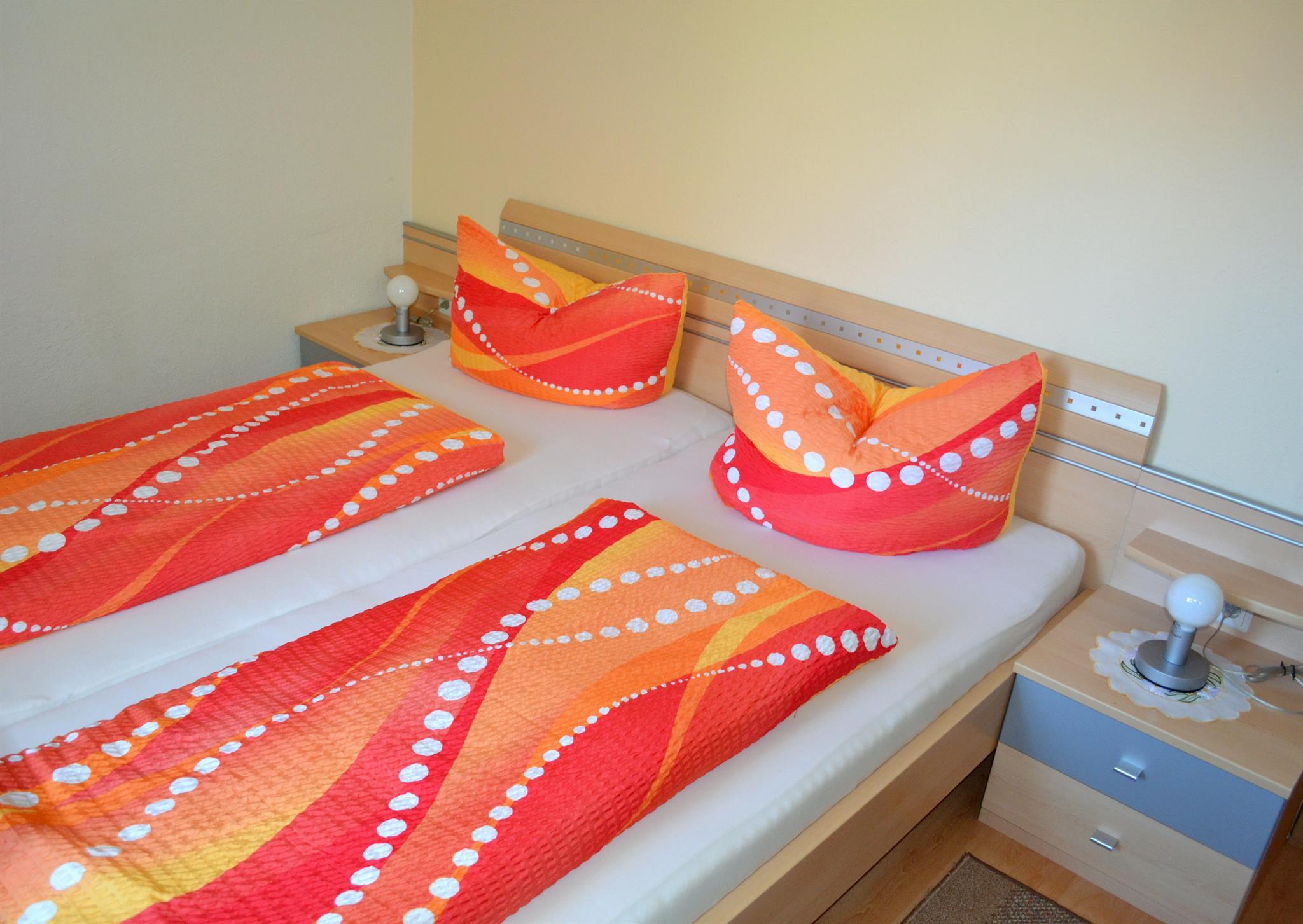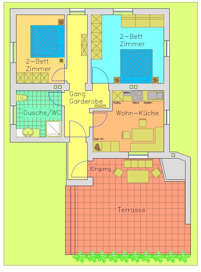 Große Ferienwohnung für 2 - 4 Personen im Erdgeschoss mit ca. 70 m² in ruhiger Lage: eigener Eingang; große Sonnenterrasse mit Gartenmöbel und Markise; Parkplatz direkt vor dem Haus; Vorraum mit Garderobe; 2 Doppelzimmer; Wohnküche mit Essecke und Sat-TV komplett ausgestattet mit: Geschirrspüler, Mikrowelle, Cerankochfeld, Backofen, Kaffemaschine, Wasserkocher uvm.; Badezimmer mit Dusche und WC;