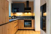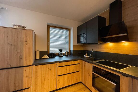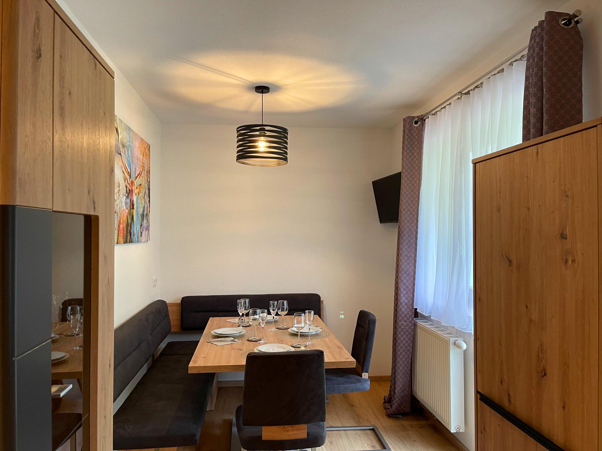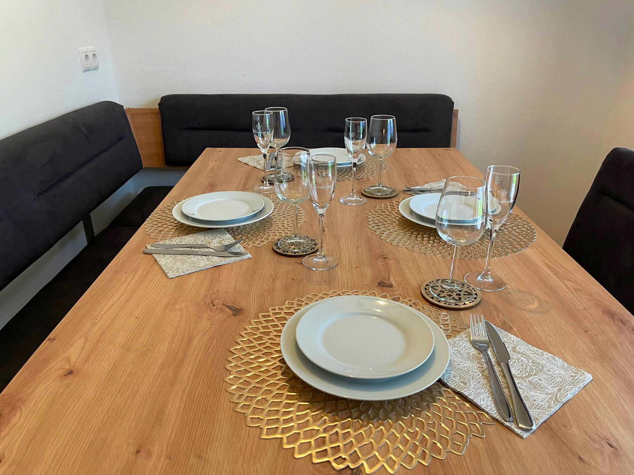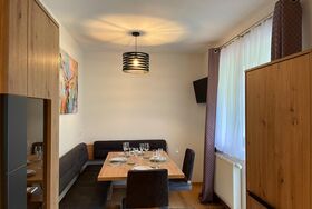 Im Wohnbereich befinden sich eine voll ausgestattete Küche und ein Essbereich.
