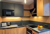 Im Wohnbereich befinden sich ein großes Schlaf Sofa, eine voll ausgestattete Küche und ein Essbereich.